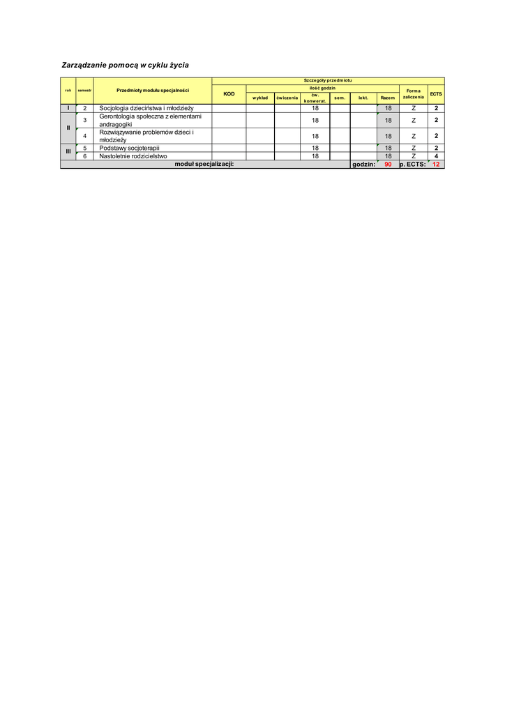 Zarządzanie pomocą w cyklu życia Szczegóły przedmiotu rok I semestr 2 3 II 4 III 5 6 Przedmioty modułu specjalności ilość godzin KOD Socjologia dzieciństwa i młodzieży Gerontologia społeczna z elementami andragogiki Rozwiązywanie problemów dzieci i młodzieży Podstawy socjoterapii Nastoletnie rodzicielstwo moduł specjalizacji: w ykład ćw iczenia Razem Form a zaliczenia ECTS 18 18 Z 2 18 18 Z 2 18 18 Z 2 18 18 18 18 90 Z Z p. ECTS: 2 4 12 ćw . konw erat. sem. lek t. godzin: