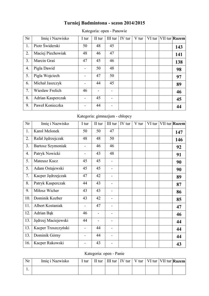 Turniej Badmintona - sezon 2014/2015 Kategoria: open - Panowie Nr Imię i Nazwisko I tur II tur III tur IV tur V tur VI tur VII tur Razem 1. Piotr Świderski 50 48 45 143 2. Maciej Piechowiak 48 46 47 141 3. Marcin Graś 47 45 46 138 4. Pigla Dawid - 50 48 98 5. Pigla Wojciech - 47 50 97 6. Michał Jaszczyk - 44 45 89 7. Wiesław Frelich 46 - - 46 8. Adrian Kasperczak - 45 - 45 9. Paweł Konieczka - 44 - 44 Kategoria: gimnazjum - chłopcy Nr Imię i Nazwisko I tur II tur III tur IV tur V tur VI tur VII tur Razem 1. Karol Melonek 50 50 47 147 2. Rafał Jędrzejczak 48 48 50 146 3. Bartosz Szymoniak - 46 46 92 4. Patryk Nowicki - 43 48 91 5. Mateusz Kucz 45 45 - 90 5. Adam Ostajewski 45 45 - 90 7. Kacper Jędrzejczak 47 42 - 89 8. Patryk Kasperczak 44 43 - 87 9. Miłosz Wicher 43 43 - 86 10. Dominik Kozber 43 42 - 85 11. Albert Kostaniak - 47 - 47 12. Adrian Bąk 46 - - 46 13. Jędrzej Maciejewski 44 - - 44 13. Kacper Troszczyński - 44 - 44 13. Dominik Górny - 44 - 44 16. Kacper Rakowski - 43 - 43 Kategoria: open - Panie Nr 1. Imię i Nazwisko I tur II tur III tur IV tur V tur VI tur VII tur Razem Nr Kategoria: szkoła podstawowa - dziewczęta Imię i Nazwisko I tur II tur III tur IV tur V tur VI tur VII tur Razem 1. Aleksandra Minge 50 50 50 150 2. Wiktoria Frelich 47 47 47 141 3. Matylda Wesoła 46 45 45 136 4. Ania Michałowska 43 45 45 133 5. Donata Szymoniak 45 44 44 133 6. Katarzyna Geisler 45 42 44 131 7. Wiktoria Górecka 43 44 44 131 8. Amelia Pietryka 44 44 42 130 9. Maja Kargacz 44 42 43 129 43 41 42 126 - 48 46 94 12. Ewelina Matyjasik 45 - 48 93 13. Magdalena Wyrwał - 46 45 91 14. Oliwia Kostrzewska 45 - 45 90 15. Julia Mańczak - 45 44 89 16. Weronika Szała 44 42 - 86 16. Julia Pietryka 44 42 - 86 - 44 42 86 19. Tatiana Fornalik 43 42 - 85 19. Kasia Kaczmarek 42 43 - 85 19. Oliwia Gorońska - 43 42 85 42 - 43 85 - 42 43 85 42 42 - 84 25. Angelika Nalewajk - 42 41 83 26. Zosia Kaźmierczak 48 - - 48 27. Natalia Kawa - 45 - 45 28. Zuzana Jędrzejczak - 43 - 43 28. Zosia Wojtkowiak - 43 - 43 28. Aleksandra Przewoźna - - 43 43 10. Karolina Kurnikowska 11. Weronika Batura 16. Wiktoria Kozłowska 19. Nicola Wojtkowiak 19. Julia Kozłowska 24. Ania Kiersztan Nr Imię i Nazwisko Kategoria: szkoła podstawowa - chłopcy I tur II tur III tur IV tur V tur VI tur VII tur Razem 1. Jakub Łopata 50 48 50 148 2. Mateusz Jarnut 48 47 48 143 3. Dawid Jarnut 47 45 46 138 4. Kacper Jabłoński 45 46 45 136 5. Gracjan Kamiński 45 43 47 135 6. Jacek Górny 45 44 45 134 7. Wojtek Tobys 44 43 44 131 8. Kamil Wachowski 42 44 44 130 9. Miłosz Graś 43 43 43 129 10. Ksawier Melonek 43 42 42 127 11. Mikołaj Haładuda 46 45 - 91 12. Piotr Sobkowiak 45 45 - 90 13. Patryk Haładuda 43 44 - 87 13. Michał Bzdęga 44 - 43 87 15. Dawid Okrent 42 44 - 86 15. Błażej Nowak 44 - 42 86 17. Maksymilian Pawlik 43 - 42 85 18. Nikodem Hupało - 50 - 50 19. Maksymilian Wiśniewski - 45 - 45 20. Kacper Piechota 44 - - 44 21. Mikołaj Wyrwał - 43 - 43 21. Mateusz Kaczmarek - - 43 43 23. Filip Grabowski 42 - - 42 23. Łukasz Tobis 42 - - 42 - - 42 42 23. Ksawier Nowaczyk Kategoria: dziewczęta i chłopcy do klasy III szkoły podstawowej Nr Imię i Nazwisko 1. Maciej Kasztelan 2. Patrycja Frelich I tur 50 48 II tur III tur IV tur V tur VI tur VII tur Razem 50 50 150 48 48 144 Kategoria: gimnazjum - dziewczęta Nr Imię i Nazwisko I tur II tur III tur IV tur V tur VI tur VII tur Razem 1. Anna Jędrzejczak 50 47 50 147 2. Martyna Wojtkowiak 48 44 - 92 3. Paulina Knop 47 48 - 95 Adrianna Ruta - 50 - 50 Patrycja Kurpisz - 46 - 46 Weronika Pakuła - 45 - 45 Kornelia Hupało - 45 - 45 Zuzanna Troszczyńska - 44 - 44 49 uczestników 88 pojedynków
