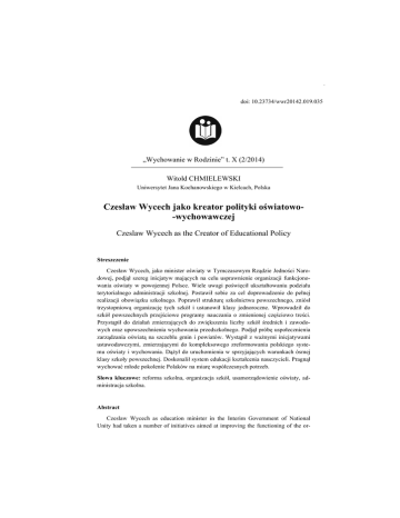 Czesław Wycech jako kreator polityki oświatowo-wychowawczej 19 doi: 10.23734/wwr20142.019.035 „Wychowanie w Rodzinie” t. X (2/2014) Witold CHMIELEWSKI Uniwersytet Jana Kochanowskiego w Kielcach, Polska Czesław Wycech jako kreator polityki oświatowo-wychowawczej Czeslaw Wycech as the Creator of Educational Policy Streszczenie Czesław Wycech, jako minister oświaty w Tymczasowym Rządzie Jedności Narodowej, podjął szereg inicjatyw mających na celu usprawnienie organizacji funkcjonowania oświaty w powojennej Polsce. Wiele uwagi poświęcił ukształtowaniu podziału terytorialnego administracji szkolnej. Postawił sobie za cel doprowadzenie do pełnej realizacji obowiązku szkolnego. Poprawił strukturę szkolnictwa powszechnego, zniósł trzystopniową organizację tych szkół i ustanowił klasy jednoroczne. Wprowadził do szkół powszechnych przejściowe programy nauczania o zmienionej częściowo treści. Przystąpił do działań zmierzających do zwiększenia liczby szkół średnich i zawodowych oraz upowszechnienia wychowania przedszkolnego. Podjął próbę uspołecznienia zarządzania oświatą na szczeblu gmin i powiatów. Wystąpił z ważnymi inicjatywami ustawodawczymi, zmierzającymi do kompleksowego zreformowania polskiego systemu oświaty i wychowania. Dążył do uruchomienia w sprzyjających warunkach ósmej klasy szkoły powszechnej. Doskonalił system edukacji kształcenia nauczycieli. Pragnął wychować młode pokolenie Polaków na miarę współczesnych potrzeb. Słowa kluczowe: reforma szkolna, organizacja szkół, usamorządowienie oświaty, administracja szkolna. Abstract Czeslaw Wycech as education minister in the Interim Government of National Unity had taken a number of initiatives aimed at improving the functioning of the or- 20 Witold CHMIELEWSKI ganization of education in post-war Poland. He devoted much attention to shaping the territorial division of the school administration. He set himself a target of fully implementing compulsory education. He improved the structure of elementary education, abolished the three-level organization of these schools and established one-year classes. He introduced into elementary schools transitory curricula with partially revised content. He joined the efforts to increase the number of secondary and vocational schools and to popularize pre-school education. He attempted to organise educational management at the level of districts and counties. He came up with some important legislative initiatives, aimed at a comprehensive reform of the Polish system of education. He aspired to open under favourable conditions, the eighth grade of elementary school. He kept improving the teachers` training system in Poland. He wanted to educate the young generation of Poles according to contemporary needs. Keywords: school reform, organization of schools, self-governing education, school administration. Czesław Wycech zajmuje ważne miejsce w historii polskiej oświaty. Był z nią mocno związany niemal przez całe swoje życie zawodowe. Zajmował różne stanowiska i piastował odpowiedzialne funkcje. W okresie międzywojennym był nauczycielem w szkołach powszechnych w Małożewie, Wilczogębach, Węgrowie, Włodawie i Chojnicach. Od początku swej pracy zawodowej związał się z ruchem ludowym i młodzieżowym oraz aktywnie działał w Związku Polskiego Nauczycielstwa Szkół Powszechnych, a następnie Związku Nauczycielstwa Polskiego (był między innymi prezesem Zarządu Okręgu tych związków w Lublinie). Przez wiele lat był członkiem Zarządu Głównego ZNP w Warszawie1. Po wybuchu drugiej wojny światowej wszedł w październiku 1939 roku w skład tzw. „centralnej piątki” Tajnej Organizacji Nauczycielskiej (ten konspiracyjny kryptonim przyjął na czas okupacji Związek Nauczycielstwa Polskiego), która kierowała pracą związku podczas okupacji. Reprezentował TON w Międzystowarzyszeniowej Komisji Porozumiewawczej Organizacji i Stowarzyszeń Nauczycielskich, której zadaniem miało być tworzenie i koordynowanie tajnego nauczania i udzielanie pomocy nauczycielom2. Najważniejszym jednak zadaniem realizowanym przez niego w czasie okupacji było koordynowanie pracą Departamentu Oświaty i Kultury Delegatury Rządu Rzeczypospolitej Polskiej na Kraj. Na tym stanowisku w wydatnym stopniu przyczynił się do rozwoju na dużą skalę tajnego nauczania. Kierowany przez niego DOiK nawiązał kontakt z polskim środowiskiem oświatowym w Wielkiej Brytanii i zajął stanowisko w sprawie ideału wychowawczego oraz kierunku 1 2 B. Grześ (red.), 100 lat ZNP. Ludzie, fakty, sprawy, wydarzenia, Wydawnictwo Pedagogiczne ZNP Spółka z o.o., Warszawa 2005, s. 469. Tenże, Związek Nauczycielstwa Polskiego od korzeni po współczesność, Wydawnictwo i Zakład Poligrafii Instytutu Technologii Eksploatacji, Radom 2000, s. 74. Czesław Wycech jako kreator polityki oświatowo-wychowawczej 21 rozwoju szkolnictwa zawartego w przemówieniu księdza Zygmunta Kaczyńskiego – ministra wyznań religijnych i oświecenia publicznego w rządzie Stanisława Mikołajczyka na posiedzeniu Rady Narodowej Rzeczypospolitej Polskiej w Londynie 17 lutego 1944 r.3 W styczniu 1945 roku bliski współpracownik Wycecha w DoiK, Wacław Schayer, spotkał się w Krakowie z ministrem oświaty w Rządzie Tymczasowym – Stanisławem Skrzeszewskim. W trakcie rozmowy przedstawiciel podziemnych władz oświatowych poinformował ministra o organizacji i pracy DOiK4. Związek Nauczycielstwa Polskiego wznowił jawną działalność 6 lutego. Organizacja nauczycielska określiła swoją pozycję wobec rządu polskiego w Londynie i podjęła rozmowy na temat własnej działalności w wolnej Polsce z Międzypartyjną Komisją Nauczycielską, zdominowaną przez Polską Partię Robotniczą. Po rozmowie delegacji ZNP ze Stanisławem Skrzeszewskim 13 kwietnia 1945 r. ukonstytuował się Zarząd Główny związku. Jego prezesem został Wycech. Na tym stanowisk