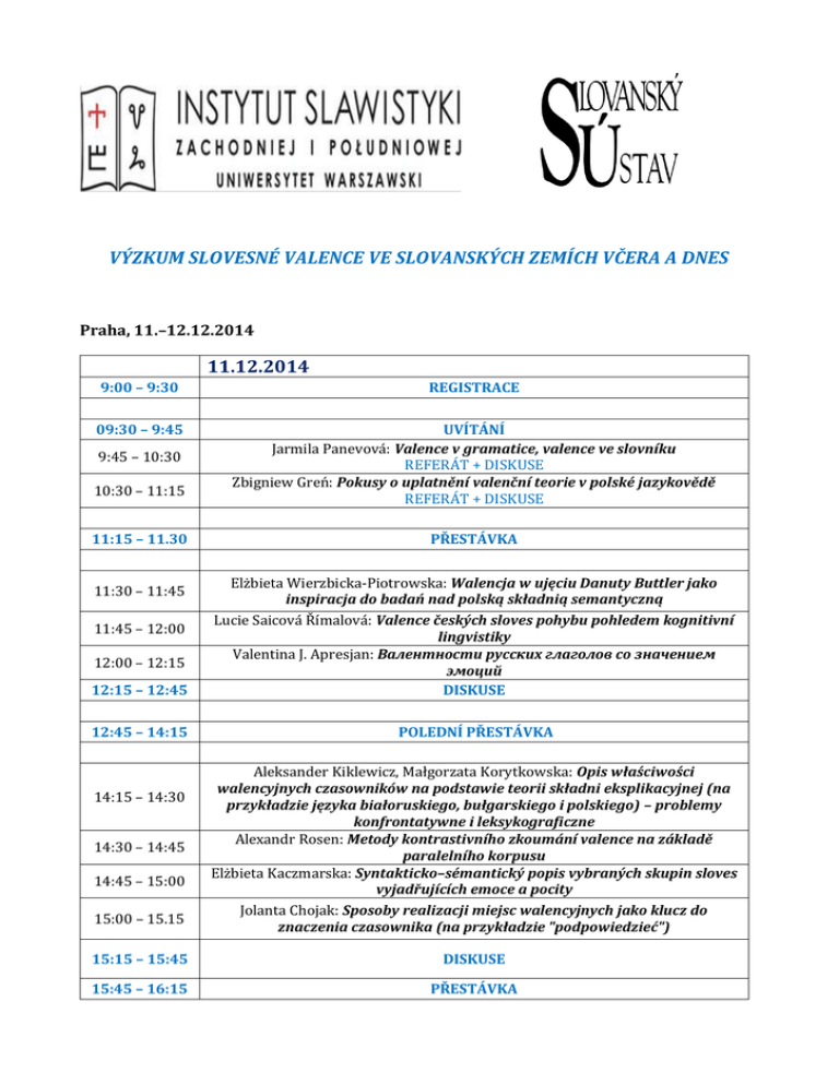 VÝZKUM SLOVESNÉ VALENCE VE SLOVANSKÝCH ZEMÍCH VČERA A DNES Praha, 11.–12.12.2014 11.12.2014 9:00 – 9:30 REGISTRACE 09:30 – 9:45 UVÍTÁNÍ Jarmila Panevová: Valence v gramatice, valence ve slovníku REFERÁT + DISKUSE Zbigniew Greń: Pokusy o uplatnění valenční teorie v polské jazykovědě REFERÁT + DISKUSE 9:45 – 10:30 10:30 – 11:15 11:15 – 11.30 PŘESTÁVKA 12:15 – 12:45 Elżbieta Wierzbicka-Piotrowska: Walencja w ujęciu Danuty Buttler jako inspiracja do badań nad polską składnią semantyczną Lucie Saicová Římalová: Valence českých sloves pohybu pohledem kognitivní lingvistiky Valentina J. Apresjan: Валентности русских глаголов со значением эмоций DISKUSE 12:45 – 14:15 POLEDNÍ PŘESTÁVKA 11:30 – 11:45 11:45 – 12:00 12:00 – 12:15 14:15 – 14:30 14:30 – 14:45 14:45 – 15:00 15:00 – 15.15 Aleksander Kiklewicz, Małgorzata Korytkowska: Opis właściwości walencyjnych czasowników na podstawie teorii składni eksplikacyjnej (na przykładzie języka białoruskiego, bułgarskiego i polskiego) – problemy konfrontatywne i leksykograficzne Alexandr Rosen: Metody kontrastivního zkoumání valence na základě paralelního korpusu Elżbieta Kaczmarska: Syntakticko–sémantický popis vybraných skupin sloves vyjadřujících emoce a pocity Jolanta Chojak: Sposoby realizacji miejsc walencyjnych jako klucz do znaczenia czasownika (na przykładzie "podpowiedzieć") 15:15 – 15:45 DISKUSE 15:45 – 16:15 PŘESTÁVKA 16:15 – 16:30 16:30 – 16:45 16:45 – 17:00 Marta Zuchowicz: Walencja polskich i rosyjskich czasowników z pola semantycznego pamięci Ivana Brač, Ivana Matas Ivanković: Психологические глаголы в хорватском и русском языках Zofia Zaron, Dorota Kruk: Walencja czasowników marzyć, śnić, roić sobie, wyobrażać sobie w diachronii i synchronii 17:00 – 17:15 Marzena Stępień: Walencja czasowników a teoria jednostek języka Andrzeja Bogusławskiego. Na przykładzie czasowników drwić, kpić, żartować 17:15 – 17:45 DISKUSE 12.12.2014 9:00 – 9:15 Andreja Žele: Нa пересечении обязательной и факультативной валентности в словенском языке 9:15 – 9:30 9:30 – 9:45 9:45 – 10:15 Václava Ketnerová: Lexikografický popis komplexních predikátů v češtině Vladimír Petkevič: Genitivní valence českých sloves DISKUSE 10:15 – 10:45 PŘESTÁVKA 11:45 – 12:15 Elżbieta Hajnicz, Adam Przepiórkowski, Agnieszka Patejuk, Marcin Woliński: Walenty: nowy składniowo–semantyczny słownik walencyjny polskich predykatów Matea Birtić, Bruno Nahod: An outline of the online valency dictionary of Croatian verbs Tomislava Bošnjak Botica, Ivana Oraić Rabušić: Croatian vs Czech model of a valency dictionary Martina Ivanová, Miroslava Kyseľová: Valenčný slovník slovenských slovies na korpusovom základe (teoreticko–metodologické východiská, problémy, výsledky výskumu) DISKUSE 12:15 – 13:45 POLEDNÍ PŘESTÁVKA 13:45 – 14:00 Hana Skoumalová: Slovníková pravidla pro využití slovníku Vallex při tvorbě syntakticky anotovaného korpusu 14:00 – 14:15 Markéta Lopatková, Anna Vernerová: Zaplatit nebo dostat zaplaceno: Zachycení diatezí ve Valenčním slovníku českých sloves VALLEX 14:15 – 14:30 Karolína Skwarska, Katarzyna Vaculová, Adriana Filas: Zpracování polských zvratných konstrukcí ve slovníku VALLEX 10:45 – 11:00 11:00 – 11:15 11:15 – 11:30 11:30 – 11:45 14:30 – 15:00 DISKUSE UKONČENÍ KONFERENCE