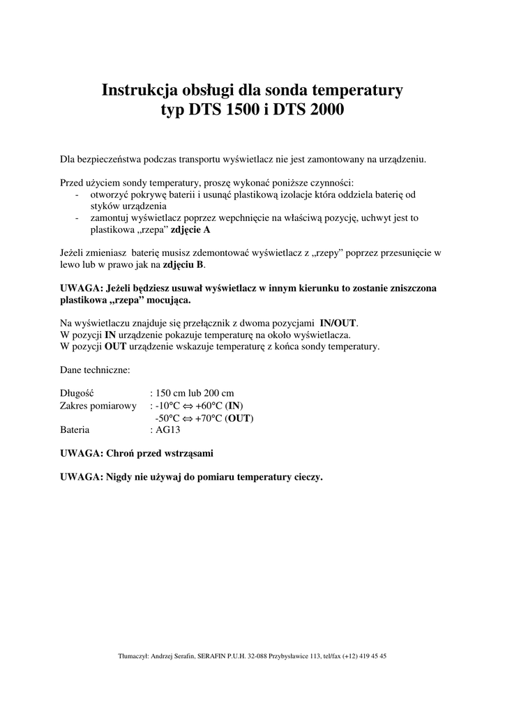 Instrukcja obsługi dla sonda temperatury typ DTS 1500 i DTS 2000 Dla bezpieczeństwa podczas transportu wyświetlacz nie jest zamontowany na urządzeniu. Przed uŜyciem sondy temperatury, proszę wykonać poniŜsze czynności: - otworzyć pokrywę baterii i usunąć plastikową izolacje która oddziela baterię od styków urządzenia - zamontuj wyświetlacz poprzez wepchnięcie na właściwą pozycję, uchwyt jest to plastikowa „rzepa” zdjęcie A JeŜeli zmieniasz baterię musisz zdemontować wyświetlacz z „rzepy” poprzez przesunięcie w lewo lub w prawo jak na zdjęciu B. UWAGA: JeŜeli będziesz usuwał wyświetlacz w innym kierunku to zostanie zniszczona plastikowa „rzepa” mocująca. Na wyświetlaczu znajduje się przełącznik z dwoma pozycjami IN/OUT. W pozycji IN urządzenie pokazuje temperaturę na około wyświetlacza. W pozycji OUT urządzenie wskazuje temperaturę z końca sondy temperatury. Dane techniczne: Długość Zakres pomiarowy Bateria : 150 cm lub 200 cm : -10°C ⇔ +60°C (IN) -50°C ⇔ +70°C (OUT) : AG13 UWAGA: Chroń przed wstrząsami UWAGA: Nigdy nie uŜywaj do pomiaru temperatury cieczy. Tłumaczył: Andrzej Serafin, SERAFIN P.U.H. 32-088 Przybysławice 113, tel/fax (+12) 419 45 45