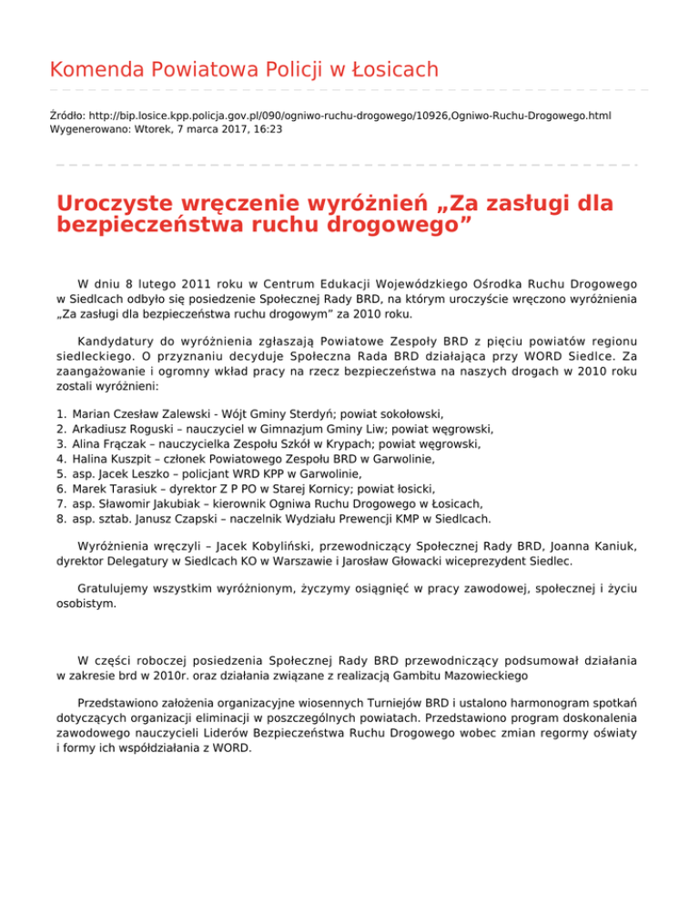 Komenda Powiatowa Policji w Łosicach Źródło: http://bip.losice.kpp.policja.gov.pl/090/ogniwo-ruchu-drogowego/10926,Ogniwo-Ruchu-Drogowego.html Wygenerowano: Wtorek, 7 marca 2017, 16:23 Uroczyste wręczenie wyróżnień „Za zasługi dla bezpieczeństwa ruchu drogowego” W dniu 8 lutego 2011 roku w Centrum Edukacji Wojewódzkiego Ośrodka Ruchu Drogowego w Siedlcach odbyło się posiedzenie Społecznej Rady BRD, na którym uroczyście wręczono wyróżnienia „Za zasługi dla bezpieczeństwa ruchu drogowym” za 2010 roku. Kandydatury do wyróżnienia zgłaszają Powiatowe Zespoły BRD z pięciu powiatów regionu siedleckiego. O przyznaniu decyduje Społeczna Rada BRD działająca przy WORD Siedlce. Za zaangażowanie i ogromny wkład pracy na rzecz bezpieczeństwa na naszych drogach w 2010 roku zostali wyróżnieni: 1. 2. 3. 4. 5. 6. 7. 8. Marian Czesław Zalewski - Wójt Gminy Sterdyń; powiat sokołowski, Arkadiusz Roguski – nauczyciel w Gimnazjum Gminy Liw; powiat węgrowski, Alina Frączak – nauczycielka Zespołu Szkół w Krypach; powiat węgrowski, Halina Kuszpit – członek Powiatowego Zespołu BRD w Garwolinie, asp. Jacek Leszko – policjant WRD KPP w Garwolinie, Marek Tarasiuk – dyrektor Z P PO w Starej Kornicy; powiat łosicki, asp. Sławomir Jakubiak – kierownik Ogniwa Ruchu Drogowego w Łosicach, asp. sztab. Janusz Czapski – naczelnik Wydziału Prewencji KMP w Siedlcach. Wyróżnienia wręczyli – Jacek Kobyliński, przewodniczący Społecznej Rady BRD, Joanna Kaniuk, dyrektor Delegatury w Siedlcach KO w Warszawie i Jarosław Głowacki wiceprezydent Siedlec. Gratulujemy wszystkim wyróżnionym, życzymy osiągnięć w pracy zawodowej, społecznej i życiu osobistym. W części roboczej posiedzenia Społecznej Rady BRD przewodniczący podsumował działania w zakresie brd w 2010r. oraz działania związane z realizacją Gambitu Mazowieckiego Przedstawiono założenia organizacyjne wiosennych Turniejów BRD i ustalono harmonogram spotkań dotyczących organizacji eliminacji w poszczególnych powiatach. Przedstawiono program doskonalenia zawodowego nauczycieli Liderów Bezpieczeństwa Ruchu Drogowego wobec zmian regormy oświaty i formy ich współdziałania z WORD. Metryczka Data publikacji 18.02.2011 Data modyfikacji 05.10.2011 Rejestr zmian Podmiot udostępniający informację: Biuletyn Informacji Publicznej Osoba wytwarzająca/odpowiadająca za informację: asp. Sławomir Jakubiak Osoba udostępniająca informację: asp. Tomasz Zalewski Osoba modyfikująca informację: asp. Tomasz Zalewski