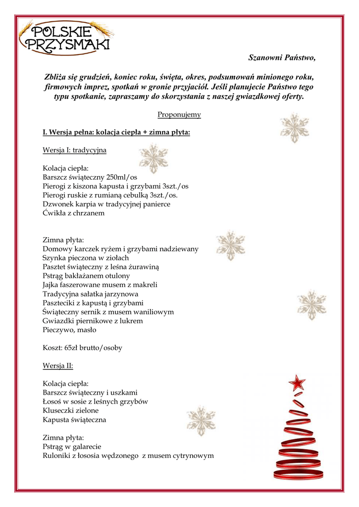 Szanowni Państwo, Zbliża się grudzień, koniec roku, święta, okres, podsumowań minionego roku, firmowych imprez, spotkań w gronie przyjaciół. Jeśli planujecie Państwo tego typu spotkanie, zapraszamy do skorzystania z naszej gwiazdkowej oferty. Proponujemy I. Wersja pełna: kolacja ciepła + zimna płyta: Wersja I: tradycyjna Kolacja ciepła: Barszcz świąteczny 250ml/os Pierogi z kiszona kapusta i grzybami 3szt./os Pierogi ruskie z rumianą cebulką 3szt./os. Dzwonek karpia w tradycyjnej panierce Ćwikła z chrzanem Zimna płyta: Domowy karczek ryżem i grzybami nadziewany Szynka pieczona w ziołach Pasztet świąteczny z leśna żurawiną Pstrąg bakłażanem otulony Jajka faszerowane musem z makreli Tradycyjna sałatka jarzynowa Paszteciki z kapustą i grzybami Świąteczny sernik z musem waniliowym Gwiazdki piernikowe z lukrem Pieczywo, masło Koszt: 65zł brutto/osoby Wersja II: Kolacja ciepła: Barszcz świąteczny i uszkami Łosoś w sosie z leśnych grzybów Kluseczki zielone Kapusta świąteczna Zimna płyta: Pstrąg w galarecie Ruloniki z łososia wędzonego z musem cytrynowym Dorsz w warzywach Sałatka z wędzonego kurczaka i ananasa Pasztet staropolski ze śliwką suszoną Schab ze śliwką i morelami pieczony Jajka faszerowane musem z łososia Sero-mak z musem śliwkowym Miodownik Bakalie świątczne: daktyle, śliwki, morele Pieczywo, masło Koszt: 78 zł brutto/osoby II. Kolacja Wigilijna: Wersja I: Świąteczny barszcz z uszkami Dzwonek karpia na szarym sosie z rodzynkami podany z ziemniakami zapiekanymi z czosnkiem i kapustą z grzybami Tradycyjne makówki Kompot z suszu Koszt: 39zł/osoby Wersja II: Zupa grzybowa z łazankami Filet z łososia z grzybami na gęsto podany na duszonej kapuście z kluseczkami Piernik z bakaliami na delikatnym sosie śliwkowym Kompot z suszu z nutą pomarańczy Koszt: 48zł/os Wersja III: Barszcz czerwony z pierogami z kapustą i grzybami Pstrąg w migdałach/ karp w tradycyjnej panierce Kopytka/ziemniaki zapiekane Kapusta z grochem/warzywa gotowane z masełkiem Pater świątecznych ciast: strucla makowa, sernik, piernik Kompot z suszu z nutą cynamonu Koszt: 53zł/osoby, III. Zimna płyta: Zimna płyta I: 39zł/os Schab ze śliwką i morelami pieczony Szynka pieczona w ziołach Pasztet staropolski żurawiną ochlapany Pstrąg w galarecie Dorsz duszony w warzywach z pomidorami Śledź po chłopsku z cebulą i ogórkiem Pierożki ruskie(3)/ z kapustą i grzybami(3) Jajka musem z łososia nadziewane Sałatka rubinowa Pieczywo, masło Zimna płyta II: 35zł/osoby Filet indyczy morelami faszerowany Karczek grzybami i ryżem nadziewany Karp w galarecie Pater serów żółtych i pleśniowych Śledzik w zalewie słodko-kwaśnej z rodzynkami Roladki z łososia z musem cytrynowym w galarecie Sałatka z wędzonego kurczaka i ananasa Paszteciki z kapustą i grzybami Pieczywo, masło Napoje: kawa z dodatkami(termosy) herbata z dodatkami(termosy) sok owocowy 200ml/os woda min. 200ml/os kompot z suszu 200ml/os Koszt: 18zł/osoby Przedstawione powyżej propozycje menu mogą ulec zmianie stosownie do Państwa życzeń W razie jakichkolwiek pytań lub wątpliwości uprzejmie proszę o kontakt telefoniczny lub mailowy Z poważaniem, Małgorzata Jarniewska tel. 798-339-332 Restauracja "Polskie Przysmaki" ul. Lekarska 12 44-151 Gliwice www.polskieprzysmaki-gliwice.pl
