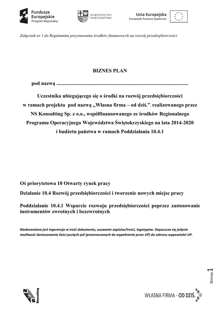 Załącznik nr 1 do Regulaminu przyznawania środków finansowych na rozwój przedsiębiorczości BIZNES PLAN pod nazwą ...................................................................................................... Uczestnika ubiegającego się o środki na rozwój przedsiębiorczości w ramach projektu pod nazwą „Własna firma – od dziś.”, realizowanego przez NS Konsulting Sp. z o.o., współfinansowanego ze środków Regionalnego Programu Operacyjnego Województwa Świętokrzyskiego na lata 2014-2020 i budżetu państwa w ramach Poddziałania 10.4.1 Oś priorytetowa 10 Otwarty rynek pracy Działanie 10.4 Rozwój przedsiębiorczości i tworzenie nowych miejsc pracy Poddziałanie 10.4.1 Wsparcie rozwoju przedsiębiorczości poprzez zastosowanie instrumentów zwrotnych i bezzwrotnych Strona 1 Niedozwolona jest ingerencja w treść dokumentu, usuwanie zapisów/treści, logotypów. Dopuszcza się jedynie możliwość dostosowania ilości pustych pól (przeznaczonych do wypełnienia przez UP) do zakresu wypowiedzi UP. SPIS TREŚCI Strona 2 1. DANE WNIOSKODAWCY ............................................................................................. 3 1.1 PODSTAWOWE DANE ...................................................................................................... 3 1.2 DODSTAWOWE INFORMACJE ....................................................................................... 3 2. SKRÓCONY OPIS PRZEDSIĘWZIĘCIA .................................................................... 3 2.1 RODZAJ PROPONOWANEJ DZIAŁALNOŚCI ................................................................ 3 2.2 SKRÓCONE DANE DOTYCZĄCE PROPONOWANEJ INICJATYWY ......................... 4 3. PROJEKT PRZEDSIĘWZIĘCIA .................................................................................. 4 3.1 PRZEDSTAWIENIE PROJEKTU ....................................................................................... 4 3.2 OFERTA ............................................................................................................................... 5 3.3 RYNEK ................................................................................................................................. 5 3.4 KONKURENCJA ................................................................................................................. 5 3.5 CENA .................................................................................................................................... 6 3.6 SPRZEDAŻ I PRZYCHÓD ................................................................................................. 6 3.7 PROCES PRODUKCJI/DOSTARCZANIA ........................................................................ 6 3.8 ZAGROŻENIA I MOŻLIWOŚCI ........................................................................................ 7 4. PLAN INWESTYCYJNY .................................................................................................... 7 4.1 UZASADNIENIE INWESTYCJI ........................................................................................ 7 4.2 CHARAKTERYSTYKA INWESTYCJI ............................................................................. 7 4.3 ZAKRES INWESTYCJI ...................................................................................................... 8 4.4 ZASOBY LUDZKIE ............................................................................................................ 8 4.5 LOKALIZACJA I ZAPLECZE TECHNICZNE .................................................................. 8 5. PLAN EKONOMICZNO-FINANSOWY ........................................................................... 9 5.1 KALKULACJA KOSZTÓW PODJĘCIA DZIAŁALNOŚCI ............................................. 9 5.2 ŹRÓDŁA POKRYCIA WYDATKÓW ............................................................................. 10 5.3 PROGNOZA EKONOMICZNA PRZEDSIĘWZIĘCIA ................................................... 10 DANE WNIOSKODAWCY c1.1 PODSTAWOWE DANE Nazwisko i imiona PESEL, miejsce urodzenia NIP Adres zamieszkania Telefon E-mail 1.2 PODSTAWOWE INFORMACJE W tym miejscu należy opisać zdobyte wykształcenie, ewentualne odbyte kursy szkoleniowe i doskonalące, dotychczasowe doświadczenie zawodowe i wszelkie dodatkowe posiadane umiejętności oraz, jeśli to możliwe, wskazać i ocenić ich wagę i znaczenie w stosunku do zaproponowanego w niniejszym biznes planie przedsięwzięcia. Wykształcenie Kursy i szkolenia Doświadczenie zawodowe Dodatkowe umiejętności Stan przygotowań do podjęcia działalności gospodarczej 2. SKRÓCONY OPIS PRZEDSIĘWZIĘCIA 2.1 RODZAJ PROPONOWANEJ DZIAŁALNOŚCI Należy zaznaczyć tylko jeden, przeważający typ działalności prowadzonej w ramach proponowanego przedsięwzięcia. PRODUKCYJNA 3 USŁUGOWA Strona HANDLOWA 2.2 SKRÓCONE DANE DOTYCZĄCE PROPONOWANEJ INICJATYWY Przedmiot inicjatywy (maksymalnie 200 znaków) Przedmiot i zakres planowanej działalności (według PKD lub EKD wraz z opisem) Lokalizacja przedsięwzięcia Powiat Gmina Obszar wiejski/miejski Czy wnioskodawca prowadził działalność gospodarczą? Jeśli tak, to kiedy i jaką, i czy korzystał z pomocy publicznej? Całkowity koszt przedsięwzięcia Kwota netto VAT Kwota brutto Wnioskowana kwota dotacji na rozpoczęcie działalności gospodarczej Źródła finansowania poza dotacją 3. PROJEKT PRZEDSIĘWZIĘCIA 3.1 PRZEDSTAWIENIE PROJEKTU Należy jak najdokładniej opisać działalność będącą przedmiotem inicjatywy, przyczyny, które skłoniły wnioskodawcę do takiego a nie innego wyboru oraz aspekty najlepiej charakteryzujące dany rynek. Poniższy opis powinien zawierać również określenie wielkości niezbędnych środków na rozpoczęcie działalności gospodarczej i plan ich wykorzystania, koncepcję prowadzenia i rozwoju firmy oraz przewidywane w związku z tym efekty. Strona 4 [Miejsce na opis] 3.2 OFERTA Proszę opisać produkty/usługi/towary jakie b