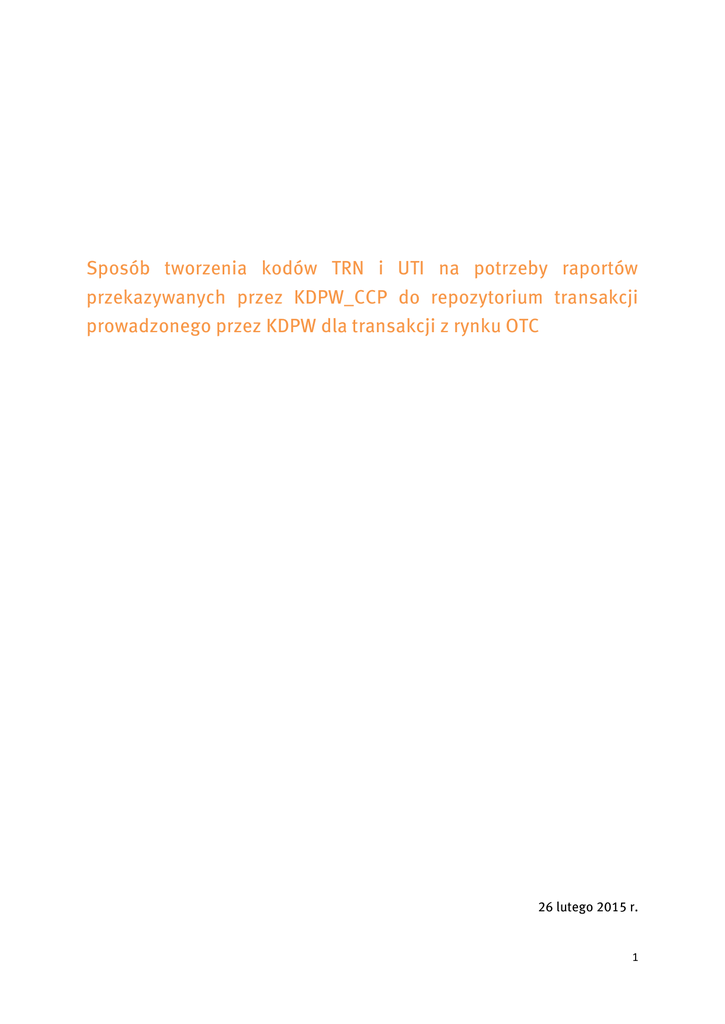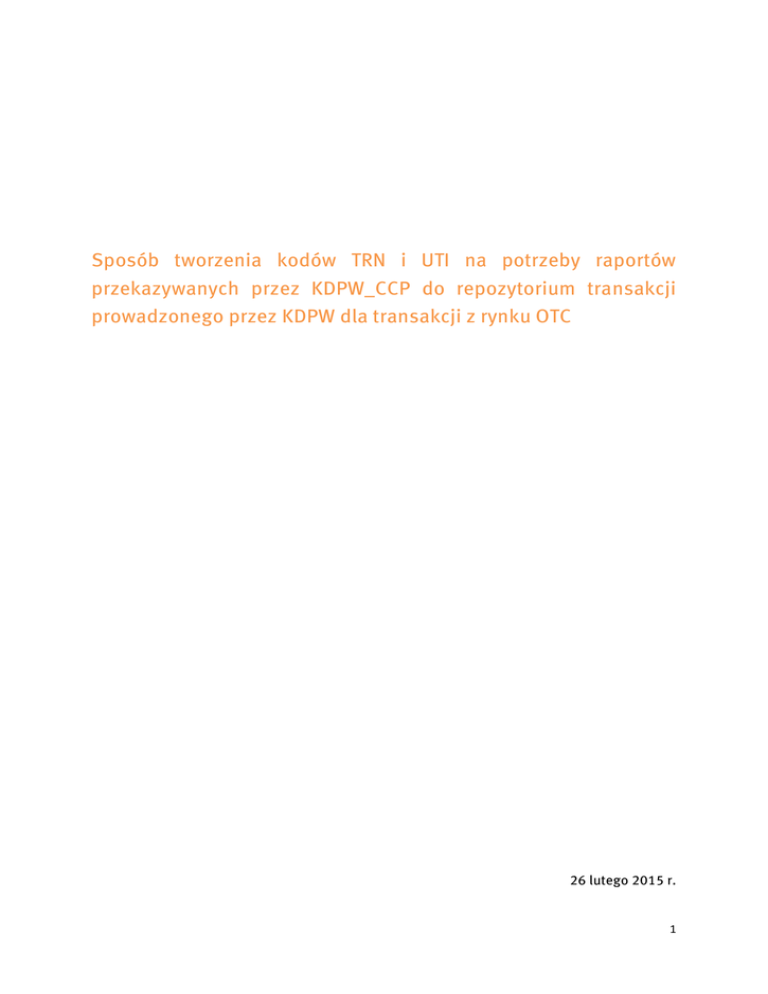 Sposób tworzenia kodów TRN i UTI na potrzeby raportów przekazywanych przez KDPW_CCP do repozytorium transakcji prowadzonego przez KDPW dla transakcji z rynku OTC 26 lutego 2015 r. 1 Informacje ogólne KDPW_CCP będzie przekazywał raporty dla rozliczonych transakcji z rynku OTC do repozytorium transakcji prowadzonego przez KDPW. Raporty będą oznaczone unikalnymi kodami – TRN i UTI. Szczegółowe informacje na temat tworzenia powyższych kodów zostały zawarte poniżej. Przedstawiony sposób obejmuje sytuacje: przyjęcia transakcji do rozliczeń, umorzenia pozycji przeciwstawnych oraz portingu. Identyfikatory transakcji Każda transakcja raportowana do repozytorium transakcji jest oznaczona unikalnym identyfikatorem TRN (Transaction Reference Number). Do budowy identyfikatora TRN KDPW_CCP będzie wykorzystywał przekazywany w komunikacie otcd.ntf.001.01 identyfikator transakcji zawarty w atrybucie ‘id’ w polu ‘trade’. Identyfikator TRN, zgodnie z wymaganiami, będzie zawierał maksymalnie 40 znaków. Identyfikator TRN powinien być unikalny dla każdej transakcji powstałej po nowacji, a także dla pozycji powstałych w wyniku operacji wykonanych w trakcie życia transakcji (terminacja, porting, umorzenie). W związku z powyższym KDPW_CCP dla budowy identyfikatora TRN wykorzysta następujący algorytm: Algorytm budowy identyfikatora TRN dla nowej transakcji (tabela nr 1) Pola nr Długość1 Opis Wartość 1-10 10 E01MIC KDPW_CCP000 E01KDPW0002 11 1 kod rynku N 12 1 Typ operacji T – transakcja P – porting3 A – umorzenie 13-20 8 Data operacji RRRRMMDD 21-n maks. 20 Identyfikator transakcji nadany przez KDPW_CCP wartość atrybutu ‘id’ w polu ‘trade’ Przykład: 1 w sumie maks. 40 znaków Zgodne z metodą nr 1 wskazaną w odpowiedzi do TR Question 18 z 11.02.2014 r. w materiale Questions and Answers Implementation of the Regulation (EU) No 648/2012 on OTC derivatives, central counterparties and trade repositories (Q&A) 3 Raportowanie portingu odbywa się wyłącznie w przypadku różnych stron transakcji (różne NKK) 2 2 Data zawarcia transakcji: atrybut ‘id’ w polu ‘trade’: TRN: 03.11.2014 03423-SELL E01KDPW000NT2014110303423-SELL Identyfikatory raportów Właściwy identyfikator pary raportów/raportu – identyfikator UTI, budowany jest poprzez dodanie do identyfikatora TRN numeru, opisującego każdą parę raportów przekazywanych do repozytorium dla danej transakcji, zwanego dalej rozszerzeniem UTI. Identyfikator UTI będzie tworzony poprzez dodanie do identyfikatora TRN cyfr 008 lub 0094 (tworząc odpowiednio TRN008 lub TRN009), zgodnie z zasadami przedstawionymi w tabeli nr 2 przy uwzględnieniu łańcuchów raportowania wskazanych na rys. nr 1 i 2. Rozszerzenie 008 stosowane jest dla raportów UR – CCP oraz CCP – UR, rozszerzenie 009 natomiast dla raportów UR – CL oraz CL – UR, gdzie UR oznacza uczestnika rozliczającego, a CL klienta uczestnika rozliczającego. Identyfikator UTI, zgodnie z wymaganiami, będzie zawierał maksymalnie 52 znaki. W związku z powyższym KDPW_CCP, dla budowy identyfikatora UTI w raportach przekazywanych zgodnie z obowiązkiem raportowania, wykorzysta następujący algorytm: Algorytm budowy identyfikatora UTI (tabela nr 2) Pola nr Długość Opis Wartość 1-N Maks. 40 Identyfikator transakcji TRN N+1 – N+3 3 Rozszerzenie UTI 008 lub 009 Przykład: TRN: Rozszerzenie UTI: Identyfikator UTI: E01KDPW000NT2014110303423-SELL 008 lub 009 E01KDPW000NT2014110303423-SELL008 Rozszerzenie 008 jest dla raportów UR – CCP oraz CCP – UR. Rozszerzenie 009 jest dla raportów UR – CL oraz CL – UR. 4 Rozszerzenie UTI ‘008’ i ‘009’ jest kontynuacją metody przyjętej na potrzeby raportowania z rynku regulowanego 3 Numeracja raportów zgodnie ze scenariuszami z Q&A W raportowaniu OTC istnieją dwa możliwe scenariusze po nowacji: Scenariusz 1 (rys. nr 1): Powyższy scenariusz opisuje sytuację, gdy rozliczona zostaje transakcja własna UR. Scenariusz 2 (rys. nr 2): W tym przypadku rozliczana jest transakcja klienta. W zależności od scenariusza dla transakcji zostaną wysłane raporty zgodnie z poniższą tabelą: Lista raportów (tabela nr 3) Zobowiązany Raport do Numer UTI Kontrahent raportowania Drugi Rozliczający Beneficjent kontrahent (UR) (CL) 1 UR TRN008 UR CCP UR UR 2 CCP TRN008 CCP UR CCP CCP 3 CL TRN009 CL UR UR CL 4 UR TRN009 UR CL UR UR 4