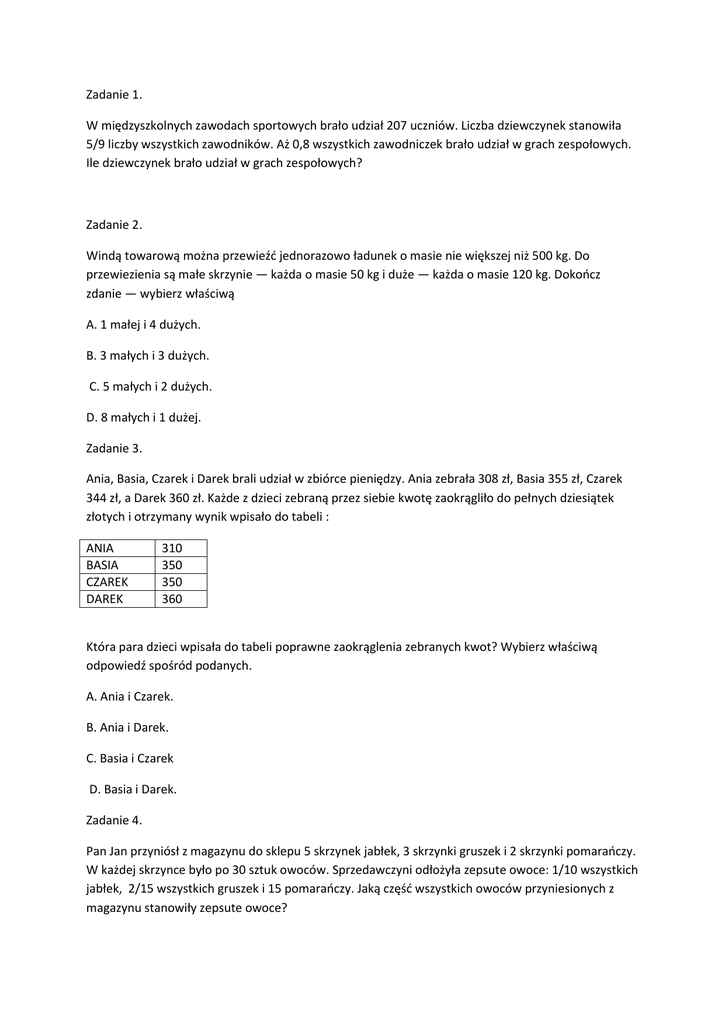 Zadanie 1. W międzyszkolnych zawodach sportowych brało udział 207 uczniów. Liczba dziewczynek stanowiła 5/9 liczby wszystkich zawodników. Aż 0,8 wszystkich zawodniczek brało udział w grach zespołowych. Ile dziewczynek brało udział w grach zespołowych? Zadanie 2. Windą towarową można przewieźć jednorazowo ładunek o masie nie większej niż 500 kg. Do przewiezienia są małe skrzynie — każda o masie 50 kg i duże — każda o masie 120 kg. Dokończ zdanie — wybierz właściwą A. 1 małej i 4 dużych. B. 3 małych i 3 dużych. C. 5 małych i 2 dużych. D. 8 małych i 1 dużej. Zadanie 3. Ania, Basia, Czarek i Darek brali udział w zbiórce pieniędzy. Ania zebrała 308 zł, Basia 355 zł, Czarek 344 zł, a Darek 360 zł. Każde z dzieci zebraną przez siebie kwotę zaokrągliło do pełnych dziesiątek złotych i otrzymany wynik wpisało do tabeli : ANIA BASIA CZAREK DAREK 310 350 350 360 Która para dzieci wpisała do tabeli poprawne zaokrąglenia zebranych kwot? Wybierz właściwą odpowiedź spośród podanych. A. Ania i Czarek. B. Ania i Darek. C. Basia i Czarek D. Basia i Darek. Zadanie 4. Pan Jan przyniósł z magazynu do sklepu 5 skrzynek jabłek, 3 skrzynki gruszek i 2 skrzynki pomarańczy. W każdej skrzynce było po 30 sztuk owoców. Sprzedawczyni odłożyła zepsute owoce: 1/10 wszystkich jabłek, 2/15 wszystkich gruszek i 15 pomarańczy. Jaką część wszystkich owoców przyniesionych z magazynu stanowiły zepsute owoce? Zadanie 5. Bartek rozwiązał 60 zadań z matematyki w ciągu trzech dni: pierwszego dnia rozwiązał połowę wszystkich zadań, drugiego dnia 5 2 pozostałych zadań, a resztę trzeciego dnia. Ile zadań rozwiązał Bartek trzeciego dnia? Zadanie 6. Poniżej przedstawiono kartkę z kalendarza. 11 Maj 2012 PIĄTEK WSCHÓD ZACHÓD SŁOŃCE 4:47 20:19 KSIEŻYC 0:43 10:05 Bezchmurne niebo 11 maja 2012 r. pozwalało obserwować Słońce i Księżyc. Ile godzin i minut można było wtedy jednocześnie obserwować i Słońce, i Księżyc? Zadanie 7. Panowie Adam i Krzysztof opracowali trasę rowerowej wędrówki „dookoła Polski”. Pan Adam wyjechał 20 kwietnia rano i codziennie przejeżdżał 40 km. Pan Krzysztof wyruszył w tę samą trasę z tego samego miejsca tydzień później. Każdego dnia pokonywał jednakową liczbę kilometrów. Pan Krzysztof dogonił kolegę 10 maja wieczorem, po przejechaniu zaplanowanej na ten dzień trasy. Ile kilometrów dziennie pokonywał pan Krzysztof? Zadanie 8. Oskar po zakończeniu lekcji jeszcze przez kwadrans przebywał w szkole. Drogę ze szkoły do domu pokonał w 25 minut i o 14:05 był na miejscu. O której godzinie Oskar skończył lekcje? Zadanie 9. Zosia kupiła 13 biletów do kina w cenie 11,50 zł za bilet. Ile złotych reszty otrzymała, jeśli dała kasjerce dwa banknoty stuzłotowe? Zadanie 10. Krzyś i Ania piszą na klawiaturze komputera. Ania zapisuje 30 znaków w czasie 20 sekund, a Krzysiowi zapisanie 30 znaków zajmuje 10 sekund. Każde z nich zapisało tekst zawierający 360 znaków. Oblicz, o ile minut dłużej od Krzysia pisała Ania. Zadanie 11. Wojtek kupił 12 jednakowych notatników i zapłacił za nie 60 zł. Kilka dni później cenę takiego notatnika, jak zakupiony przez Wojtka obniżono o 20%. Ile najwięcej takich notatników po obniżonej cenie można kupić za 60 zł? Zadanie 12. Jurek buduje z patyczków trójkątne ramki . Dokończ zdania. Wybierz liczbę spośród oznaczonych literami A i B oraz liczbę spośród oznaczonych literami C i D. Jurek zbudował trójkątną ramkę z trzech patyczków. Jeden patyczek miał długość 10 cm, drugi 15 cm. Trzeci patyczek mógł mieć długość A / B A. 25 cm B. 18 cm Jurek wziął dwa patyczki — pierwszy o długości 16 cm, a drugi o długości 19 cm. Jeden z nich przełamał na dwie części. Z tak otrzymanych patyczków zbudował trójkątną ramkę. Jurek złamał patyczek o długości C / D C. 16cm D. 19 cm Zadanie 13. Uczeń miał dwa jednakowe małe prostopadłościenne klocki. W każdym z nich posmarował klejem jedną ścianę o wymiarach 3 cm i 6 cm i skleił klocki ze sobą . Otrzymał większy prostopadłościenny klocek o powierzchni 110 cm2 . Dokończ zdanie — wybierz właściwą odpowiedź spośród podanych. Pole powierzchni jednego małego klocka było równe A. 46 cm2 B. 55 cm2 C. 64 cm2 D. 73 cm2 Zadanie 14. Teren przeznaczony pod szkółkę drzewek owocowych ma kształt prostokąta o powierzchni 80 arów (1 ar = 100 m2 ). Jeden z boków tego prostokąta ma długość 160 m. Teren ten będzie ogrodzony siatką, której metr bieżący kosztuje 9,50 zł. Na furtkę i bramę wjazdową należy łącznie odliczyć 4,5 m. Oblicz koszt zakupu siatki potrzebnej do ogrodzenia tego terenu.