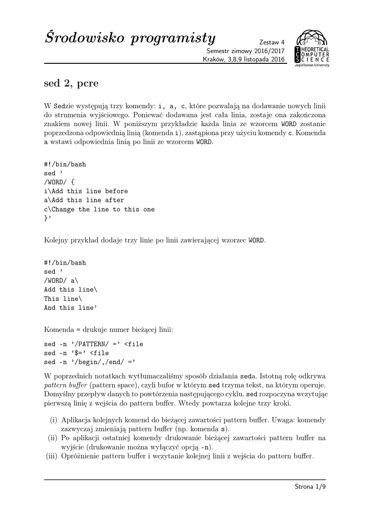 z wejścia, umieszcza tę linię w pattern buffer, itd. Komenda D usuwa z pattern buffer