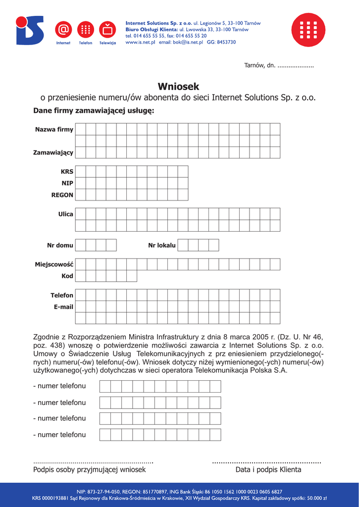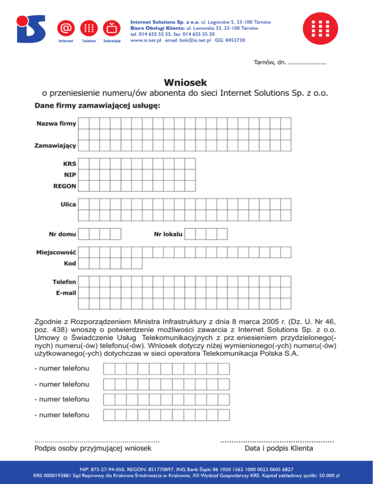 Tarnów, dn. .................... Wniosek o przeniesienie numeru/ów abonenta do sieci Internet Solutions Sp. z o.o. Dane firmy zamawiajàcej usùugæ: Nazwa firmy Zamawiajàcy KRS NIP REGON Ulica Nr domu Nr lokalu Miejscowoúã Kod Telefon E-mail Zgodnie z Rozporzàdzeniem Ministra Infrastruktury z dnia 8 marca 2005 r. (Dz. U. Nr 46, poz. 438) wnoszæ o potwierdzenie moýliwoúci zawarcia z Internet Solutions Sp. z o.o. Umowy o Úwiadczenie Usùug Telekomunikacyjnych z prz eniesieniem przydzielonego(nych) numeru(-ów) telefonu(-ów). Wniosek dotyczy niýej wymienionego(-ych) numeru(-ów) uýytkowanego(-ych) dotychczas w sieci operatora Telekomunikacja Polska S.A. - numer telefonu - numer telefonu - numer telefonu - numer telefonu ……………………………………………………. Podpis osoby przyjmujàcej wniosek .................................................. Data i podpis Klienta Oúwiadczenie: Wyraýam zgodæ na przetwarzanie moich danych osobowych dla celów realizacji procesu przeniesienia numerów (Dz. U. Nr 101/02 poz.926 z póên. zmianami). Wyraýam/nie wyraýam* dobrowolnà zgodæ na przetwaýanie moich danych osobowych, w tym ich udostæpnianie, w celach marketingu bezpoúredniego produktów/usùug Internet Solutions Sp. z o.o. zgodnie z art. 23 ustawy z dnia 29 sierpnia 1997r. o ochronie danych osobowych (Dz. U. Z dnia 29 paêdziernika 1997r.). Oúwiadczam, ýe zostaùem/am poinformowany/a o prawie dost æpu do swoich danych osobowych oraz prawie ich poprawiania. Osobie, której dane dotyczà, przysùuguje prawo wniesienia sprzeciwu wobec przetwarzania jej danych osobowych w celach marketingowych Internet Solutions Sp. z o.o. stosownie do art. 32 ust.1 pkt. 8 ustawy o ochronie danych osobowych. Jednoczeúnie oúwiadczam, ýe zawarte w niniejszym wniosku dane sà prawdziwe. ……………………………………………………. Podpis osoby przyjmujàcej oúwiadczenie *) niepotrzebne skreúliã .................................................. Data i podpis Klienta