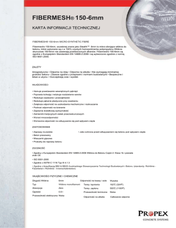 FIBERMESH® 150-6mm KARTA INFORMACJI TECHNICZNEJ FIBERMESH® 150-6mm MICRO-SYNTHETIC FIBRE Fibermesh® 150-6mm, wcześniej znane jako Stealth™ 6mm to mikro-zbrojące włókna do betonu, które wykonane są z w 100% czystych homopolimerów polipropylenu Włókna skurczowe 150-6mm nie zawierają przetworzonych alkenów. Fibermesh® 150-6mm są zgodne z Europejskim Standardem EN 14889-2:2006 i są wytworzone zgodnie z normą ISO 9001-2000. ZALETY Amagnetyczne • Odporne na rdzę • Odporne na alkalia • Nie wymagają minimalnej grubości betonu • Zawsze zgodne z przepisami i normami budowlanymi • Bezpieczne i łatwe w użyciu • Oszczędzają czas i wysiłek WŁAŚCIWOŚCI • Hamuje powstawanie wewnętrznych pęknięć Technologia e3 • Poprawia kohezję i redukuje rozdzielanie warstw • Redukuje osadzanie i przesiąkliwość • Redukuje pękanie plastyczne przy osadzaniu • Zwiększa odporność na uszkodzenia mechaniczne i rozkruszanie • Podnosi odporność na ścieranie • Zapewnia dodatkową wytrzymałość • Zamiennik tradycyjnych siatek przeciwskurczowych • Wzrost mrozoodporności • Wzmacnia odporność na odłupywanie się pod wpływem ciepła ZASTOSOWANIE • Zaprawy murarskie • Jako ochrona przed odłupywaniem się betonu pod wpływem ciepła • Beton prasowany • Mieszanki gipsowe • Produkty do naprawy betonu ZGODNOŚĆ • Zgodny z Europejskim Standardem EN 14889-2:2006 Włókna do Betonu Część 2: Klasa 1b i posiada znak CE • ISO 9001-2000 • Zgodne z ASTM C 1116 Typ III 4.1.3 • Zgodne z klasyfikacją BB2 & BB2G Austriackiego Stowarzyszenia Technologii Budowlanych i Betonu (standardy: Richtlinie Faserbeton i Richtlinie - Innenschalenbeton) WŁĄŚCIWOŚCI FIZYCZNE I CHEMICZNE Odporność na kwasy i sole Długość Włókna 6mm Typ Włókno monofilament Temp. topnienia 162°C (324°F) Absorpcja Zero Temp. zapłonu 593°C (1100°F) Gęstość 0.9 l Przewodność termiczna Niska Odporność na alkalia Całkowicie odporne Przewodność elektryczna Niska Wysoka FIBERMESH® 150-6mm PostScript Picture Untitled-1 SPOSÓB UŻYCIA WSPARCIE TECHNICZNE MIESZANIE: Mikro zbrojenia Fibermesh® 150-6mm są wzmocnieniem mechanicznym, zatem nie wymagają wody, ani żadnych innych dodatków. Włókna Fibermesh® 150-6mm mogą być dodawane do mieszalnika przed, w trakcie, lub po dodaniu innych składników betonu. Po dodaniu włókien, beton powinien być mieszany przez wystarczający okres czasu (minimum 5 minut przy pełnej prędkości mieszania), aby zapewnić równomierny rozkład włókna na całej objętości betonu. Propex Concrete Systems zapewnia wsparcie specjalistów w dziedzinie wzmacniania konstrukcji betonowych, którzy są w stanie po przeanalizowaniu problemu zaproponować najlepsze możliwe rozwiązanie. UŻYCIE: mikro-zbrojony beton może być pompowany, nakładany natryskowo, albo aplikowany tradycyjnymi metodami przy użyciu konwencjonalnych urządzeń. Listwy kierunkowe, wibratory itp. urządzenia wyrównujące również mogą zostać użyte. • Europejski Standard EN 14889-2: 2006 Włókna do Betonu WYKAŃCZANIE: mikro-zbrojony beton może być wykańczany jakąkolwiek techniką. DAWKOWANIE: Rekomendowana dawka włókien Fibermesh® 150-6mm by osiągnąć najlepsze rezultaty to 0.9 kg/m³. Jeśli wymagana jest odporność na odłupywanie się betonu pod wpływem znacznych temperatur zaleca się dawkę od 0,9 kg/m³ do kg/m³ Przy niestandardowych projektach prosimy o kontakt z lokalnym dystrybutorem w celu ustalenia właściwych proporcji do danego zastosowania. WSKAZÓWKI Włókna Fibermesh® 150-6mm nie powinny być używane jako: - zamiennik strukturalnego zbrojenia nośnego, - wzmocnienie, aby użyć cieńszej warstwy betonu niż jest to wspomniane w projekcie, - wzmocnienie, aby zwiększyć odległość pomiędzy połączeniami ponad tę zalecaną dla niewzmocnionego betonu. REFERENCJE • Concrete Society (UK) Technical Report 34 Concrete Industrial Floors • Concrete Society (UK) Technical Report 22 Non-structural cracks in concrete. • Fibermesh® Guidance notes for Fibermesh® Reinforced concrete ground supported slabs. • Austrian Association for Concrete & Building Technology guidelines for Fibre Concrete KLAUZULA SPECYFIKACJI Powyższa specyfikacja odnosi się tylko i wyłącznie do produktu Fibermesh® 150-6mm. Opisywane włókna są zrobione z w 100% czystych homopolimerów polipropylenu (zgodnie z ISO 1873-PP-H, klasyfikacja FN 28-02-045) zgodne z EN 14889-2: 2006 Klasa Ib i wytwarzane w zakładzie produkcyjnym posiadającym. ISO 9001-2000. Wytwórca musi mieć minimum 5 lat udokumentowanej produkcji i osiągać średnią wytrzymałość resztkową 0,35MPa (odnosząc się do ASTM 1399). Włókna Fibermesh® 150-6mm powinny być przygotowane w mieszalni w zalecanej dawce 0.9 kg/m³ i wymieszane przez minimum 5 minut przy pełnej prędkości mieszalnika. Włókna powinny być wyprodukowane przez: KOMPATYBILNOŚĆ Włókna Fibermesh® 150-6mm są kompatybilne ze wszystkimi substancjami chemicznymi dodawanymi do betonu. BEZPIECZEŃSTWO Propex Concrete Systems, Propex House, 9 Royal Court, Basil Close, Chesterfield, Derbyshire, S41 7SL. United Kingdom. Telephone: + 44 (0) 1246 564200, Fax: + 44 (0) 1246 564201, e-mail: [email protected] Nie są wymagane żadne specjalne zasady dotyczące użytkowania włókien Fibermesh® 150-6mm. OPAKOWANIA Włókna Fibermesh® 150-6mm są dostępne w standardowych opakowaniach 0.9 kg. Opakowania te są przeznaczone do umieszczania bezpośrednio w urządzeniu mieszającym (bez ich otwierania). Dostępne są również większe opakowania zbiorcze. POLSKA Centrum Badawczo-Produkcyjne "ALCOR" Sp. z o.o. ul. Kępska 12, 45-130 Opole tel/fax 77 455 46 10; 77 457 98 56; 77 455 74 77 www.alcor.pl “Fibermesh®”, “Novomesh®”, “Novocon®”, “ENDURO®” and “e3®” are registered trademarks of Propex Concrete Systems Corp. INTERNATIONAL Propex House, 9 Royal Court, Basil Close, Cheste