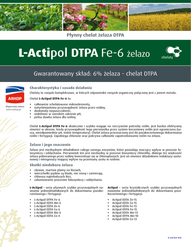Płynny chelat żelaza DTPA L-Actipol DTPA Fe-6 żelazo Gwarantowany skład: 6% żelaza - chelat DTPA Charakterystyka i zasada działania Chelaty to związki kompleksowe, w których odpowiedni związek organiczny połączony jest z jonem metalu. Chelat L-Actipol DTPA Fe-6 to: www.arkop.pl • • • • • całkowicie schelatowane mikroelementy, natychmiastowa przyswajalność żelaza przez rośliny, doskonała rozpuszczalność, stabilność w szerokim zakresie pH, pełna dawka żelaza dla rośliny. Chelat L-Actipol DTPA Fe-6 skutecznie i szybko reaguje na rzeczywiste potrzeby roślin. Jest bardzo efektywny również w okresie, kiedy przyswajalność tego pierwiastka przez system korzeniowy roślin jest ograniczona (susza, nieodpowiednie pH, niskie temperatury). Chelat żelaza przeznaczony jest do pozakorzeniowego dokarmiania roślin i fertygacji. Zapobiega chlorozie oraz pokrywa całkowite zapotrzebowanie roślin na żelazo. Żelazo i jego znaczenie Żelazo jest niezbędnym składnikiem całego szeregu enzymów, które posiadają znaczący wpływ w procesie fotosyntezy i oddychania. Pierwiastek ten jest niezbędny w procesie biosyntezy chlorofilu, dlatego też większość żelaza pobieranego przez rośliny koncentruje się w chloroplastach. Jest on również składnikiem reduktazy azotanowej i nitrogenazy mającej wpływ na przemiany azotu w roślinie. Skutki niedoboru żelaza • • • • rdzawe, martwe plamy na liściach, wierzchołki pędów są blade, nie rosną i zamierają, chloroza najmłodszych liści, zahamowanie procesów fotosyntezy i oddychania. L-Actipol - seria płynnych szybko przyswajalnych nawozów jednoskładnikowych do dokarmiania pozakorzeniowego i fertygacji: Actipol - seria krystalicznych szybko przyswajalnych nawozów jednoskładnikowych do dokarmiania pozakorzeniowego i fertygacji: • • • • • • • • • • • • • L-Actipol DTPA Fe-6 L-Actipol EDTA Mn-6 L-Actipol EDTA Zn-6 L-Actipol EDTA Cu-6 L-Actipol EDTA Mo-6 L-Actipol EDTA Co-4 Actipol EDTA Zn-15 Actipol EDTA Cu-15 Actipol EDTA Fe-13 Actipol DTPA Fe-15 Actipol EDTA Mn-13 Actipol DTPA Mn-10 Actipol EDTA Co-13 L-Actipol Fe-6 żelazo Dawkowanie Uprawy Termin zabiegu Dawka [l/ha] Ilość cieczy roboczej [l/ha] Zboża ozime I – Początek strzelania w źdźbło* II – Interwencyjnie po stwierdzeniu niedoboru 2-3 zabiegi co 10-14 dni** 1-2 200-300 Inne rolnicze I – W fazie intensywnego wzrostu** II – Interwencyjnie po stwierdzeniu niedoboru 2-3 zabiegi co 10-14 dni** 1-2 200-300 Warzywnicze I – Profilaktycznie od początku wegetacji do zbioru plonów* II – Interwencyjnie po stwierdzeniu niedoboru 1-2 zabiegi co 10-14 dni* 2-3 400-600 Drzewa i krzewy owocowe I – Profilaktycznie w całym okresie wegetacji* II – Interwencyjnie po stwierdzeniu niedoboru 2-3 zabiegi co 10-14 dni* 2-3 700-1000 Rośliny ozdobne I – Na początku wegetacji** II – W fazie intensywnego wzrostu** III – Interwencyjnie po stwierdzeniu niedoboru 2-3 zabiegi co 10-14 dni** 0,1-0,2 100 (10-20ml na 10l wody) Fertygacja: z 16 ml L-Actipol DTPA Fe-6, na 1000 l wody, uzyskuje się roztwór 1,2 mg Fe/l *- zabieg zalecany w programie nawożenia **- zabieg opcjonalny Sporządzanie roztworu roboczego: stosować pojedynczo lub łącznie Siarczanem Magnezu Jednowodnym MgO-23%, nawozem dolistnym lub środkiem ochrony roślin; bezpośrednio przed opryskiem napełnić zbiornik opryskiwacza wodą do 2/3 objętości i włączyć mieszadło; dodawać kolejno Siarczan Magnezu Jednowodny MgO-23%, nawóz dolistny, L-Actipol EDTA Fe-6, środek ochrony roślin według instrukcji stosowania (jeśli jest przewidziany i zalecany do mieszania przez producenta), adiuwant; dopełnić wodą i przystąpić do oprysku. Nie przekraczać zalecanych dawek L-Actipol EDTA Fe-6. Firma Arkop Swoje doświadczenie w branży nawozowej budujemy od 1992 roku. Produkujemy nawozy, których celem jest wydobycie z natury tego, co najlepsze… Z tego względu w naszej ofercie znajdą Państwo szeroką ofertę produktów opartych o najnowsze rozwiązania biotechnologii, w szczególności wysokiej klasy chelatów (stopień schelatowania potwierdzony przez PCBC). Wieloletnia współpraca z placówkami naukowymi i uczelniami zaowocowała gamą produktów sprawdzonych i skutecznych. Nieustannie monitorujemy proces produkcji oraz reagujemy na wszelkie zmiany i sugestie, stale poszerzając naszą ofertę oraz dostosowując ją do indywidualnych potrzeb Klientów. Nasza spółka Arkop szybko stała się synonimem wysokiej jakości, którą uzyskaliśmy nie tylko dzięki współpracy z uczelniami i placówkami naukowymi, lecz również wprowadzając innowacyjne rozwiązania technologiczne w oparciu o własne badania i doświadczenia. Dlatego wszystkie oferowane przez nas produkty spełniają standardy jakości i ekologii przyjęte w Unii Europejskiej. Stosujemy i ciągle rozwijamy zintegrowany system zarządzania jakością i bezpieczeństwem żywności ISO 22000 (HACCP) oraz ISO 9001. Jako potwierdzenie spełniania najsurowszych wymogów w tej dziedzinie uzyskaliśmy certyfikat zintegrowanego systemu zarządzania – Jakość i Bezpieczeństwo Żywności – HACCP – PN–EN ISO 9001:2009 i PN–EN ISO 22000–2006 – certyfikat nr JH–178/2/2010. Posiadamy również certyfikat europejskiego systemu jakości dla dodatków paszowych i premiksów FAMI–QS. Obecnie współpracujemy z Klientami z całego świata. ARKOP Sp. z o.o. 32-332 Bukowno, ul. Kolejowa 34a tel.: +48 32 649 44 51 [email protected] | www.arkop.pl
