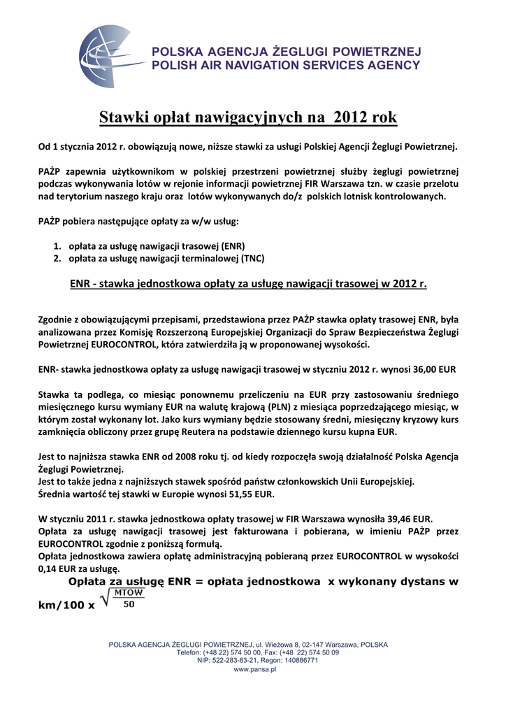 POLSKA AGENCJA ŻEGLUGI POWIETRZNEJ POLISH AIR NAVIGATION SERVICES AGENCY Stawki opłat nawigacyjnych na 2012 rok Od 1 stycznia 2012 r. obowiązują nowe, niższe stawki za usługi Polskiej Agencji Żeglugi Powietrznej. PAŻP zapewnia użytkownikom w polskiej przestrzeni powietrznej służby żeglugi powietrznej podczas wykonywania lotów w rejonie informacji powietrznej FIR Warszawa tzn. w czasie przelotu nad terytorium naszego kraju oraz lotów wykonywanych do/z polskich lotnisk kontrolowanych. PAŻP pobiera następujące opłaty za w/w usług: 1. opłata za usługę nawigacji trasowej (ENR) 2. opłata za usługę nawigacji terminalowej (TNC) ENR ‐ stawka jednostkowa opłaty za usługę nawigacji trasowej w 2012 r. Zgodnie z obowiązującymi przepisami, przedstawiona przez PAŻP stawka opłaty trasowej ENR, była analizowana przez Komisję Rozszerzoną Europejskiej Organizacji do Spraw Bezpieczeństwa Żeglugi Powietrznej EUROCONTROL, która zatwierdziła ją w proponowanej wysokości. ENR‐ stawka jednostkowa opłaty za usługę nawigacji trasowej w styczniu 2012 r. wynosi 36,00 EUR Stawka ta podlega, co miesiąc ponownemu przeliczeniu na EUR przy zastosowaniu średniego miesięcznego kursu wymiany EUR na walutę krajową (PLN) z miesiąca poprzedzającego miesiąc, w którym został wykonany lot. Jako kurs wymiany będzie stosowany średni, miesięczny kryzowy kurs zamknięcia obliczony przez grupę Reutera na podstawie dziennego kursu kupna EUR. Jest to najniższa stawka ENR od 2008 roku tj. od kiedy rozpoczęła swoją działalność Polska Agencja Żeglugi Powietrznej. Jest to także jedna z najniższych stawek spośród państw członkowskich Unii Europejskiej. Średnia wartość tej stawki w Europie wynosi 51,55 EUR. W styczniu 2011 r. stawka jednostkowa opłaty trasowej w FIR Warszawa wynosiła 39,46 EUR. Opłata za usługę nawigacji trasowej jest fakturowana i pobierana, w imieniu PAŻP przez EUROCONTROL zgodnie z poniższą formułą. Opłata jednostkowa zawiera opłatę administracyjną pobieraną przez EUROCONTROL w wysokości 0,14 EUR za usługę. Opłata za usługę ENR = opłata jednostkowa x wykonany dystans w km/100 x POLSKA AGENCJA ŻEGLUGI POWIETRZNEJ, ul. Wieżowa 8, 02-147 Warszawa, POLSKA Telefon: (+48 22) 574 50 00, Fax: (+48 22) 574 50 09 NIP: 522-283-83-21, Regon: 140886771 www.pansa.pl POLSKA AGENCJA ŻEGLUGI POWIETRZNEJ POLISH AIR NAVIGATION SERVICES AGENCY TNC ‐ stawka jednostkowa opłaty za usługę nawigacji terminalowej w 2012 r. 30 grudnia 2011 roku Prezes ULC ustalił wysokość stawki jednostkowej opłaty za usługę nawigacji terminalowej w wysokości 781,06 PLN. Zatwierdzona stawka wchodzi w życie z dniem 1 stycznia 2012 roku. W ubiegłym roku stawka jednostkowa opłaty za usługę nawigacji terminalowej wynosiła 1051,03 PLN. Nowa stawka redukuje o jedną czwartą cenę za nawigację terminalową. Opłata za usługę nawigacji terminalowej jest naliczana, fakturowana I pobierana przez PAZP według poniższej formuły: Opłata za TNC =stawka opłaty jednostkowej x (MTOW/50)0,7 PAŻP jest technicznie i kadrowo przygotowana do obsługi na polskich lotniskach ruchu kilkukrotnie wyższego. Im większa będzie liczba obsługiwanych operacji lotniczych, tym całkowite koszty bezpieczeństwa, zgodnie z normami prawnymi, będą rozkładać się na większa liczbę użytkowników przestrzeni powietrznej, a w konsekwencji stawki jednostkowe opłat za nawigację terminalową będą niższe. Prezes ULC utrzymał jedną, wspólną strefę pobierania opłat za nawigację terminalową na 12 polskich lotniskach kontrolowanych (FIR Warszawa). To oznacza, że ustalona przez prezesa ULC jednostkowa stawka za usługę nawigacji terminalowej będzie taka sama we wszystkich portach lotniczych. Wspólną strefą pobierania opłat za usługę nawigacji terminalowej w pierwszej połowie roku 2012 (do czasu zmiany KPSD i rozszerzenia strefy o Port Lotniczy Lublin – Świdnik) objęte zostaną następujące lotniska: Lotnisko Chopina w Warszawie / EPWA Lotnisko Gdańsk im. Lecha Wałęsy / EPGD Lotnisko Kraków ‐ Balice / EPKK Lotnisko Bydgoszcz ‐ Szwederowo / EPBY Lotnisko Katowice ‐ Pyrzowice / EPKT Lotnisko Łódź ‐ Lublinek / EPLL Lotnisko Poznań ‐ Ławica / EPPO Lotnisko Rzeszów ‐ Jasionka / EPRZ Lotnisko Szczecin ‐ Goleniów / EPSC Lotnisko Wrocław ‐ Strachowice / EPWR Lotnisko Zielona Góra ‐ Babimost / EPZG Lotnisko Warszawa/Modlin / EPMO POLSKA AGENCJA ŻEGLUGI POWIETRZNEJ, ul. Wieżowa 8, 02-147 Warszawa, POLSKA Telefon: (+48 22) 574 50 00, Fax: (+48 22) 574 50 09 NIP: 522-283-83-21, Regon: 140886771 www.pansa.pl POLSKA AGENCJA ŻEGLUGI POWIETRZNEJ POLISH AIR NAVIGATION SERVICES AGENCY W celu uzyskania informacji dotyczących naliczania I pobierania opłat za usługi nawigacyjne prosimy o kontakt na poniższe adresy: ENR ‐ www.eurocontrol.int/crco lub [email protected] TNC ‐ [email protected]; [email protected] Powyższe adresy do kontaktu można znaleźć także na każdej fakturze wystawionej przez CRCO lub PAŻP. Kontakt dla prasy: Grzegorz Hlebowicz Rzecznik Prasowy Polska Agencja Żeglugi Powietrznej www.pansa.pl tel. 0‐22 574 67 74, 0 609 501 241 fax. 0‐22 574 67 79 e‐mail: [email protected] POLSKA AGENCJA ŻEGLUGI POWIETRZNEJ, ul. Wieżowa 8, 02-147 Warszawa, POLSKA Telefon: (+48 22) 574 50 00, Fax: (+48 22) 574 50 09 NIP: 522-283-83-21, Regon: 140886771 www.pansa.pl