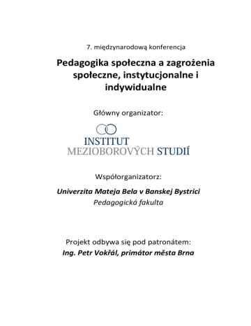 7. międzynarodową konferencja Pedagogika społeczna a zagrożenia społeczne, instytucjonalne i indywidualne Główny organizator: Współorganizatorz: Univerzita Mateja Bela v Banskej Bystrici Pedagogická fakulta Projekt odbywa się pod patronátem: Ing. Petr Vokřál, primátor města Brna 14. a 15. kwietnia 2015 wtorek 14. kwietnia 2015 07:30-09:00 09:00-09:15 09:15-10:45 10:45-11:15 11:15-12:30 12:30-14:30 14:30-16:00 16:00-16:30 16:30-18:00 18:00-18:30 19:00-24:00 Rejestracja uczestników Inauguracja konferencji Obrady plenarne I Przerwa na kawę/herbatę Obrady plenarne II Obiad Obrady w sekcjach Przerwa na kawę/herbatę Obrady w sekcjach Spotkanie Zespołu Pedagogiki Społecznej przy KNP PAN – prof. Pilch Uroczysta kolacja, spotkanie towarzyskie z udziałem zespołu muzycznej środa 15. kwietnia 2015 09:00-10:30 10:30-11:00 11:00-12:30 12:30-13:00 2 Obrady w sekcjach I, II, III Przerwa na kawę/herbatę Obrady w sekcjach Podsumowanie konferencji, dyskusja i postulaty główna sala parter restauracja parter ślubny salonik 1. piętro wtorek 14.30-16.00 sekcja 1 sekcja 2 sekcja 3 14. 4. 2015 16.30-18.00 sekcja 1 sekcja 2 sekcja 3 środa 09.00-10.30 sekcja 1 sekcja 2 sekcja 3 15. 4. 2015 11.00-12.30 sekcja 1 sekcja 2 sekcja 3 Pedagogika społeczna a zagrożenia społeczne, instytucjonalne i indywidualne 14. a 15. kwietnia 2015 Główne referaty posiedzenia plenarnego wtorek 14. kwietnia 2015, 9:15-10:45 główna sala wykładowa Prof. zw. dr hab. Tadeusz Pilch Geneza istota i skutki zagrożeń społecznych prof. PhDr. Jolana Hroncová, PhD. Społeczne zagrożenia dzieci i młodzieży w XXI wieku oraz uczestnictwo pedagogiki społecznej w ich prewencji i rozwiązywaniu Prof. dr hab. Wiesław Theiss, Prof. dr hab. Barbara Smolińska-Theiss Nierówności społeczne i oświatowe – tradycyjne problemy w nowej perspektywie Doc. PhDr Zlatica Bakošová, CSc. REZYLIENCJA - odporność na indywidualne zagrożenie Prof. zw. Dr hab. Jerzy Modrzewski Pedagogika społeczna wobec bierności, bezczynności i bezradności w doświadczeniu indywidualnym i społecznym- zarys problemu prof. PhDr. Ingrid Emmerová, PhD. Prewencyjna praca społeczno-wychowawcza w szkole jako podstawa prewencji społecznego zagrożenia uczniów Pedagogika społeczna a zagrożenia społeczne, instytucjonalne i indywidualne 3 14. a 15. kwietnia 2015 wtorek 14. kwietnia 2014, 11:15-12:30 dr hab., prof UwB Mirosław Sobecki Nacjonalizm – stare zagrożenie w nowych uwarunkowaniach prof. ndzw. dr hab. Małgorzata Orłowska Prawo do lenistwa - miedzy przekleństwem a dobrodziejstwem. The right to laziness - between curse and blessing PhDr. Miroslav Procházka, Ph.D. Doświadczenia z realizacją programów pierwotnej profilaktyki w środowisku szkół podstawowych w Republice Czeskiej doc. PhDr. Miriam Niklová, PhD. Ujemne konsekwencje świata wirtualnego na psychosocjalny rozwój dzieci i młodzieży Profesor Krystyna Marzec-Holka Sprawiedliwość naprawcza czy rosnąca marginalizacja potrzeb rozwojowych i opiekuńczych dziecka doc. PhDr. Miloslav Jůzl, Ph.D. Współczesne zagrożenia wobec mężczyzn PhDr. Peter Papšo, PhD. Mladí dospelí z detských domovov - ich životná situácia a možnosti pomoci 4 Pedagogika społeczna a zagrożenia społeczne, instytucjonalne i indywidualne 14. a 15. kwietnia 2015 sekcja I Sekcja I: Zagrożenia społeczne Miejsce obrad: wtorek 14. kwietnia 2015 – główna sala wykładowa 14:30-16:00, 16:30-18:00 Środa 15. Kwietnia 2015 - główna sala wykładowa 09:00-10:30, 11:00-12:30 Przewodniczący sekcji: prof. zw. dr hab. Tadeusz Pilch Moderatorzy: doc. PhDr. Ing. Emília Janigová, PhD. prof. dr hab. Ewa Jarosz prof. dr hab. Malgorzata Orłowska prof. dr hab. Mirosław Sobecki Kolejnosć wystapień w sekcji I: wtorek 14. kwietnia 2015, 14:30-16:00 główna sala wykładowa dr hab. Alina Szczurek-Boruta Pedagog społeczny współkonstruktorem nowej rzeczywistości edukacyjnej i społecznej dr hab. Ewa Bielska Ryzyko i kryzys jako kategorie interdyscyplinarne a paradygmat pedagogiki społecznej dr hab., prof UwB Wioleta Danilewicz Migracje młodych Polaków w świetle dwóch narracji dr Krystian Kucharczyk Pedagogiczno-prawne aspekty mobbingu jako patologii społecznej 5 Pedagogika społeczna a zagrożenia społeczne, instytucjonalne i indywidualne 14. a 15. kwietnia 2015 sekcja I Dr praw, RNDr. Vlastislav Man Korupcja jako poważne zagrożenie społeczne – aktualna problematyka obniżania stopnia korupcji w Republice Czeskiej Dr. Barbara Adamczyk „Zagrożona niewinność” czyli o seksualizacji dziewcząt w Polsce PhDr. Daniela Květenská, Ph.D. Dziecko zagrożone Internetem mgr Andrzej Kobiałka Świadomość zagrożeń online w percepcji gimnazjalistów z Gminy Myślenice. Dyskusja badań Dr. Klaudia Cenda-Miedzińska Threats to children safety in the Islamic Republic of Afghanistan Mgr et Mgr Markéta Sedláková Analiza dyskursywna wypowiedzi na temat islamu wtorek 14. kwietnia 2015, 16:30-18:00 główna sala wykładowa dr hab Ewa Jarosz Łamanie praw dzieci w Polsce - społeczna akceptacja przemocy w wychowaniu Dr hab. Maciej Bernasiewicz Nuclear family in the crisis dr. Renata Tomaszewska-Lipiec Disintegration of work - family life relationship - a social threat Dr. Tomasz Sosnowski Formy wsparcia rodziców powracających na rynek pracy - rzeczywistość i ich oczekiwania 6 Pedagogika społeczna a zagrożenia społeczne, instytucjonalne i indywidualne 14. a 15. kwietnia 2015 sekcja I dr Józefa Matejek Funkcjonowanie rodziny w świetle zjawiska migracji zarobkowych Beata Skwarek Adoptive family systems – overview of the concepts and theories of family functioning mgr Antoni Kasprzycki Dom rodzinny - fundamentem budowania więzi międzykoleniowej Katarzyna Kuziak Nadopiekuńczość wychowawcza-zagrożeniem dla rozwoju kapitału społecznego młodzieży Dr. Jolanta Muszyńska Identyfikacja lokalna jako imperatyw kreowania społeczeństwa obywatelskiego Środa 15. Kwietni