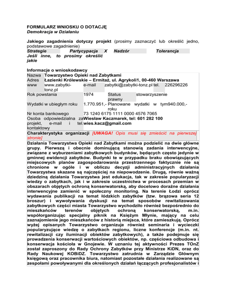 FORMULARZ WNIOSKU O DOTACJĘ Demokracja w Działaniu