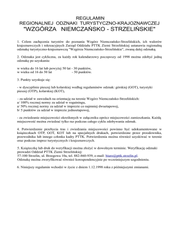 REGULAMIN REGIONALNEJ ODZNAKI TURYSTYCZNO-KRAJOZNAWCZEJ "WZGÓRZA NIEMCZAŃSKO - STRZELIŃSKIE" 1. Celem zachęcenia turystów do poznania Wzgórz Niemczańsko-Strzelińskich, ich walorów krajoznawczych i rekreacyjnych Zarząd Oddziału PTTK Ziemi Strzelińskiej ustanawia regionalną odznakę turystyczno-krajoznawczą "Wzgórza Niemczańsko-Strzelińskie", zwaną dalej odznaką. 2. Odznaka jest cykliczna, za każdy rok kalendarzowy począwszy od 1998 można zdobyć jedną odznakę po uzyskaniu: w wieku do 16 lat lub powyżej 50 lat - 30 punktów, w wieku od 16 do 50 lat - 50 punktów. 3. Punkty uzyskuje się: - w dyscyplinie pieszej lub kolarskiej według regulaminów odznak: górskiej (GOT), turystyki pieszej (OTP), kolarskiej (KOT), - za udział w zawodach na orientację na terenie Wzgórz Niemczańsko-Strzelińskich: a/ 100% rocznej normy za udział w rogainingu, a/ 50% rocznej normy za udział w imprezie co najmniej dwuetapowej, b/ 5 punktów za udział w imprezie jednoetapowej, - za zwiedzanie miejscowości określonych w załączniku oprócz miejscowości zamieszkania. Każdą miejscowość można zwiedzać tylko raz podczas całego cyklu zdobywania odznak. 4. Potwierdzenie przebycia tras i zwiedzania miejscowości powinno być udokumentowane w książeczkach OTP, GOT, KOT lub na specjalnych drukach, potwierdzone przez przodownika, przewodnika lub innego członka kadry PTTK. Potwierdzenia można również uzyskiwać w terenie oraz podczas imprez turystycznych i krajoznawczych. 5. Książeczkę lub druk do weryfikacji można złożyć w dowolnym terminie. Weryfikację odznaki prowadzi Oddział PTTK Ziemi Strzelińskiej: 57-100 Strzelin, ul. Brzegowa 10a, tel. 882-860-939, e-mail: [email protected]. Odznakę można zweryfikować również korespondencyjnie po wcześniejszym uzgodnieniu. 6. Niniejszy regulamin wchodzi w życie z dniem 1.12.1998 roku z późniejszymi zmianami. WYKAZ MIEJSCOWOŚCI I MIEJSC PUNKTOWANYCH DO ODZNAKI REGIONALNEJ „WZGÓRZA NIEMCZAŃSKO - STRZELIŃSKIE” 15 punktów: Bielawa, Dzierżoniów, Grodków, Henryków, Kamieniec Ząbkowicki, Niemcza, Pieszyce, Piława Górna, Strzelin, Ząbkowice Śląskie, Ziębice. 10 punktów: Biały Kościół, Biernacice, Bobolice, Bożnowice, Braszowice, Brochocin, Brodziszów, Ciepłowody, Czerńczyce, Dankowice, Dobroszów, Dobrzenice, Gilów, Gola Dzierżoniowska, Jeglowa, Jeszkotle, Kalinowice Dolne i Górne, Kietlin, Kobyla Głowa, Konary, Krzelków, Księginice Wielkie, Łagiewniki, Muszkowice i Kapliczne Wzgórze, Niedźwiednik, Nowolesie, Owiesno, Piława Dolna, Piotrowice Polskie, Prusy, Przerzeczyn Zdrój, Przeworno, rezerwat przyrody Muszkowicki Las Bukowy, rezerwat przyrody Skałki Stoleckie, Roztocznik, Sarby, Siemisławice, Sieniawka, Stolec, Stoszów, Sulisław, Wawrzyszów, wąwóz Piekielko i grodzisko, Wilków Wielki, Witostowice, Wojsławice, Zarzyca, Żeleźnik, Żelowice 5 punktów: każda inna miejscowość (lub miejsce) na terenie Wzgórz Niemczańsko-Strzelińskich, w której znajduje się co najmniej jeden obiekt zabytkowy lub krajoznawczy.