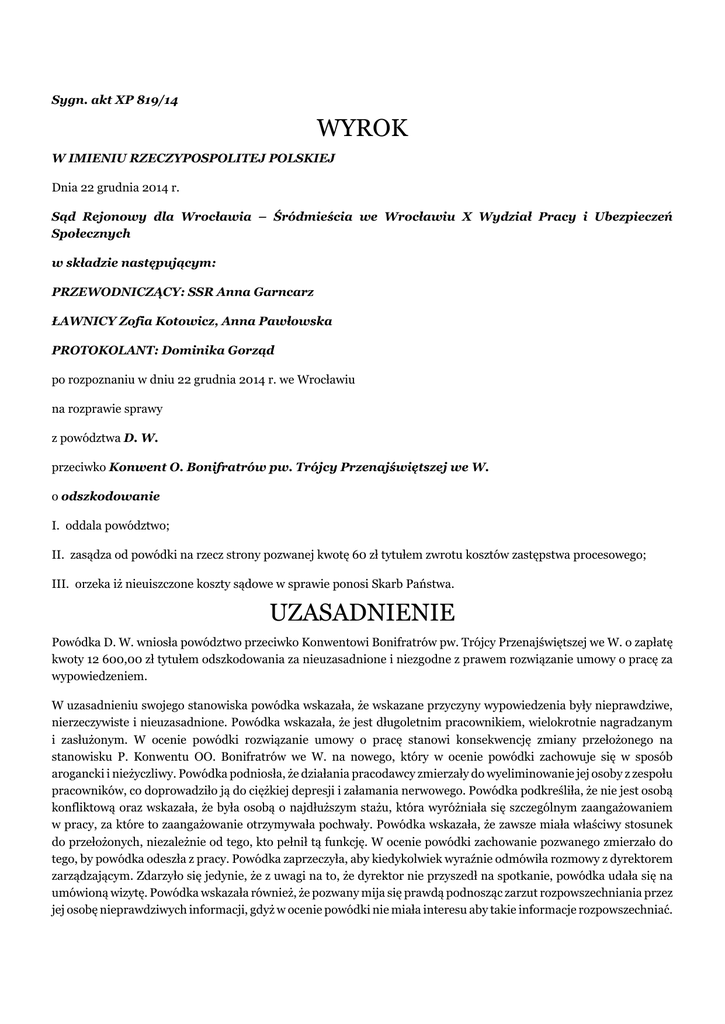 Sygn. akt XP 819/14 WYROK W IMIENIU RZECZYPOSPOLITEJ POLSKIEJ Dnia 22 grudnia 2014 r. Sąd Rejonowy dla Wrocławia – Śródmieścia we Wrocławiu X Wydział Pracy i Ubezpieczeń Społecznych w składzie następującym: PRZEWODNICZĄCY: SSR Anna Garncarz ŁAWNICY Zofia Kotowicz, Anna Pawłowska PROTOKOLANT: Dominika Gorząd po rozpoznaniu w dniu 22 grudnia 2014 r. we Wrocławiu na rozprawie sprawy z powództwa D. W. przeciwko Konwent O. Bonifratrów pw. Trójcy Przenajświętszej we W. o odszkodowanie I. oddala powództwo; II. zasądza od powódki na rzecz strony pozwanej kwotę 60 zł tytułem zwrotu kosztów zastępstwa procesowego; III. orzeka iż nieuiszczone koszty sądowe w sprawie ponosi Skarb Państwa. UZASADNIENIE Powódka D. W. wniosła powództwo przeciwko Konwentowi Bonifratrów pw. Trójcy Przenajświętszej we W. o zapłatę kwoty 12 600,00 zł tytułem odszkodowania za nieuzasadnione i niezgodne z prawem rozwiązanie umowy o pracę za wypowiedzeniem. W uzasadnieniu swojego stanowiska powódka wskazała, że wskazane przyczyny wypowiedzenia były nieprawdziwe, nierzeczywiste i nieuzasadnione. Powódka wskazała, że jest długoletnim pracownikiem, wielokrotnie nagradzanym i zasłużonym. W ocenie powódki rozwiązanie umowy o pracę stanowi konsekwencję zmiany przełożonego na stanowisku P. Konwentu OO. Bonifratrów we W. na nowego, który w ocenie powódki zachowuje się w sposób arogancki i nieżyczliwy. Powódka podniosła, że działania pracodawcy zmierzały do wyeliminowanie jej osoby z zespołu pracowników, co doprowadziło ją do ciężkiej depresji i załamania nerwowego. Powódka podkreśliła, że nie jest osobą konfliktową oraz wskazała, że była osobą o najdłuższym stażu, która wyróżniała się szczególnym zaangażowaniem w pracy, za które to zaangażowanie otrzymywała pochwały. Powódka wskazała, że zawsze miała właściwy stosunek do przełożonych, niezależnie od tego, kto pełnił tą funkcję. W ocenie powódki zachowanie pozwanego zmierzało do tego, by powódka odeszła z pracy. Powódka zaprzeczyła, aby kiedykolwiek wyraźnie odmówiła rozmowy z dyrektorem zarządzającym. Zdarzyło się jedynie, że z uwagi na to, że dyrektor nie przyszedł na spotkanie, powódka udała się na umówioną wizytę. Powódka wskazała również, że pozwany mija się prawdą podnosząc zarzut rozpowszechniania przez jej osobę nieprawdziwych informacji, gdyż w ocenie powódki nie miała interesu aby takie informacje rozpowszechniać. W odpowiedzi na pozew Konwent Bonifratrów pw. Trójcy Przenajświętszej we W. wniósł o oddalenie powództwa w całości i zasądzenia na swoją rzecz od powódki zwrotu kosztów procesu, w tym kosztów zastępstwa prawnego. W uzasadnieniu swojego stanowiska strona pozwana wskazała, że wbrew twierdzeniom powódki wszystkie przyczyny wypowiedzenia umowy o pracę mają charakter rzeczywisty, prawdziwy i konkretny. Niewłaściwy stosunek powódki do innych pracowników był wielokrotnie zgłaszany przez pracowników apteki jako istniejący i utrzymujący się od dłuższego czasu. Oczywistym w ocenie strony pozwanej jest brak umiejętności pracy w zespole, prowokowanie i wdawanie się w konflikty z pracownikami pozwanego, co stanowi przeszkodę w zatrudnianiu powódki. Jednocześnie strona pozwana podkreśliła, że sposobu wskazania przyczyn nie można uznać za niekonkretny, albowiem oświadczenie o rozwiązaniu umowy o pracę za wypowiedzeniem musi zostać sporządzony w sposób syntetyczny. Pozwany podkreślił, że stosunek powódki do przełożonych był negatywny, czego przykładem była sytuacja w dniu 23 stycznia 2013 r. podczas której powódka odmówiła rozmowy z dyrektorem zarządzającym nazywając go ,,gówniarzem’’ w obecności innych pracowników. W ocenie pozwanej tolerowanie zachowania powódki doprowadziłoby na naruszenia dyscypliny pracy. Odnośnie przyczyny rozpowszechniania informacji o zamknięciu apteki, w ocenie pozwanej, zachowanie powódki w tym zakresie było podyktowane chęcią zaszkodzenia nowym osobą zarządzającym. Strona pozwana zaznaczyła, że przyczyn wypowiedzenia umowy o pracę musi być rzeczywista i konkretna, ale bez szczególnej wagi czy doniosłości przy zwykłym rozwiązaniu umowy o pracę za wypowiedzeniem. Odnosząc się do zarzutów powódki strona pozwana wskazała, że w jej ocenie powódka nie zgodziła się ze zmianą przełożonych, w konsekwencji czego, zachowywała się w sposób impulsywny, niewłaściwy i działała na szkodę Konwentu. Sąd Rejonowy ustalił następujący stan faktyczny: D. W. była zatrudniona w aptece (...) pw. Trójcy Przenajświętszej we W. przy ulicy (...) we W. na czas nieokreślony na stanowisku technika farmacji w pełnym wymiarze czasu pracy od dnia 1 listopada 1999 r. Dowody: umowa o pracę z dn. 02.11.1999 r., umowa o pracę z dnia 31.12.2007 r. Średniomiesięczne wynagrodzenie powódki wynosiło 4 200,00 zł. Dowód: zaświadczenie o zarobkach k. 70. Na czele Konwentu Bonifratrów pw. Trójcy Przenajświętszej we W. stoi przeor. Do stycznia 2014 r. przeorem Konwentu był brat K. S., którego powódka znała od początku zatrudnienia i z którym pozostawała w bardzo dobrych relacjach. Od 24 stycznia 2014 r. nowym ojcem przeorem został brat Ł. D.. Kompleks aptek, punktów zielarskich nadzorował Dyrektor Zarządzający, który posiadał upoważnienie do składania oświadczeń woli w imieniu Konwentu Bonifratrów pw. Trójcy Przenajświętszej. Do marca 2014 r. dyrektorem zarządzającym był M. N., a następnie po nim M. S.. Bezpośrednią przełożoną powódki był kierownik apteki. Do stycznia 2014 r. funkcję tą sprawowała K. G. (1), a po niej E. M.. Dowód: zeznania świadków K. G. (1), E. M., M. S. k. 100 (płyta CD). Przesłuchanie w charakterze strony pozwanej Ł. D. k. 136 (płyta CD) Do obowiązków powódki należało: - wykonywanie pracy sumiennie i starannie oraz stosować się do poleceń przeł
