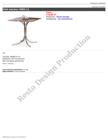 Informacje o produkcie Utworzono 07-03-2017 Stół marmur HMO-11 Cena : 279,00 zł Pr od uc ti o n Producent : Resto Design Dostępność : Na zamówienie Stół wymiary: 80/80/75 cm podstawa: stal chromowana blat: kompozyt polimerowy ig n kolor: marmur R es t o D es Czas realizacji zamówienia: 3-4 tyg. Opcje dostawy:: Cennik dostawy Wygenerowano w programie www.oscGold.com