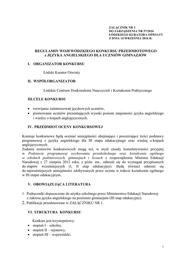 ZAŁĄCZNIK NR 2 DO ZARZĄDZENIA NR 57/2016 ŁÓDZKIEGO KURATORA OŚWIATY Z DNIA 14 WRZEŚNIA 2016 R. REGULAMIN WOJEWÓDZKIEGO KONKURSU PRZEDMIOTOWEGO z JĘZYKA ANGIELSKIEGO DLA UCZNIÓW GIMNAZJÓW I. ORGANIZATOR KONKURSU Łódzki Kurator Oświaty II. WSPÓŁORGANIZATOR Łódzkie Centrum Doskonalenia Nauczycieli i Kształcenia Praktycznego III. CELE KONKURSU rozwijanie zainteresowań językowych uczniów, promowanie uczniów prezentujących wysoki poziom znajomości języka angielskiego i wiedzy o krajach anglojęzycznych. IV. PRZEDMIOT OCENY KONKURSOWEJ Komisje konkursowe będą oceniać umiejętności obejmujące i poszerzające treści podstawy programowej z języka angielskiego dla III etapu edukacyjnego oraz wiedzę o krajach anglojęzycznych. Zadania zestawów konkursowych mogą też, w myśl zasady kumulatywności przyjętej w Podstawie programowej wychowania przedszkolnego oraz kształcenia ogólnego w szkołach podstawowych, gimnazjach i liceach z rozporządzenia Ministra Edukacji Narodowej z 27 sierpnia 2012 roku, z późn. zm., odnosić się do wymagań przypisanych do etapów wcześniejszych (I, II etap edukacyjny). Będą również odnosić się do najważniejszych umiejętności zdobywanych przez ucznia w trakcie kształcenia ogólnego w III etapie edukacyjnym. V. OBOWIĄZUJĄCA LITERATURA 1. Podręczniki dopuszczone do użytku szkolnego przez Ministerstwo Edukacji Narodowej z zakresu języka angielskiego na poziomie gimnazjum (III etap edukacyjny). 2. Publikacje przedstawione w ZAŁĄCZNIKU NR 1. VI. STRUKTURA KONKURSU Konkurs jest trzystopniowy: stopień I – szkolny, stopień II – rejonowy, stopień III – wojewódzki. 1 VII. ZGŁASZANIE UCZNIÓW DO KONKURSU 1. Zgłaszanie uczniów do udziału w konkursie odbywa się wyłącznie poprzez rejestrację w elektronicznym Systemie Obsługi Konkursów, zwanym dalej SOK od 1.10 do 14.10.2016r. Po tym terminie system nie będzie przyjmował zgłoszeń. 2. W eliminacjach konkursowych mogą brać udział wyłącznie uczniowie zgłoszeni w wyznaczonym terminie, których rodzice/prawni opiekunowie złożyli w szkole pisemną zgodę na przetwarzanie danych osobowych uczestników konkursu. 3. Przystąpienie ucznia do konkursu jest jednoznaczne z akceptacją regulaminu wojewódzkiego konkursu przedmiotowego oraz zgodą na przetwarzanie danych osobowych (imię i nazwisko, nazwa szkoły, uzyskany wynik i przyznany tytuł laureata/finalisty konkursu, imię i nazwisko nauczyciela/opiekuna). 4. Za zalogowanie gimnazjum i wpisanie danych uczniów odpowiedzialny jest dyrektor szkoły. VIII. TERMINARZ KONKURSU Eliminacje szkolne – 8 listopada 2016 o godz. 8.00 Eliminacje rejonowe – 12 stycznia 2017 o godz. 10.00 Eliminacje wojewódzkie – 7 marca 2017 o godz. 10.00 – część pisemna 7 marca 2017 o godz. 12.00 – część ustna i 8 marca 2017 o godz. 10.00 – część ustna (w przypadku większej liczby finalistów) Do części ustnej 7 marca o godz. 12.00 w pierwszej kolejności przystąpią uczestnicy spoza Łodzi. IX. SPOSÓB I TERMIN OGŁASZANIA WYNIKÓW 1.Wyniki eliminacji na poszczególnych stopniach konkursu będą umieszczane w SOK i na stronie internetowej ŁCDNiKP www.wckp.lodz.pl w części poświęconej konkursom. 2. Wyniki eliminacji na stopniu szkolnym zostaną ogłoszone 23 listopada 2016r. 3. Wyniki eliminacji na stopniu rejonowym zostaną ogłoszone 30 stycznia 2017r. 4. Wyniki eliminacji na stopniu wojewódzkim zostaną ogłoszone 10 marca 2017r. 5. Listy uczniów zakwalifikowanych do eliminacji rejonowych i do eliminacji wojewódzkich będą ogłoszone po zakończeniu procedur odwoławczych. 6. Lista laureatów i finalistów Wojewódzkiego Konkursu Przedmiotowego z Języka Angielskiego, po zatwierdzeniu przez Łódzkiego Kuratora Oświaty, zostanie ogłoszona na stronie internetowej Łódzkiego Centrum Doskonalenia Nauczycieli i Kształcenia Praktycznego www.wckp.lodz.pl w części poświęconej konkursom najpóźniej do 31 marca 2017 r. X. MIEJSCE PRZEPROWADZENIA ELIMINACJI KONKURSOWYCH 1. Informacje o miejscach przeprowadzenia eliminacji zostaną podane na stronie internetowej Łódzkiego Centrum Doskonalenia Nauczycieli i Kształcenia Praktycznego. 2. Eliminacje szkolne – szkoły, w których dyrektorzy powołali Szkolne Komisje Konkursowe. 3. Eliminacje rejonowe – szkoły lub placówki wskazane przez pracowników Kuratorium Oświaty w Łodzi. 2 4. Eliminacje wojewódzkie – szkoła lub placówka wskazana przez Wojewódzką Komisję Konkursową w porozumieniu z Kuratorium Oświaty w Łodzi. XI. PRZEBIEG KONKURSU A. ELIMINACJE SZKOLNE 1.Eliminacje szkolne są przeprowadzane w formie pisemnej. 2. Wojewódzka Komisja Konkursowa udostępnia w SOK testy na eliminacje szkolne w przeddzień terminu ogłoszonego w regulaminie. W przypadku eliminacji odbywających się w poniedziałek dniem udostępnienia testu jest piątek. Model odpowiedzi, schemat punktowania oraz karta protokołu z przebiegu eliminacji zostanie udostępniona w SOK po zakończeniu eliminacji szkolnych. 3.Szkolna Komisja Konkursowa powiela zestaw zadań dla każdego uczestnika eliminacji. 4.Do obowiązków Szkolnej Komisji Konkursowej należy zapewnienie warunków niezbędnych do prawidłowego przebiegu eliminacji szkolnych, w tym: sali (przestronnej, dobrze oświetlonej, z odpowiednią akustyką), możliwości indywidualnej i samodzielnej pracy uczniów. 5.Prace uczestników eliminacji szkolnych są kodowane w sposób określony przez Szkolną Komisję Konkursową. 6. Test składa się z dwóch części: część I – czytanie ze zrozumieniem tekstu i/lub dialogu (tekst/dialog może zawierać elementy wiedzy krajoznawczej) część II – sprawdzian gramatyczno-leksykalny z elementami wiedzy krajoznawczej. 7.Polecenia do zadań konkursowych są sformułowane wyłącznie w języku polskim. 8.Na rozwiązanie testu konkursowego podczas eliminacji szkolnych przeznacza się 60 minut, nie włączając czasu na sprawy organizacyjne. 9.Do eliminacji re