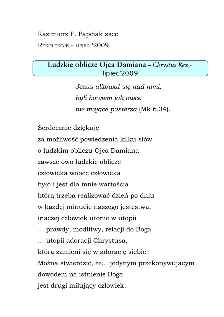 Kazimierz F. Papciak sscc REKOLEKCJE - LIPIEC ‘2009 Ludzkie oblicze Ojca Damiana – Chrystus Rex lipiec’2009 Jezus ulitował się nad nimi, byli bowiem jak owce nie mające pasterza (Mk 6,34). Serdecznie dziękuję za możliwość powiedzenia kilku słów o ludzkim obliczu Ojca Damiana zawsze owo ludzkie oblicze człowieka wobec człowieka było i jest dla mnie wartością którą trzeba realizować dzień po dniu w każdej minucie naszego jestestwa. inaczej człowiek utonie w utopii … prawdy, modlitwy, relacji do Boga … utopii adoracji Chrystusa, która zamieni się w adorację siebie! Można stwierdzić, że… jedynym przekonywującym dowodem na istnienie Boga jest drugi miłujący człowiek. 2 Co znaczy „Ludzkie oblicze”? Czy jest to oblicze – obraz Boga w człowieku? Oblicze przyjaciela… A może oblicze wroga? według zasady „homo homini lupus” Człowiek idąc przez życie zostawia ślad Czy drugi człowiek idąc tym śladem: • Dojdzie do nieba czy do piekła? • Do dobra czy do zła? • Do radości czy do smutku? • Do uśmiechu czy grymasu na twarzy? • Do pokoju czy do wojny? • Do harmonii czy do chaosu • Do nadziei czy do rozpaczy? To są pytania o ludzkie oblicze człowieka i chrześcijanina… naszego chrześcijaństwa i naszej wiary. Człowiek stwarza wokół siebie świat czy dla drugiego człowieka jest miejsce w tym świecie? czy jest miejsce dla tego, który myśli, czuje, modli się inaczej? 3 czy ów drugi może poczuć się w tym świecie bezpiecznie… jak u siebie? czy może liczyć na zrozumienie i wsparcie? To są kolejne pytania o ludzkie oblicze naszego postępowania… Dlaczego Ojciec Damian został święty? O czym mówią dokumenty i świadkowie? Przede wszystkim o owym …heroicznie ludzkim obliczu wobec drugiego człowieka obok wiarę w Boga manifestował heroiczną miłością bliźniego. U podstaw ludzkiego oblicza św. Damiana stała wiara - wiara w Boga …ale i wiara w człowieka. Bardzo często Ewangelie prezentują nam dwie różne postawy, jakie w odniesieniu do rzesz ludzkich mają Apostołowie i Chrystus. Apostołowie czują się bezradni wobec kłopotliwych sytuacji, szczególnie gdy trzeba ludziom przyjść z pomocą. Nie widząc lepszych rozwiązań, mówią do Chrystusa: 4 Panie rozpuść rzesze, niech idą do okolicznych wsi i zagród, tam znajdą schronienie i żywność. Chrystus nie zgadza się na te propozycje i przedstawia swoje stanowisko: Wy musicie się o nich zatroszczyć, to jest wasz pierwszy i podstawowy obowiązek. Chrześcijanin katolik nie może przejść obojętnie obok potrzebującego człowieka. Chrześcijaństwo bowiem to nie system, to nie teoria, filozofia. Chrześcijaństwo to przede wszystkim życie. Dlatego chrześcijanin musi zaradzać potrzebom życia i musi być na nie uwrażliwiony. Musi myśleć nie tylko o sobie, ale i o innych. W swojej najnowszej encyklice społecznej papież Benedykt XVI stwierdza: Miłość w prawdzie stawia człowieka wobec zadziwiającego doświadczenia daru. Bezinteresowność jest obecna w jego życiu w rozlicznych formach (…) 5 Benedykt XVI, Enc. Caritas in veritate, nr 34. Jest prawdą, że ludzkie oblicze Damiana znajduje swe źródło w ludzkim obliczu Boga-Człowieka Jezusa z Nazaretu Dlaczego Chrystus i Damian mieli tak czułe i wrażliwe serce dla innych? Dlaczego ze wszystkich wartości tak wysoko oceniali człowieka? Bo tak Chrystus jak i Damian patrzyli na ludzi jak na swoje siostry i na swoich braci. Widzieli w nich obraz Boga, widzieli stworzenie, często tak bardzo bezradne i potrzebujące Boga. Postawa Jezusa i Damiana względem innych wyrażała się przede wszystkim wychodzeniem na spotkanie człowieka. Nie czekali, że ludzie poproszą o pomoc. Jezus Chrystus sam szedł z pomocą. Nie oglądał się na rezultaty i na skutki swego działania bo wychodził z założenia, że nieść ludziom zbawienie, 6 to znaczy nieustannie działać, nieustannie być razem z nimi, do końca i bez końca im pomagać, idąc z każdym człowiekiem po ścieżkach życia. Tak czynił Jezus Chrystus… a Damian? Damian podążał za wzorem Mistrza! Dlatego ciągle dostrzegał w nich to, czego im brakowało. Jego pomoc szła w dwóch kierunkach: zaspakajała potrzeby przyrodzone i nadprzyrodzone człowieka. Dawał ludziom chleb i dach nad głową ale i odpuszczał grzechy… dawał nadzieję. Takim działaniem obejmował całego człowieka, w jego wymiarze tak duchowym jak i cielesnym. Jeśli dziś chcemy pomóc drugiemu, Jeśli chcemy iść za wzorem św. Damiana, to przede wszystkim pamiętajmy o tym, że pomagamy całemu człowiekowi… temu człowiekowi, który jest głodny chleba, ale który równie często jest głodny prawdy, który pragnie wartości materialnych, 7 bo bez nich nie może się obejść, ale także pragnie dla siebie strawy duchowej. Nieśmy mu jedno i drugie. Nasza roztropność powie nam, w jakich rozsądnych proporcjach mamy ludziom rozdawać te wartości. Papież Benedykt XVI w cytowanej już encyklice społecznej ukazuje nam dwa drogowskazy: Miłość i Prawdę a właściwie miłość w prawdzie (Caritas in veritate), Miłość nazywa… królewską drogą nauki społecznej Kościoła Prawdę zaś ukazuje jako tę, która… oczyszcza nasze umysły i nasze sumienia. Tak pojętej trosce o człowieka będzie na pewno towarzyszyła łaska boża. Będzie to spełnianie naszej apostolskiej misji. Pamiętajmy o tym, że być apostołem, to przede wszystkim być zawsze i we wszystkich okolicznościach życia… człowiekiem. … to także naśladować ludzkie oblicze Jezusa … ludzkie oblicze św. Damiana de Veuster 8 We Mszy świętej, w której obecnie uczestniczymy staje przed nami Bóg, który także był człowiekiem. Jako nasz brat w człowieczeństwie Chrystus objawił nam i objawia nieustannie Swoje prawdziwie ludzkie oblicze… Jaka jest nasza odpowiedź ? Jaka jest nasza reakcja …jakie wnioski? Prośmy Jezusa … za wstawiennictwem
