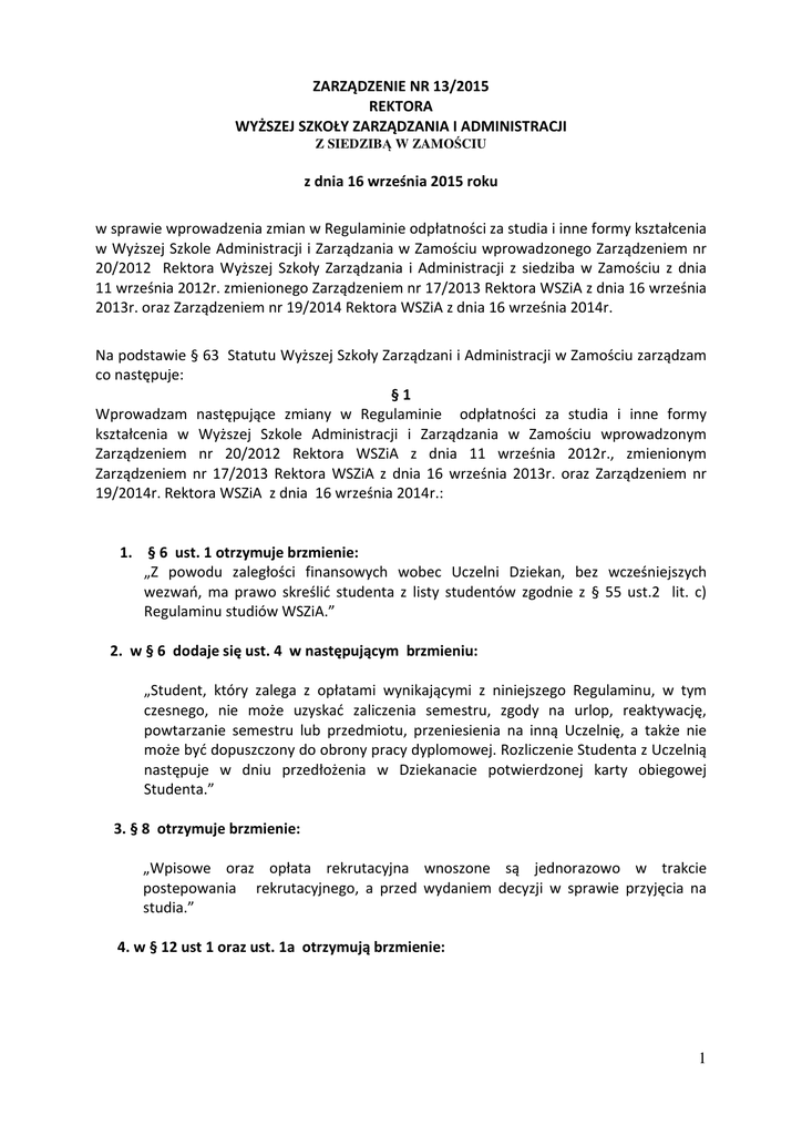 ZARZĄDZENIE NR 13/2015 REKTORA WYŻSZEJ SZKOŁY ZARZĄDZANIA I ADMINISTRACJI Z SIEDZIBĄ W ZAMOŚCIU z dnia 16 września 2015 roku w sprawie wprowadzenia zmian w Regulaminie odpłatności za studia i inne formy kształcenia w Wyższej Szkole Administracji i Zarządzania w Zamościu wprowadzonego Zarządzeniem nr 20/2012 Rektora Wyższej Szkoły Zarządzania i Administracji z siedziba w Zamościu z dnia 11 września 2012r. zmienionego Zarządzeniem nr 17/2013 Rektora WSZiA z dnia 16 września 2013r. oraz Zarządzeniem nr 19/2014 Rektora WSZiA z dnia 16 września 2014r. Na podstawie § 63 Statutu Wyższej Szkoły Zarządzani i Administracji w Zamościu zarządzam co następuje: §1 Wprowadzam następujące zmiany w Regulaminie odpłatności za studia i inne formy kształcenia w Wyższej Szkole Administracji i Zarządzania w Zamościu wprowadzonym Zarządzeniem nr 20/2012 Rektora WSZiA z dnia 11 września 2012r., zmienionym Zarządzeniem nr 17/2013 Rektora WSZiA z dnia 16 września 2013r. oraz Zarządzeniem nr 19/2014r. Rektora WSZiA z dnia 16 września 2014r.: 1. § 6 ust. 1 otrzymuje brzmienie: „Z powodu zaległości finansowych wobec Uczelni Dziekan, bez wcześniejszych wezwań, ma prawo skreślić studenta z listy studentów zgodnie z § 55 ust.2 lit. c) Regulaminu studiów WSZiA.” 2. w § 6 dodaje się ust. 4 w następującym brzmieniu: „Student, który zalega z opłatami wynikającymi z niniejszego Regulaminu, w tym czesnego, nie może uzyskać zaliczenia semestru, zgody na urlop, reaktywację, powtarzanie semestru lub przedmiotu, przeniesienia na inną Uczelnię, a także nie może być dopuszczony do obrony pracy dyplomowej. Rozliczenie Studenta z Uczelnią następuje w dniu przedłożenia w Dziekanacie potwierdzonej karty obiegowej Studenta.” 3. § 8 otrzymuje brzmienie: „Wpisowe oraz opłata rekrutacyjna wnoszone są jednorazowo w trakcie postepowania rekrutacyjnego, a przed wydaniem decyzji w sprawie przyjęcia na studia.” 4. w § 12 ust 1 oraz ust. 1a otrzymują brzmienie: 1 § 12 „ 1. Studenci studiów stacjonarnych i niestacjonarnych I stopnia na wszystkich kierunkach studiów, opłacają w 8 ratach roczne czesne, za okres od października do lipca danego roku akademickiego. Raty należy uiszczać wg ustalonego poniżej harmonogramu: Termin płatności WYSOKOŚĆ RAT Wydział Zarządzania i Administracji Finanse i rachunkowość Administracja Budownictwo Informatyka Stacjonarne Niestacjonarne Stacjonarne Niestacjonarne Stacjonarne Niestacjonarne Do 10.10 390,00 zł 360,00 zł 390,00 zł 360,00 zł 410,00 zł 410,00 zł 410,00 zł 390,00 zł Do 10.11 390,00 zł 360,00 zł 390,00 zł 360,00 zł 410,00 zł 410,00 zł 410,00 zł 390,00 zł Do 10.12 390,00 zł 360,00 zł 390,00 zł 360,00 zł 410,00 zł 410,00 zł 410,00 zł 390,00 zł 780,00zł 720,00zł 780,00 zł 720,00 zł 820,00 zł 820,00 zł 820,00 zł 780,00 zł 390,00 zł 360,00 zł 390,00 zł 360,00 zł 410,00 zł 410,00 zł 410,00 zł 390,00 zł Do 10.04 390,00 zł 360,00 zł 390,00 zł 360,00 zł 410,00 zł 410,00 zł 410,00 zł 390,00 zł Do 10.05 390,00 zł 360,00 zł 390,00 zł 360,00 zł 410,00 zł 410,00 zł 410,00 zł 390,00 zł Do 05.06 (za czerwiec i lipiec) 780,00 zł 720,00 zł 780,00 zł 720,00 zł 820,00 zł 820,00 zł 820,00 zł 780,00 zł Do 5.01 (za styczeń i luty) Do 10.03 Termin płatności Do 10.10 Do 10.11 Do 10.12 Do 5.01 Stacjonarne Niestacjonarne WYSOKOŚĆ RAT Wydział Fizjoterapii i Pedagogiki Fizjoterapia Stacjonarne Niestacjonarne 435,00 zł 435,00 zł 435,00 zł 870,00 zł 410,00 zł 410,00 zł 410,00 zł 820,00 zł 435,00 zł 435,00 zł 435,00 zł 870,00 zł 410,00 zł 410,00 zł 410,00 zł 820,00 zł (za styczeń i luty) Do 10.03 Do 10.04 Do 10.05 Do 05.06 (za czerwiec i lipiec) 1.aStudenci studiów pierwszego stopnia na kierunku „fizjoterapia”, którzy rozpoczęli kształcenie od roku akademickiego 2014/2015 i w latach następnych opłacają w 8 ratach 2 roczne czesne, za okres od października do lipca danego roku akademickiego w kwocie i terminach według ustalonego poniżej harmonogramu: Termin Płatności Do 10.10 Do 10.11 Do 10.12 Do 05.01 (za styczeń i luty) Do 10.03 Do 10.04 Do 10.05 Do 05.06 (za czerwiec i lipiec Wysokość Rat Fizjoterapia Studia stacjonarne Studia niestacjonarne 450,00 zł 410,00 zł 450,00 zł 410,00 zł 450,00 zł 410,00 zł 900,00 zł 820,00 zł 450,00 zł 450,00 zł 450,00 zł 900,00 zł 410,00 zł 410,00 zł 410,00 zł 820,00 zł 5. w rozdz. IV skreśla się §§19,20,21 oraz § 32; 6. po § 22 dodaje się § 23 w następującym brzmieniu: „1. Opłata za realizację jednego przedmiotu w ramach awansu na kolejny semestr wynosi 200 zł. Opłata obejmuje realizację wszystkich niezaliczonych form zajęć z przedmiotu objętego awansem. 2. Opłata, o której mowa w ust. 1 powinna być wniesiona najpóźniej w dniu złożenia wniosku do Dziekana o awans.” §2 Pozostałe postanowienia Regulaminu odpłatności za studia i inne formy kształcenia w Wyższej Szkole Administracji i Zarządzania w Zamościu pozostają bez zmian. §3 Ogłaszam jednolity tekst Regulaminu odpłatności za studia i inne formy kształcenia w Wyższej Szkole Administracji i Zarządzania w Zamościu o treści stanowiącej załącznik do niniejszego zarządzenia. §4 Zmieniony Regulamin odpłatności za studia i inne formy kształcenia w Wyższej Szkole Administracji i Zarządzania w Zamościu wchodzi w życie od początku roku akademickiego 2014/2015. §5 Zarządzenie wchodzi w życie z dniem podpisania. Rektor Wyższej Szkoły Administracji i Zarządzania w Zamościu dr inż. Krzysztof Pancerz 3 Załącznik do Zarządzenia nr 13/2015 Rektora WSZiA z dnia 16 września 2015 roku Regulamin odpłatności za studia i inne formy kształcenia w Wyższej Szkole Zarządzania i Administracji z siedzibą w Zamościu ( tekst jednolity) 1. Regulamin niniejszy ustala: a) wysokość i zasady wnoszenia wpisowego i opłaty rekrutacyjnej dla kandydatów na wszystkie kierunki studiów, 