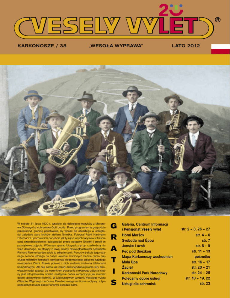 KARKONOSZE / 38 „WESOŁA WYPRAWA” W sobotę 31 lipca 1920 r. wspięło się dziesięciu muzyków z Marszowa Górnego ku schronisku Obří bouda. Przed programem w gospodzie przekroczyli granicę państwową, by wpaść do otwartego w odległości zaledwie paru kroków atelieru Śnieżka. Fotograf Adolf Hartmann z Karpacza upozował ich podobnie jak tysiące innych turystów w trakcie swej czterdziestoletniej działalności przed obrazem Śnieżki i zrobił im pamiątkowe zdjęcie. Wówczas aparat fotograficzny był rzadkością nic więc dziwnego, że stojący z lewej strony dziewiętnastoletni perkusista Richard Renner bardzo sobie to zdjęcie cenił. Ponoć w trakcie tegorocznego sezonu letniego na całym świecie zrobionych będzie około pięciuset miliardów fotografii, czyli ponad siedemdziesiąt zdjęć na każdego mieszkańca Ziemi. Prawie połowa z nich zostanie zrobiona telefonami komórkowymi. Ale tak samo jak przed dziewięćdziesięcioma laty obowiązuje nadal zasada, że warunkiem powstania ciekawego zdjęcia istotny jest fotografowany obiekt, następnie dobra kompozycja jak również dobre opanowanie techniki. W jubileuszowym wydaniu Veselego vyletu (Wesołej Wyprawy) zwrócimy Państwa uwagę na liczne motywy: z tym pozostałym muszą sobie Państwo poradzić sami. G R A T I S LATO 2012 Galeria, Centrum Informacji i Pensjonat Veselý výlet Horní Maršov Svoboda nad Úpou Janské Lázně Pec pod Sněžkou Mapa Karkonoszy wschodnich Malá Úpa Žacléř Karkonoski Park Narodowy Polecamy dobre usługi Usługi dla schronisk str. 2 – 3, 26 – 27 str. 4 – 6 str. 7 str. 8 – 9 str. 11 – 13 pośrodku str. 16 – 17 str. 20 – 21 str. 24 – 25 str. 18 – 19, 22 str. 23 2 BOHDAN HOLOMÍČEK Pierwsze zdjęcia Bohdana były zdjęciami rodzinnymi. W roku 1958 rodzice mieli jeszcze gospodarstwo. Później wraz z tysiącami innych ludzi sfotografował i wyróżniające się postaci. Takie jak na przykład alpinista Mirek Šmid w 1981 roku. Na fotografiach z wystawy w Pecu pod Śnieżką można rozpoznać również przyjaciół Veselego vyletu takich jak kolega i kolekcjoner Tonda Tichý czy wędrowiec Jarda Hofman alias Szary Wilk. Tylko wtajemniczeni zrozumieją z podpisu „Jirka nas zabrał z sobą“, że chodzi o pejzażystę Jiřígo Havla przygotowującego ekspozycję fotografii wschodu słońca na Zlatym návrší prawdopodobnie w 1981 roku. w Veselym výlecie Jestem zdania, że fotografowanie jest ograniczone dwoma biegunami. Kiedy czegoś niesposób ująć muszę przyznać sam sobie, że: „Istnieją rzeczy, które muszę sobie zapamiętać“. Przeciwnym biegunem jest uświadomoenie sobie, że „Czego nie ma na fotografii, to jakby w ogóle nie zaistniało“. Szanowny przyjaciel Veselego vyletu fotografik Bohdan Holomíček tej pierwszej możliwości w ogóle nie bierze pod uwagę. Dlatego być może zwiecznił tysiące wydarzeń i ich uczestników. Wybór wystawy z okazji dwudziestej rocznicy założenia galerii i centrum informacyjnego Veselý výlet był wobec powyższego juednoznaczny i znany na długo przed obchodami jubileuszu. Fenomen fotografii czeskiej pocieszył nas bogactwem wyboru. Dla galerii w Pecu przygotował zdjęcia z całej pięćdziesięcio pięcio letniej twórczości włącznie z fotografiami krajobrazu z pierwszych lat jego karfiery fotografika. Krajobrazy Bohdana ożywiają postaci, samochody w ruchu, pociąg, transparent albo przynajmniej włożona własna ręka. Obok kilku dużych formatów większość powierzchni ekspozycji „wytapetował“ setkami fotografii jego tradycyjnego formatu A4. Starsze w ciemni ręcznie powiększane fotografie są wykonane na papierze fotograficznym zwanym dokument natomiast młodsze i cyfrowe na papierze fotograficznym z tworzywem sztucznym. Fotografie cyfrowe Bohdana wyswobodziły z ciemni, w której spędził lata. Całkowicie zmienił swoje podejście do prezentacji swoich zdęć. Podobnie jak sam stworzył własny originalny styl w fotografii tradycyjnej ożywionej pisanymi zwyczajnym ołówkiem podpisami ma i nowy etap jego twórczości zdecydowanie Holomíčkovy rękopis. Podczas autorskiej prezentacji przy pomocy sekwencji sfotografowane ujęcia albo rozrusza lub przy pomocy kombinacji numerycznie opracowanych fotografii starszych i najnowszych z lat ostatnich stwarza kompozycje najczęściej sformowane wzdłuż osi chronologicznej. Na wernisarzu 9 czerwca wyświetlił swoją najbardziej osobistą projekcję „Wspominanie o Waclawie Havlu i czasach, w których żyliśmy”. Na wystawę przygotował do dwóch numerycznych ramek fotograficznych projekcje kolejnych serii jak również te z wernisażu. Jeżeli chcecie wystawę w Pecu obejrzeć na pewno rezerwujcie sobie na to więcej czasu niż piętnaście minut. Kiedy 1 maja dowiedziałem się od strażaków ochotniczej straży pożarnej, że w nocy spłonęła jedna z najstarszych chałup numer 12 w Górnej Małej Upie było mi zabytku bardzo żal. Znam jej budowlany „życiorys“ podobnie jak genealogię jej właścicieli aż do XVIII wieku. Ale równocześnie uświadomiłem sobie, że mam ją, że conajmniej parę razy ją fotografowałem z zewnątrz do naszego archiwum. Podczas ostatniej wizyty spytałem się Bohdana, czy ma to tak samo z ludźmi. Zapewnił mnie, że już dawno zna to uczucie. I opowiedział mi jedną historyjkę. Bohdan Holomíček pozostał do samego końca najbliższym przyjacielem Václava Havla i dlatego mógł w ciągu trzydziestu ośmiu lat stworzyć unikatową kolekcję fotografii znanego dramatopisarza, prześladowanego dysydenta i wreszcie ulubionego prezydenta. Wkrótce po pierwszej wizycie na Hrádečku w maju 1974 roku wziął Václav Havel papier i napisał listę czołowych przedstawicieli czeskiej nieoficjalnej kultury i elity duchowej z sugestią uwiecznienia tych ludzi na fotogfrafiach. Między innymi znaleźli się na tej liście poeta i plastyk Jiří Kolář, filmowiec Pavel Juráček, pisarze Zden