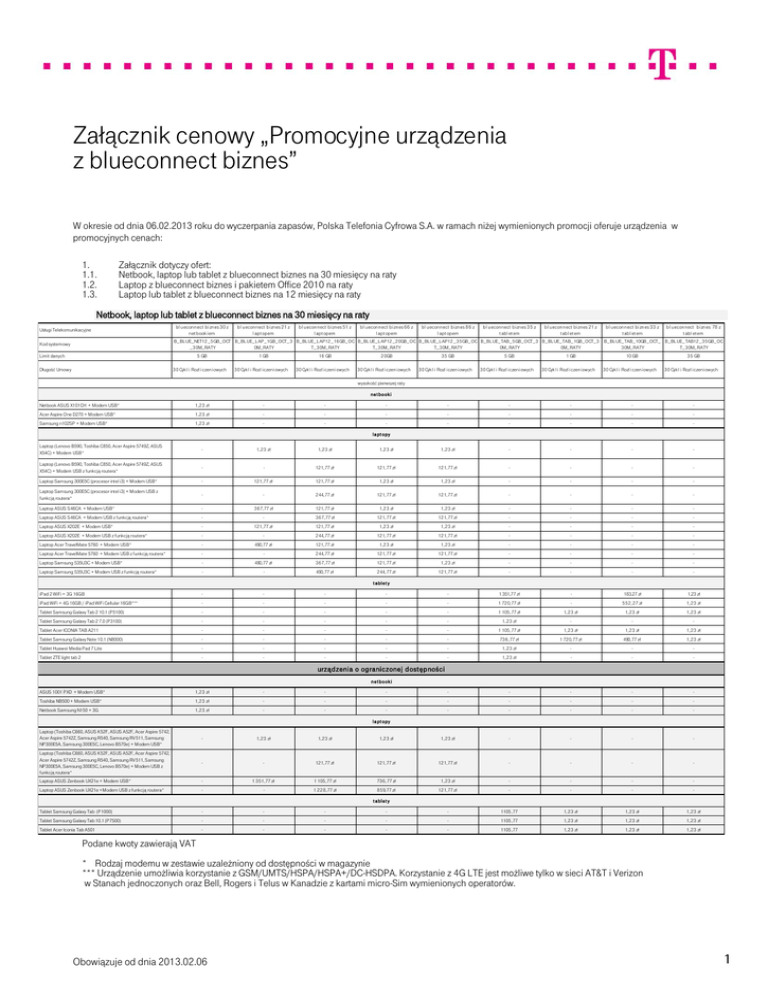 Załącznik cenowy „Promocyjne urządzenia z blueconnect biznes” W okresie od dnia 06.02.2013 roku do wyczerpania zapasów, Polska Telefonia Cyfrowa S.A. w ramach niżej wymienionych promocji oferuje urządzenia w promocyjnych cenach: 1. 1.1. 1.2. 1.3. Załącznik dotyczy ofert: Netbook, laptop lub tablet z blueconnect biznes na 30 miesięcy na raty Laptop z blueconnect biznes i pakietem Office 2010 na raty Laptop lub tablet z blueconnect biznes na 12 miesięcy na raty Netbook, laptop lub tablet z blueconnect biznes na 30 miesięcy na raty Usługi Telekomunikacyjne bl ueconnect biznes 30 z net book iem bl ueconnect biznes 21 z l apt opem bl ueconnect biznes 51 z l apt opem bl ueconnect biznes 66 z l apt opem bl ueconnect biznes 86 z l apt opem bl ueconnect biznes 35 z t abl et em bl ueconnect biznes 21 z t abl et em bl ueconnect biznes 33 z t abl et em bl ueconnect biznes 78 z t abl et em B_BLUE_NET12_5GB_OCT B_BLUE_LAP_1GB_OCT_3 B_BLUE_LAP12_16GB_OC B_BLUE_LAP12_20GB_OC B_BLUE_LAP12_35GB_OC B_BLUE_TAB_5GB_OCT_3 B_BLUE_TAB_1GB_OCT_3 B_BLUE_TAB_10GB_OCT_ B_BLUE_TAB12_35GB_OC _30M_RATY 0M_RATY T_30M_RATY T_30M_RATY T_30M_RATY 0M_RATY 0M_RATY 30M_RATY T_30M_RATY Kod systemowy Limit danych 5 GB Długość Umowy 30 Cyk l i Rozl iczeniowych 1 GB 30 Cyk l i Rozl iczeniowych 16 GB 30 Cyk l i Rozl iczeniowych 20GB 30 Cyk l i Rozl iczeniowych 35 GB 30 Cyk l i Rozl iczeniowych 5 GB 30 Cyk l i Rozl iczeniowych 1 GB 30 Cyk l i Rozl iczeniowych 10 GB 30 Cyk l i Rozl iczeniowych 35 GB 30 Cyk l i Rozl iczeniowych wysokość pierwszej raty ne t book i Netbook ASUS X101CH + Modem USB* 1,23 zł - - - - - - - - Acer Aspire One D270 + Modem USB* 1,23 zł - - - - - - - - Samsung n102SP + Modem USB* 1,23 zł - - - - - - - - la pt opy Laptop (Lenovo B590, Toshiba C850, Acer Aspire 5749Z, ASUS X54C) + Modem USB* - Laptop (Lenovo B590, Toshiba C850, Acer Aspire 5749Z, ASUS X54C) + Modem USB z funkcją routera* Laptop Samsung 300E5C (procesor intel i3) + Modem USB* 1,23 zł 1,23 zł 1,23 zł 1,23 zł - - - - - - 121,77 zł 121,77 zł 121,77 zł - - - - - 121,77 zł 121,77 zł 1,23 zł 1,23 zł - - - - Laptop Samsung 300E5C (procesor intel i3) + Modem USB z funkcją routera* - - 244,77 zł 121,77 zł 121,77 zł - - - - Laptop ASUS S46CA + Modem USB* - 367,77 zł 121,77 zł 1,23 zł 1,23 zł - - - - Laptop ASUS S46CA + Modem USB z funkcją routera* - - 367,77 zł 121,77 zł 121,77 zł - - - - Laptop ASUS X202E + Modem USB* - 121,77 zł 121,77 zł 1,23 zł 1,23 zł - - - - Laptop ASUS X202E + Modem USB z funkcją routera* - - 244,77 zł 121,77 zł 121,77 zł - - - - Laptop Acer TravelMate 5760 + Modem USB* - 490,77 zł 121,77 zł 1,23 zł 1,23 zł - - - - Laptop Acer TravelMate 5760 + Modem USB z funkcją routera* - - 244,77 zł 121,77 zł 121,77 zł - - - - Laptop Samsung 535U3C + Modem USB* - 490,77 zł 367,77 zł 121,77 zł 1,23 zł - - - - Laptop Samsung 535U3C + Modem USB z funkcją routera* - - 490,77 zł 244,77 zł 121,77 zł - - - - t a ble t y iPad 2 WiFi + 3G 16GB - - - - - 1 351,77 zł - 183,27 zł 1,23 zł iPad WiFi + 4G 16GB / iPad WiFi Cellular 16GB*** - - - - - 1 720,77 zł - 552,27 zł 1,23 zł Tablet Samsung Galaxy Tab 2 10.1 (P5100) - - - - - 1 105,77 zł 1,23 zł 1,23 zł 1,23 zł Tablet Samsung Galaxy Tab 2 7.0 (P3100) - - - - - 1,23 zł - - - Tablet Acer ICONIA TAB A211 - - - - - 1 105,77 zł 1,23 zł 1,23 zł 1,23 zł Tablet Samsung Galaxy Note 10.1 (N8000) - - - - - 736,77 zł 1 720,77 zł 490,77 zł 1,23 zł Tablet Huawei Media Pad 7 Lite - - - - - 1,23 zł - - - Tablet ZTE light tab 2 - - - - - 1,23 zł - - - urządzenia o ograniczonej dostępności ne t book i ASUS 1001 PXD + Modem USB* 1,23 zł - - - - - - - - Toshiba NB500 + Modem USB* 1,23 zł - - - - - - - - Netbook Samsung N150 + 3G 1,23 zł - - - - - - - - la pt opy Laptop (Toshiba C660, ASUS K52F, ASUS A52F, Acer Aspire 5742, Acer Aspire 5742Z, Samsung R540, Samsung RV511, Samsung NP300E5A, Samsung 300E5C, Lenovo B570e) + Modem USB* - 1,23 zł 1,23 zł 1,23 zł 1,23 zł - - - - Laptop (Toshiba C660, ASUS K52F, ASUS A52F, Acer Aspire 5742, Acer Aspire 5742Z, Samsung R540, Samsung RV511, Samsung NP300E5A, Samsung 300E5C, Lenovo B570e) + Modem USB z funkcją routera* - - 121,77 zł 121,77 zł 121,77 zł - - - - Laptop ASUS Zenbook UX21e + Modem USB* - 1 351,77 zł 1 105,77 zł 736,77 zł 1,23 zł - - - - Laptop ASUS Zenbook UX21e +Modem USB z funkcją routera* - - 1 228,77 zł 859,77 zł 121,77 zł - - - - t a ble t y Tablet Samsung Galaxy Tab (P1000) - - - - - 1105,77 1,23 zł 1,23 zł 1,23 zł Tablet Samsung Galaxy Tab 10.1 (P7500) - - - - - 1105,77 1,23 zł 1,23 zł 1,23 zł Tablet Acer Iconia Tab A501 - - - - - 1105,77 1,23 zł 1,23 zł 1,23 zł Podane kwoty zawierają VAT * Rodzaj modemu w zestawie uzależniony od dostępności w magazynie *** Urządzenie umożliwia korzystanie z GSM/UMTS/HSPA/HSPA+/DC-HSDPA. Korzystanie z 4G LTE jest możliwe tylko w sieci AT&T i Verizon w Stanach jednoczonych oraz Bell, Rogers i Telus w Kanadzie z kartami micro-Sim wymienionych operatorów. Obowiązuje od dnia 2013.02.06 1 Załącznik cenowy „Promocyjne urządzenia z blueconnect biznes” Laptop z blueconnect biznes i pakietem Office na 30 miesięcy na raty Usługi Telekomunikacyjne bl ueconnect biznes 119 z l apt opem i pak iet em Office bl ueconnect biznes 99 z l apt opem i pak iet em Office Kod systemowy B_BLUE_LAP_16GB_OFF_30M_RATY B_BLUE_LAP_3GB_OFF_30M_RATY Limit danych Długość Umowy 16 GB 3 GB 30 Cyk l i Rozl iczeniowych 30 Cyk l i rozl iczeniowych Wysokość pierwszej raty la pt opy Laptop Samsung 535U3C + Modem USB* + pakiet Office 2010** Laptop ASUS S46CA + Modem USB* + pakiet Office 2010** Laptop ASUS X202E + Modem USB* + pakiet Office 2010** Laptop Samsung 300E5C (procesor intel i3) + Modem USB* + pakiet Office 2010** Laptop (Lenovo B590, Lenovo B570e) + Modem USB* + pakiet Office 2010** 367,77 zł 367,77 zł 244,77 zł 244,77 zł 121,77 zł 121,77 zł 121,77 zł 121,77 zł 1,23 zł 1,23 zł Podane kwoty zawierają VAT * Rodza