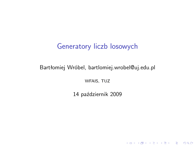 Generatory liczb losowych Bartłomiej Wróbel, [email protected] WFAIS, TUZ 14 październik 2009 Czym się zajmiemy 1 Czym są liczby losowe 2 Generowanie liczb o rozkładzie równomiernym 3 Metoda odwrócenia dystrybuanty 4 Metoda eliminacji von Neumana 5 Algorytm Boxa-Mullera Czym są liczby losowe Definition Liczba losowa to konkretna, nieprzewidywalna wartość przyjmowana przez zmienną losową. Nie można reprodukować sekwencji takich liczb. Czym są liczby losowe Źródła liczb losowych Dwa główne źródła pochodzenia: • fizyczne – zjawiska fizyczne (moneta, rozpad promieniotwórczy) Czym są liczby losowe Źródła liczb losowych Dwa główne źródła pochodzenia: • fizyczne – zjawiska fizyczne (moneta, rozpad promieniotwórczy) • generatory matematyczne – według ścisłej matematycznej formuły Czym są liczby losowe Ważne rodzaje liczb losowych Dwa ważne rodzaje liczb losowych • liczby losowe, będące liczbami naturalnymi, • liczby losowe, będące liczbami rzeczywistymi należącymi do przedziału [0; 1] Czym są liczby losowe Liczby o rozkładzie równomiernym Definition Niech xi będzie ciągiem liczb z przedziału (0; 1). Ciąg ten nazywamy ciągiem liczb równomiernie rozłożonych na przedziale (0; 1) jeżeli dla każdej pary liczb (a; b) spełniających warunki 0¬a¬b¬1 zachodzi N 1 X η(a, b)(xi ) = b − a N→∞ N i=1 lim gdzie ( η(a, b)(xi ) = 1, 0, gdy a < xi < b gdy xi ¬ a lub xi b Generowanie liczb o rozkładzie równomiernym Ogólnie Ogólnie: xn+1 = f (xn , xn−1 , . . . , xn−k+1 )modM Zależy od k stałych początkowych x0 , . . . , xk−1 i stałych charakteryzujących funkcję f . Zakładamy, że argumentami f są liczby całkowite ze zbioru ZM = 0, 1, . . . , M − 1 a wartości liczbami całkowitymi nieujemnymi. Wszystkie takie generatory są generatorami okresowymi! Generowanie liczb o rozkładzie równomiernym Przykładowe generatory liniowe Przykładowe generatory liniowe o okresie P = M 3 − 1: Xn = (1176Xn−1 + 1476Xn−2 + 1776Xn−3 )modM, M = 232 − 5 Xn = 213 (Xn−1 + Xn−2 + Xn−3 )modM, M = 232 − 5 Xn = (1995Xn−1 + 1998Xn−2 + 2001Xn−3 )modM, M = 235 − 849 Xn = 219 (Xn−1 + Xn−2 + Xn−3 )modM, M = 232 − 1629 Metoda odwrócenia dystrybuanty Definicja Definition Niech U będzie liczbą losową z rozkładu rownomiernego na (0; 1), a F – funkcją ciagłą i ścisle rosnacą oraz F (−∞) = 0 i F (+∞) = 1. Wówczas zmienna losowa: X = F −1 (U) ma rozkład prawdopodobienstwa o dystrybuancie F . Metoda odwrócenia dystrybuanty Przykład Przykład dla rozkładu Cauchy’ego gęstość prawdopodobieństwa: p(x) = 1 1 π 1 + X2 Dla dystrybuanty mamy: u = F (x) = 1 π Z x dt 0 1 arc tg(x) 1 = + 2 1+t 2 π stąd 1 x = tg(π(u − )) 2 Metoda eliminacji von Neumana Definicja Definition Niech X – zmienna losowa o gestości prawdopodobienstwa f (x) na przedziale [a; b], −∞ < a < b < +∞ oraz f (x) ¬ c, ∀x ∈ [a; b], c < +∞. 1 Generujemy punkt (x1 ; y1 ) taki, że: x1 ∈ U(a; b), y1 ∈ U(0; c). 2 Sprawdzamy, czy y1 ¬ f (x1 ) 3 Jeśli tak, to X = x1 4 Jeśli nie, to eliminujemy parę (x1 ; y1 ) i powtarzamy punkt 1. Metoda eliminacji von Neumana Obrazek... Algorytm Boxa-Mullera Definicja Dla rozkładu normalnego µ = 0 i σ = 1 x2 1 p(x) = √ e − 2 , 2π x ∈ (−∞, +∞) jest problem z dystrybuantą, bo jest związana z funkcją błędu erf (y ): 1 x F (x; 0, 1) = 1 + erf ( √ ) 2 2 Nie jesteśmy w stanie tego policzyć. Algorytm Boxa-Mullera Definicja Jeśli X1 i X2 są niezależnymi zmiennymi losowymi o rozkładzie równomiernym na przedziale (0; 1), to zmienne losowe √ Y1 = √−2 log X1 cos (2πX2 ) Y2 = −2 log X1 sin (2πX2 ) mają rozkład normalny U(0; 1) i także są niezależne. Jak poprawić szybkość? Algorytm Boxa-Mullera Poprawienie szybkości Wprowadzamy dwie nowe zmienne losowe: V1 = 2X1 − 1, V2 = 2X2 − 1, V1 ∈ (−1; 1) V2 ∈ (−1; 1) i żądamy, by: R 2 = V12 + V22 < 1 co odpowiada wyborowi punktów znajdujących się wewnątrz koła wpisanego w kwadrat o boku 2. Algorytm Boxa-Mullera Poprawienie szybkości Mając R ∈ U(0; 1), cos (2πX2 ) i sin (2πX2 ) ∈ U(−1; 1) otrzymujemy: √ Y1 = √−2 log X1 (V1 /R) Y2 = −2 log X1 (V2 /R) Ogólnie dla rozkładów o dowolnym µ i σ mamy: √ Y1 = µ + σ √−2 log X1 cos (2πX2 ) Y2 = µ + σ −2 log X1 sin (2πX2 )
