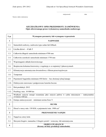 Znak sprawy: ZP/1/2012 Załącznik nr 5 do Specyfikacji Istotnych Warunków Zamówienia .............................................................., ...................................... miejscowość data Nazwa i adres wykonawcy SZCZEGÓŁOWY OPIS PRZEDMIOTU ZAMÓWIEIA Opis oferowanego przez wykonawcę samochodu osobowego L.p. Wymagane parametry lub wymagane wyposażenie 1 ADWOZIE 1.1. Samochód osobowy, nadwozie typu sedan lub liftback 1.2. Liczba drzwi – 4 lub 5 1.3. Całkowita długość samochodu minimum 4700 mm 1.4. Całkowita szerokość samochodu minimum 1750 mm 1.5. Wspomaganie układu kierowniczego 1.6. Bezpieczna kolumna kierownicy z regulacją w co najmniej 2 płaszczyznach 1.7. Klimatyzacja automatyczna dwustrefowa z filtrem przeciwpyłowym 1.8. Tempomat 1.9. Pojemność bagażnika minimum 450 litrów – bez złożonej tylnej kanapy 1.10. Elektrycznie sterowane i podgrzewane lusterka boczne 1.11. Rok produkcji: 2012 1.12. Przebieg: max. 10 000 km 1.13. Wielkość zużycia energii rozumiana jako zużycie paliwa w cyklu mieszanym – maksymalnie 14 litrów/100 km 1.14. Emisja zanieczyszczeń – minimum norma Euro V 2 2.1. SILIK Diesel o mocy min. 150 KM, o pojemności min. 1900 cm3 3 PRZEOSZEIE APĘDU 3.1. Napęd na cztery koła 3.2. Skrzynia biegów: manualna: 6 biegów przód + wsteczny, lub automatyczna 4 OKRES GWARACJI (liczony od daty produkcji samochodu) 1 Znak sprawy: ZP/1/2012 4.1. Części 2 lata mechaniczne 4.2. Perforacja blach minimum 10 lat 4.3. Lakier minimum 3 lata 5 Załącznik nr 5 do Specyfikacji Istotnych Warunków Zamówienia bez limitu kilometrów minimum WYPOSAŻEIE 5.1. Komplet opon na okres zimowy – 4 szt. 5.2. Czujnik parkowania z tyłu i przodu 5.3. Immobiliser i fabryczny autoalarm 5.4. Wskaźnik temperatury zewnętrznej 5.5. Elektrycznie sterowane szyby z przodu i z tyłu 5.6. Podłokietnik z przodu i z tyłu 5.7. Światła do jazdy dziennej 5.8. Fabryczny radioodtwarzacz CD/MP3 z minimum czterema głośnikami 5.9 System nawigacji samochodowej z mapą Polski 5.10. Centralny zamek sterowany pilotem 5.11. System powiadamiania o niezapiętym pasie bezp. pasażera. 5.12. Minimum 4 poduszki powietrzne + kurtyny powietrzne 5.13. Lakier metalizowany w kolorze srebrnym, złotym, granatowym lub czarnym. W przypadku samochodu testowego kolor bez znaczenia. 5.14. Pełnowymiarowe lub dojazdowe koło zapasowe 5.15. 2 czołowe poduszki powietrzne dla kierowcy i pasażera 5.16. Boczne poduszki powietrzne (przód) 5.17. Kurtynowe poduszki powietrzne z przodu i tyłu 5.18. Szyby przyciemniane 5.19. System przeciwdziałający blokowaniu kół podczas hamowania (ABS) wraz z systemem elektronicznego rozdziału siły hamowana oraz układem wspomagania siły hamowania; 5.20. Obręcze kół ze stopów lekkich 5.21. Regulacja fotela kierowcy 5.22. Zderzaki w kolorze nadwozia 5.23. Klamki zewnętrzne z kolorze nadwozia lub chromowane 2 Znak sprawy: ZP/1/2012 Załącznik nr 5 do Specyfikacji Istotnych Warunków Zamówienia 5.24. Lusterka boczne w kolorze nadwozia ze 5.25. Tapicerka materiałowa lub skórzana 5.26. Wielofunkcyjna kierownica ze sterowanym radiem 5.27. Podgrzewana tylna szyba 5.28. Automatycznie włączane światła 5.29. System stabilizacji toru jazdy pojazdu 6 Dokumenty dodatkowe 6.1. Instrukcja obsługi w języku polskim 6.2. Pakiet ubezpieczenia (OC, AC, NW) w pełnym zakresie; 6.3. Rejestracja pojazdu w imieniu zamawiającego 6.4. Kopia wyciągu z europejskiej homologacji cało pojazdowej bądź certyfikat zgodności WE (potwierdzone za zgodność z oryginałem) Podpis(y) osób upoważnionych do składania oświadczeń woli w imieniu wykonawcy 3