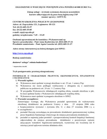 OGŁOSZENIE O WSZCZĘCIU POSTĘPOWANIA PONIśEJ 60 000 EURO NA: Zakup usługi – Ŝywienie systemem zleconym uczestników kursów odbywających się poza bazą logistyczną CSP (numer sprawy: 14/07/Cś) CENTRUM SZKOLENIA POLICJI W LEGIONOWIE Adres: ul. Zegrzyńska 121, Legionowo 05-121 Tel: (0-22) 605-32-57 fax: (0-22) 605-35-85 e-mail: [email protected] godziny urzędowania: 7.45 – 15.45 Osobami uprawnionymi do kontaktu z Wykonawcami są: Sprawy proceduralne - Pani Anna Kozłowska tel. (022) 605-37-21 Przedmiot zamówienia – Pani Agata Lasecka tel. (022) 605-31-27 Adres strony internetowej na której dostępna jest SIWZ: http://www.csp.edu.pl Rodzaj zamówienia: dostawa* usługa* robota budowlana* * niepotrzebne skreślić Tryb postępowania: przetarg nieograniczony INFORMACJE O CHARAKTERZE PRAWNYM, EKONOMICZNYM, FINANSOWYM I TECHNICZNYM 1) Warunki ogólne: a) Wykonawca musi spełniać wymogi określone w art. 22 ust. 1 ustawy Pzp. b) Wykonawca nie moŜe podlegać wykluczeniu z ubiegania się o zamówienie publiczne na podstawie art. 24 ust. 1 i 2 ustawy Pzp. c) W przypadku Wykonawców składających wspólną ofertę, warunki określone w pkt. b) musi spełniać kaŜdy z Wykonawców składających wspólną ofertę. d) Wykonawca musi spełniać wymagania określone w SIWZ. 2) Warunki szczegółowe: Zamawiający wymaga, aby Wykonawca posiadał uprawnienia do wykonywania określonej działalności na podstawie Ustawy z dnia 25 sierpnia 2006 roku o bezpieczeństwie Ŝywności i Ŝywienia (Dz. U. z dnia 27 września 2006 r.), a w szczególności: a) posiadał Decyzję zezwalającą na prowadzenie działalności gastronomicznej wydaną przez Inspektora Sanitarnego właściwego do miejsca prowadzenia działalności, b) posiadał co najmniej jeden protokół z przeprowadzonej kontroli Inspekcji Sanitarnej odpowiedniej do miejsca prowadzenia działalności z pozytywnym wpisem dotyczącym warunków higieniczno-sanitarnych, wystawiony nie wcześniej niŜ 8 miesięcy przed upływem terminu składania ofert. Przedmiot zamówienia Przedmiotem zamówienia jest zakup usługi – Ŝywienie systemem zleconym (kod CPC: 64230 ). CZĘŚĆ I – WyŜywienie uczestników kursów: FBI, ATŁS-5, DST-12, DST-13, DST-14, DKN-1, ATŁS-6, TN-14, TN-15 – zajęcia w Kalu Terminy kursów: od śniadania 14.05.2007 r. do obiadu 18.05.2007 r. od śniadania 21.05.2007 r. do obiadu 26.05.2007r, od śniadania 11.06.2007 r. do obiadu 21.06.2007r, od śniadania 02.07.2007 r. do obiadu 12.07.2007r, od śniadania 16.07.2007 r. do obiadu 26.07.2007r., od śniadania 30.07.2007 r. do kolacji 10.08.2007r., od śniadania 17.09.2007 r. do obiadu 22.09.2007r, od śniadania 01.10.2007 r. do obiadu 13.10.2007, od śniadania 05.11.2007 r. do obiadu 17.11.2007r. Liczba uczestników: 18, 23, 22, 23, 23, 23, 23, 19, 19. Ogólna ilość racji٭ 1 86 Cena całodniowego wyŜywienia netto 2 Wartość wyŜywienia netto 3 Ogólna ilość dodatków uzupełniających w sztukach 4 - Cena dziennego dodatku netto 5 - Wartość dodatków uzupełniających netto 6 - Razem wartość wyŜywienia netto 7 Stawka podatku VAT % 8 7 132 132 7 237 237 7 247 247 7 247 247 7 276 276 7 132 132 7 Razem wartość wyŜywienia brutto 9 243 243 7 243 243 7 RAZEM: x 1.757 x x 1) W cenę całodniowego wyŜywienia wchodzi cena trzech posiłków – śniadania, obiadu i kolacji. 2) Dodatek uzupełniający stanowi dodatkową rację dzienną, która powinna być podana w formie drugiego śniadania lub podwieczorku, ewentualnie paczek z suchym prowiantem. 3) „ Wsad do kotła” całodziennego wyŜywienia 1 osoby (s+o+k) – musi wynosić nie mniej niŜ 11 zł 53 gr. dodatku uzupełniającego nie mniej niŜ 3 zł 83 gr. 4) Kaloryczność całodniowego wyŜywienia wraz z dodatkiem powinna być zachowana na poziomie 5.000 – 5.500 Kcal. 5) Czas posiłków powinien być dostosowany do potrzeb uczestników kursu. Ze względu na rodzaj przeprowadzanych zajęć moŜe być ustalany w trybie roboczym podczas trwania kursu. ٭Ogólna ilość racji to iloczyn liczby uczestników x ilość dni x 0,25% śniadanie + 0,50% obiad + 0,25% kolacja CZĘŚĆ II – WyŜywienie uczestników kursu MPW – 4 - zajęcia w Krynicy Górskiej Termin kursu – od śniadania 20 sierpnia 2007r do kolacji 01 września 2007 r. Liczba uczestników – 31 W terminie od śniadania w dniu 27 sierpnia 2007 r. do kolacji 01 września 2007 r. dodatkowo 3 osoby (LOT) Ogólna ilość racji٭ 1 403 Cena całodniowego wyŜywienia Netto 2 Wartość wyŜywienia netto 3 Ogólna ilość dodatków uzupełniających w sztukach 4 403 Cena dziennego dodatku netto 5 Wartość dodatków uzupełniających netto 6 Razem wartość wyŜywienia netto 7 Stawka podatku VAT % Razem wartość wyŜywienia brutto 8 9 7 18(LOT) RAZEM 18 x 421 7 x x 1) W cenę całodniowego wyŜywienia wchodzi cena trzech posiłków – śniadania, obiadu i kolacji. 2) Dodatek uzupełniający stanowi dodatkową rację dzienną, która powinna być podana w formie drugiego śniadania lub podwieczorku, ewentualnie paczek z suchym prowiantem. 3) „ Wsad do kotła” całodziennego wyŜywienia 1 osoby (ś+o+k) – musi wynosić nie mniej niŜ 11 zł 53 gr. dodatku uzupełniającego nie mniej niŜ 3 zł 83 gr. „Wsad do kotła” całodziennego wyŜywienia 1 osoby z LOT-u (ś+o+k) musi wynosić 14 zł 71 gr. 4) Kaloryczność całodniowego wyŜywienia wraz z dodatkiem powinna być zachowana na poziomie 5.000 – 5.500 Kcal. 5) Czas posiłków powinien być dostosowany do potrzeb uczestników kursu. Ze względu na rodzaj przeprowadzanych zajęć moŜe być ustalany w trybie roboczym podczas trwania kursu. ٭ Ogólna ilość racji to iloczyn liczby uczestników x ilość dni x 0.25% śniadanie + 0,50% obiad + 0.25% kolacja Kryteria oceny ofert: cena – 100 % Termin składania ofert: 04.04.2007 r. godz. 12.00 Termin otwarcia ofert: 04.04.2007 r. godz. 12.30 Miejsce składania ofert: siedziba Zamawiającego: budynek nr 7 pokój nr 8 . ZASTĘPCA KOMEND