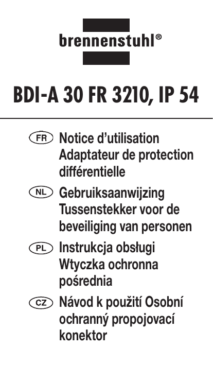 BDI-A 30 FR 3210, IP 54 Notice d’utilisation Adaptateur de protection différentielle Gebruiksaanwijzing Tussenstekker voor de beveiliging van personen Instrukcja obsługi Wtyczka ochronna pośrednia Návod k použití Osobní ochranný propojovací konektor 2 Adaptateur de protection différentielle BDI-A 30 FR 3210 Attention! Importantes consignes de sécurité! – A sa sortie, l’appareil conduit une tension alternative de 230 V et ne doit être manipulé par des enfants! Attention, danger de mort! – Le fonctionnement dans d’autres conditions, comme par exemple des températures ambiantes supérieures à 40°C, avec des gaz inflammables, des solvants, des vapeurs, de la poussière, de l’humidité relative de l’air supérieure à 80% ainsi que de l’humidité doivent impérativement être évitées. – Lorsque l’on peut supposer que l’utilisation ne pourra pas se faire sans danger, alors il faut immédiatement arrêter l’appareil et le mettre en sécurité contre un fonctionnement involontaire. Un fonctionnement sans danger de l’appareil n’est pas possible lorsque l’appareil ne présente plus aucune fonction, lorsqu’il présente des dommages visibles, en cas de dommages dus au transport, après un stockage dans des conditions défavorables. – Les travaux de service et les réparations ne pourront être effectués que par du personnel spécialisé. Seuls des composants d’origine pourront être utilisés comme pièces de rechange. Description du fonctionnement L’adaptateur de protection différentielle de protection personnelle électronique est un appareil mobile de protection très sensible contre les accidents dangereux lors de contact avec des conduites ou des pièces conductrices d’électricité. 3 A partir d’une petite décharge d’au moins 30 mA, l’appareil de protection réagit déjà. En quelques millisecondes, le courant est coupé en cas de danger. Une protection sûre et rapide contre les accidents entre la prise et l’appareil. Mise en service 1. Brancher toujours l’adaptateur de protection différentielle de protection personnelle directement à la prise murale. 2. Brancher la rallonge, le rouleau, les multiprises etc. dans l’adaptateur de protection différentielle. Brancher l’appareil électrique (à l’état éteint). 3. Mettre l’adaptateur de protection différentielle en marche en appuyant sur la touche RESET. Dans la fenêtre de contrôle au-dessus de la touche RESET apparaît une marque rouge. 4. Pour contrôler le fonctionnement, appuyer maintenant sur la touche TEST. On doit entendre un bruit de mise en marche et la marque rouge dans la fenêtre de contrôle ne doit plus être visible. 5. L’appareil ne doit pas être utilisé lorsque l’on n’entend pas ce bruit de mise en marche et que la marque rouge continue d’être visible. 6. Lorsque le test a réussi, appuyer de nouveau sur la touche RESET. L’appareil est maintenant prêt à fonctionner. Important! Pour le contrôle du fonctionnement: appuyer de temps en temps sur le bouton de test et effectuer le contrôle de fonctionnement comme décrit ci-dessus. Après une interruption d’électricité, remettre en marche l’adaptateur de protection différentielle! 4 L’adaptateur de protection différentielle ne convient pas aux appareils pour lesquels une longue mise hors service peut provoquer des dommages (p. ex. les réfrigérateurs, les congélateurs, etc.)! Cet adaptateur de protection différentielle ne remplace pas les mesures de protection normalement nécessaires! Caractéristiques techniques Tension nominale: Fréquence du réseau: IAN: Temps de déclenchement maxi: Puissance nominale: Courant nominal: Courant de court-circuit maxi. autorisé: Température ambiante: Catégorie de protection: Type de protection Rupture à 2 pôles Contenu de la livraison: 230 V ~ 50 Hz 30 mA 30 ms maxi. 3500 W 16 A 500 A -25 °C - +40 °C I IP 54 Adaptateur de protection différentielle avec notice d’utilisation Sous réserve de modifications techniques. 5 Tussenstekker voor de beveiliging van personen BDI-A 30 FR 3210 Attentie! Belangrijke veiligheidsaanwijzingen! – Op de uitgang van dit toestel staat een wisselspanning van 230 V en het hoort dus niet in de handen van kinderen! Attentie: levensgevaar! – Het gebruik onder andere omgevingsvoorwaarden zoals omgevingstemperaturen van meer dan 40°C, brandbare gassen, oplosmiddelen, dampen, stof, een relatieve vochtigheid van de lucht van meer dan 80 % en vocht moet onder alle omstandigheden worden vermeden. – Wanneer men kan aannemen dat het niet meer mogelijk is zonder gevaar met het toestel te werken, dan moet het meteen buiten dienst worden gezet en tegen toevallige werking worden beveiligd. Een ongevaarlijke werking is niet meer te verwachten wanneer het toestel niet meer werkt, zichtbare beschadigingen vertoont, bij transportschade en na opslag onder ongunstige omstandigheden. – Reparatie en onderhoud mogen enkel door bevoegde vaklui worden uitgevoerd. Enkel originele onderdelen mogen gebruikt worden om defecte onderdelen te vervangen. Beschrijving van de werking De elektronische tussenstekker voor de beveiliging van personen is een erg gevoelig, verplaatsbaar toestel dat beveiligt tegen gevaarlijke ongelukken door het aanraken van stroomvoerende leidingen of onderdelen. De beveiliging reageert al bij kleine lekstromen van minstens 30 mA. Bij gevaar wordt de stroom binnen enkele milliseconden onderbroken. 6 Veilige en snelle beveiliging tegen ongelukken tussen contactdoos en toestel. Inbedrijfstelling 1. Steek de tussenstekker voor de beveiliging van personen altijd direct in de wandcontactdoos. 2. Steek eerst verlengsnoeren, kabelrollen, contactdozenblokken enz. in de contactdoos van de tussenstekker voor de beveiliging van personen. Stop dan pas de stekker van het elektrische toestel in (in uitgeschakelde toestand). 3. Schakel de tussenstekker voor de beveiliging van personen in door op de RESET-toets 