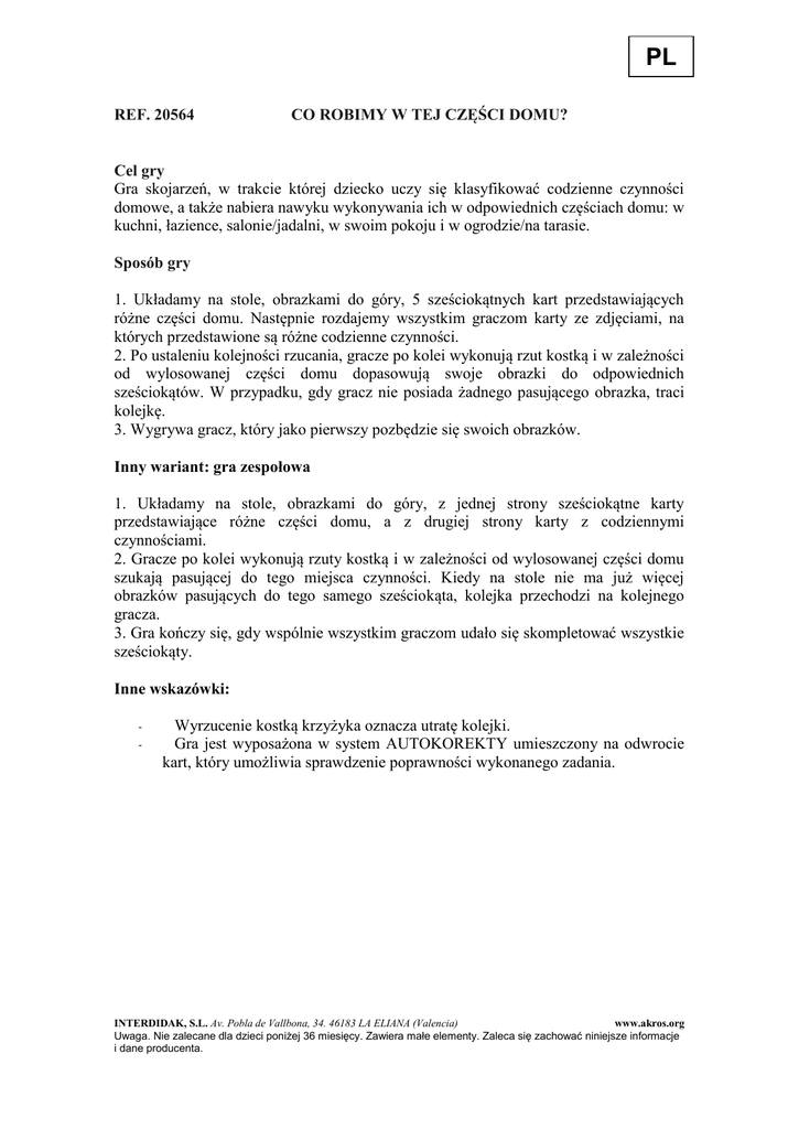 PL REF. 20564 CO ROBIMY W TEJ CZĘŚCI DOMU? Cel gry Gra skojarzeń, w trakcie której dziecko uczy się klasyfikować codzienne czynności domowe, a także nabiera nawyku wykonywania ich w odpowiednich częściach domu: w kuchni, łazience, salonie/jadalni, w swoim pokoju i w ogrodzie/na tarasie. Sposób gry 1. Układamy na stole, obrazkami do góry, 5 sześciokątnych kart przedstawiających różne części domu. Następnie rozdajemy wszystkim graczom karty ze zdjęciami, na których przedstawione są różne codzienne czynności. 2. Po ustaleniu kolejności rzucania, gracze po kolei wykonują rzut kostką i w zależności od wylosowanej części domu dopasowują swoje obrazki do odpowiednich sześciokątów. W przypadku, gdy gracz nie posiada żadnego pasującego obrazka, traci kolejkę. 3. Wygrywa gracz, który jako pierwszy pozbędzie się swoich obrazków. Inny wariant: gra zespołowa 1. Układamy na stole, obrazkami do góry, z jednej strony sześciokątne karty przedstawiające różne części domu, a z drugiej strony karty z codziennymi czynnościami. 2. Gracze po kolei wykonują rzuty kostką i w zależności od wylosowanej części domu szukają pasującej do tego miejsca czynności. Kiedy na stole nie ma już więcej obrazków pasujących do tego samego sześciokąta, kolejka przechodzi na kolejnego gracza. 3. Gra kończy się, gdy wspólnie wszystkim graczom udało się skompletować wszystkie sześciokąty. Inne wskazówki: - Wyrzucenie kostką krzyżyka oznacza utratę kolejki. Gra jest wyposażona w system AUTOKOREKTY umieszczony na odwrocie kart, który umożliwia sprawdzenie poprawności wykonanego zadania. INTERDIDAK, S.L. Av. Pobla de Vallbona, 34. 46183 LA ELIANA (Valencia) www.akros.org Uwaga. Nie zalecane dla dzieci poniżej 36 miesięcy. Zawiera małe elementy. Zaleca się zachować niniejsze informacje i dane producenta.
