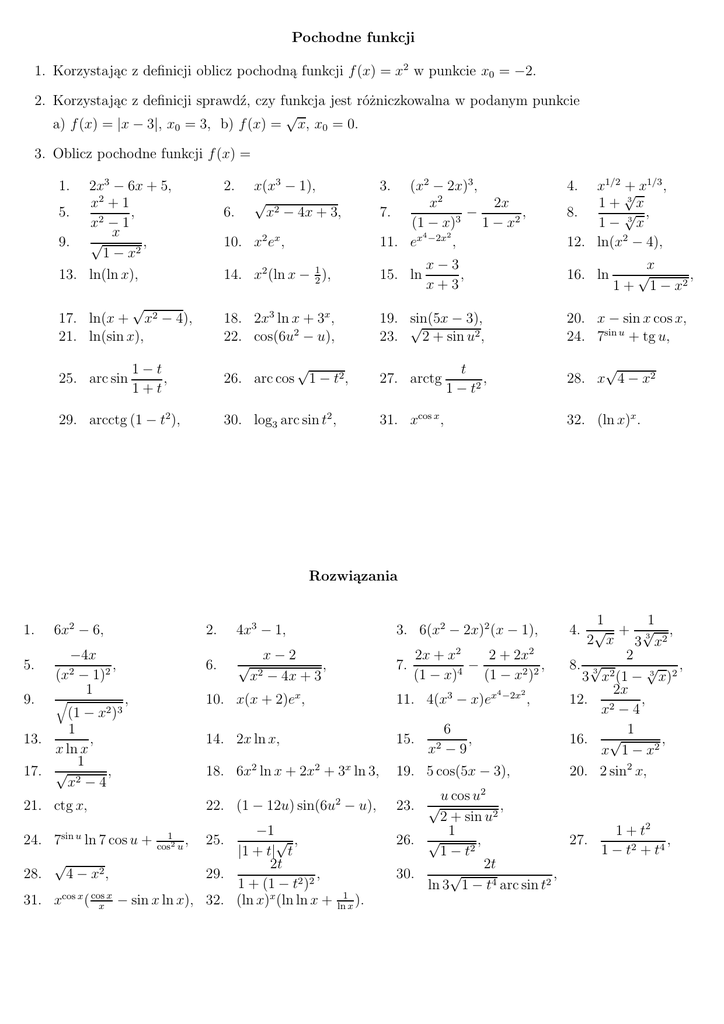 Pochodne funkcji 1. Korzystając z definicji oblicz pochodną funkcji f (x) = x2 w punkcie x0 = −2. 2. Korzystając z definicji sprawdź, czy funkcja jest różniczkowalna w podanym punkcie √ a) f (x) = |x − 3|, x0 = 3, b) f (x) = x, x0 = 0. 3. Oblicz pochodne funkcji f (x) = 2x3 − 6x + 5, x2 + 1 , 5. x2 − 1 x 9. √ , 1 − x2 13. ln(ln x), 1. 6. 10. x2 ex , √ 17. ln(x + x2 − 4), 21. ln(sin x), 25. arc sin x(x3 − 1), √ x2 − 4x + 3, 2. 1−t , 1+t 29. arcctg (1 − t2 ), (x2 − 2x)3 , 2x x2 − , 7. 3 (1 − x) 1 − x2 4 2 11. ex −2x , x1/2 √ + x1/3 , 1+ 3x √ , 8. 1− 3x 12. ln(x2 − 4), 3. 4. x−3 , x+3 14. x2 (ln x − 21 ), 15. ln 18. 2x3 ln x + 3x , 22. cos(6u2 − u), 19. √ sin(5x − 3), 2 + sin u2 , 23. √ 26. arc cos 1 − t2 , 27. arctg 30. log3 arc sin t2 , 31. xcos x , 16. ln x √ , 1 + 1 − x2 20. x − sin x cos x, 24. 7sin u + tg u, √ 28. x 4 − x2 t , 1 − t2 32. (ln x)x . Rozwiązania 1. 5. 9. 6x2 − 6, −4x , 2 (x − 1)2 1 q (1 − x2 )3 1 , 13. x ln x 1 17. √ 2 , x −4 , 2. 4x3 − 1, 6. √ x−2 , x2 − 4x + 3 7. 4 −2x2 11. 4(x3 − x)ex 14. 2x ln x, 15. 18. 6x2 ln x + 2x2 + 3x ln 3, 19. 5 cos(5x − 3), −1 √ , |1 + t| t √ 2t 28. , 4 − x2 , 29. 1 + (1 − t2 )2 31. xcos x ( cosx x − sin x ln x), 32. (ln x)x (ln ln x + 1 , cos2 u 2 + 2x2 2x + x2 − , (1 − x)4 (1 − x2 )2 10. x(x + 2)ex , 22. (1 − 12u) sin(6u2 − u), 21. ctg x, 24. 7sin u ln 7 cos u + 3. 6(x2 − 2x)2 (x − 1), 25. 1 ). ln x 6 , x2 − 9 , 1 1 4. √ + √ , 3 2 x 3 x2 2 8. √ √ , 3 3 x2 (1 − 3 x)2 2x 12. 2 , x −4 1 16. √ , x 1 − x2 20. 2 sin2 x, u cos u2 , 2 + sin u2 1 1 + t2 , 26. √ , 27. 1 − t2 + t4 1 − t2 2t √ 30. , ln 3 1 − t4 arc sin t2 23. √