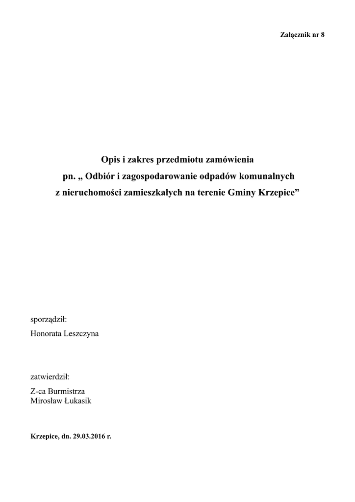Załącznik nr 8 Opis i zakres przedmiotu zamówienia pn. „ Odbiór i zagospodarowanie odpadów komunalnych z nieruchomości zamieszkałych na terenie Gminy Krzepice” sporządził: Honorata Leszczyna zatwierdził: Z-ca Burmistrza Mirosław Łukasik Krzepice, dn. 29.03.2016 r. I. Opis przedmiotu zamówienia. 1. Przedmiotem zamówienia jest świadczenie usługi polegającej na odbiorze i zagospodarowaniu wskazanych w pkt 3 i 4 odpadów komunalnych gromadzonych na terenie wszystkich nieruchomości, na których zamieszkują mieszkańcy, położonych na terenie gminy Krzepice. Orientacyjna liczba punktów wywozowych, z których należy odebrać odpady komunalne wynosi około 2470. W skład Gminy wchodzą miejscowości: Krzepice (obszar miejski), Dankowice Pierwsze, Dankowice Drugie, Dankowice Trzecie, Dankowice-Piaski, Podłęże Królewskie, Starokrzepice, Lutrowskie, Zajączki Pierwsze, Zajączki Drugie, Szarki, Stanki (obszar wiejski). 2. Zamówienie obejmuje okres od 01 lipca 2016r. do 30 czerwca 2017 r., z zastrzeżeniem zapisów pkt 16 i pkt 25. 3. Zakres przedmiotu zamówienia obejmuje w całym okresie realizacji cykliczny odbiór z nieruchomości, na których zamieszkują mieszkańcy, transport i zagospodarowanie: 1) zmieszanych niesegregowanych odpadów komunalnych zgromadzonych w pojemnikach oraz dodatkowych workach, 2) odpadów komunalnych gromadzonych w sposób selektywny, w workach lub pojemnikach zebranych w zabudowie jednorodzinnej i wielolokalowej, obejmujących: a) szkło; b) papier i tekturę, c) tworzywa sztuczne i opakowania wielomateriałowe; d) metal; e) odpady ulegające biodegradacji (odpady zielone, odpady z kuchni i odpady opakowaniowe ulegające biodegradacji). 4. Zakres przedmiotu zamówienia obejmuje przeprowadzenie dwóch zbiórek zużytego sprzętu elektrycznego i elektronicznego, mebli i innych odpadów wielkogabarytowych oraz opon w ramach zbiórki „wystawkowej” sprzed domów, w terminach uzgodnionych przez Wykonawcę z Zamawiającym. 5. Zamówienie nie obejmuje odbioru i zagospodarowania powstających na nieruchomościach zamieszkałych odpadów pochodzących z robót budowlanych i remontowych i pozostałych frakcji odpadów nie wymienionych w pkt 3 i 4. 6. Realizując zagospodarowanie odebranych z nieruchomości zamieszkałych odpadów komunalnych, o których mowa w pkt 3 i 4, podmiot odbierający odpady zobowiązany jest do: 6.1. przekazania zmieszanych odpadów komunalnych, odpadów zielonych do regionalnych instalacji przetwarzania odpadów komunalnych określonych dla regionu I w „Planie gospodarki odpadami dla województwa śląskiego 2014” lub w przypadku awarii bądź braku mocy przerobowych regionalnej instalacji do instalacji zastępczych wskazanych w „Planie gospodarki odpadami dla województwa śląskiego 2014” po uzyskaniu i przekazaniu Zamawiającemu pisemnej informacji, iż nie jest możliwe przyjęcie odpadów przez regionalną instalację; 6.2. przekazania selektywnie zebranych odpadów komunalnych do instalacji odzysku i unieszkodliwiania odpadów, zgodnie z hierarchią postępowania z odpadami, określoną w obowiązujących przepisach prawa, w szczególności w myśl art. 17 ustawy z dnia 14 grudnia 2012 r. o odpadach (Dz. U. z 2015 r. poz. 933 ze zm.) 6.3. wskazania instalacji, w szczególności regionalnych instalacji do przetwarzania odpadów komunalnych, do których przekaże odebrane odpady; w przypadku niewielkich ilości odebranych odpadów selektywnie zbieranych niepodlegających przekazaniu do regionalnej instalacji do przetwarzania odpadów komunalnych możliwe jest wskazanie podmiotu zbierającego te odpady. 7. Wykonawca w ramach realizacji zamówienia wyposaża nieruchomości zamieszkałe w pojemniki do gromadzenia odpadów komunalnych zmieszanych oraz pojemniki do zbiórki selektywnej (zabudowa wielolokalowa), które muszą odpowiadać wymogom określonym w Regulaminie utrzymania czystości i porządku na terenie Gminy Krzepice, zwanym dalej Regulaminem oraz zapewnia utrzymanie pojemników w odpowiednim stanie sanitarnym, porządkowym i technicznym. Przydział pojemników w zależności od liczby mieszkańców wynika z uchwały nr 16.167.2016 Rady Miejskiej w Krzepicach z dnia 22 marca 2016 r. w sprawie szczegółowego sposobu i zakresu świadczenia usług w zakresie odbierania odpadów komunalnych od właścicieli nieruchomości z terenu Gminy Krzepice i zagospodarowania tych odpadów w zamian za uiszczoną przez właściciela nieruchomości opłatę za gospodarowanie odpadami komunalnymi. W uzasadnionych przypadkach dopuszcza się możliwość wyposażenia nieruchomości w pojemnik o większej pojemności, niż to wynika z ilości osób zamieszkujących, lub dodatkowy pojemnik, po zgłoszeniu Wykonawcy zapotrzebowania przez Zamawiającego. 8. Pojemniki będą stanowiły własność Wykonawcy, który uwzględni koszt ich dostawy i eksploatacji w cenie jednostkowej zryczałtowanej, określonej w ofercie Wykonawcy za 1 Mg odebranych i zagospodarowanych odpadów. 8.1. W przypadku udokumentowanego zaginięcia lub zniszczenia pojemnika z bezspornej winy właściciela nieruchomości (dewastacja, w szczególności w sytuacji spalenia pojemnika), Zamawiający zobowiązany będzie do wyrównania szkody Wykonawcy z tytułu zniszczenia pojemnika z uwzględnieniem jego amortyzacji; Zapłata za zniszczony pojemnik nastąpi po analizie zebranego materiału dowodowego przez Zamawiającego potwierdzającego winę właściciela nieruchomości (dokumentacja fotograficzna, wyjaśnienia właściciela nieruchomości i protokół zniszczenia Wykonawcy); 8.2. Wykonawca zobowiązany jest do naprawy lub wymiany pojemnika w przypadku uszkodzenia lub zniszczenia z winy Wykonawcy lub uszkodzenia pojemnika w związku z jego eksploatacją na własny koszt. 9. Wykonawca wyposaża nieruchomości zamieszkałe w zabudowie jednorodzinnej w worki o pojemnościach 120 l przeznaczone do zbiórki selektywnej. Koszt worków Wykonawca uwzględni w ce