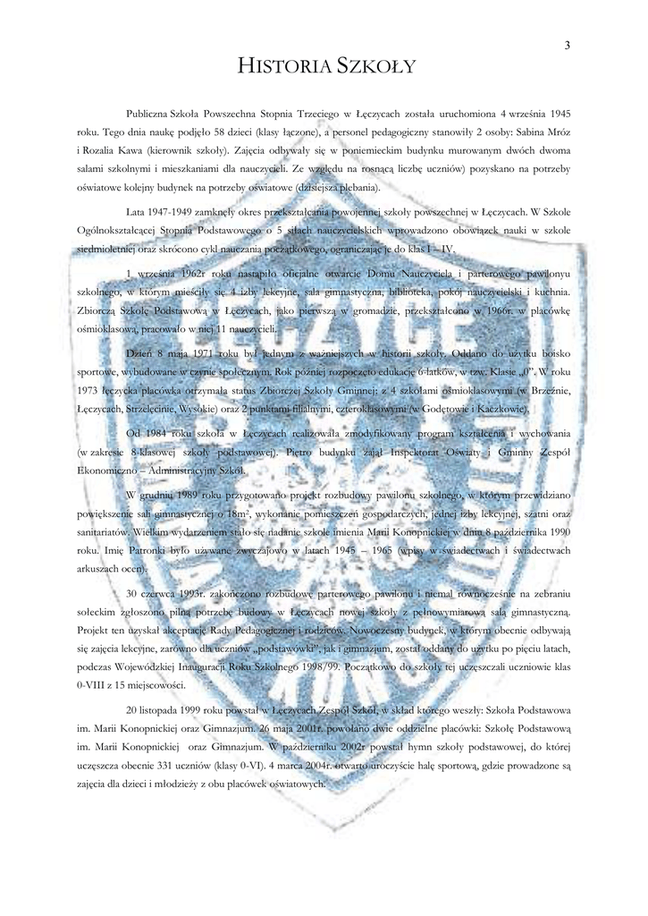 HISTORIA SZKOŁY 3 Publiczna Szkoła Powszechna Stopnia Trzeciego w Łęczycach została uruchomiona 4 września 1945 roku. Tego dnia naukę podjęło 58 dzieci (klasy łączone), a personel pedagogiczny stanowiły 2 osoby: Sabina Mróz i Rozalia Kawa (kierownik szkoły). Zajęcia odbywały się w poniemieckim budynku murowanym dwóch dwoma salami szkolnymi i mieszkaniami dla nauczycieli. Ze względu na rosnącą liczbę uczniów) pozyskano na potrzeby oświatowe kolejny budynek na potrzeby oświatowe (dzisiejsza plebania). Lata 1947-1949 zamknęły okres przekształcania powojennej szkoły powszechnej w Łęczycach. W Szkole Ogólnokształcącej Stopnia Podstawowego o 5 siłach nauczycielskich wprowadzono obowiązek nauki w szkole siedmioletniej oraz skrócono cykl nauczania początkowego, ograniczając je do klas I – IV. 1 września 1962r roku nastąpiło oficjalne otwarcie Domu Nauczyciela i parterowego pawilonyu szkolnego, w którym mieściły się 4 izby lekcyjne, sala gimnastyczna, biblioteka, pokój nauczycielski i kuchnia. Zbiorczą Szkołę Podstawową w Łęczycach, jako pierwszą w gromadzie, przekształcono w 1966r. w placówkę ośmioklasową, pracowało w niej 11 nauczycieli. Dzień 8 maja 1971 roku był jednym z ważniejszych w historii szkoły. Oddano do użytku boisko sportowe, wybudowane w czynie społecznym. Rok później rozpoczęto edukację 6-latków, w tzw. Klasie „0”. W roku 1973 łęczycka placówka otrzymała status Zbiorczej Szkoły Gminnej: z 4 szkołami ośmioklasowymi (w Brzeźnie, Łęczycach, Strzelęcinie, Wysokie) oraz 2 punktami filialnymi, czteroklasowymi (w Godętowie i Kaczkowie). Od 1984 roku szkoła w Łęczycach realizowała zmodyfikowany program kształcenia i wychowania (w zakresie 8-klasowej szkoły podstawowej). Piętro budynku zajął Inspektorat Oświaty i Gminny Zespół Ekonomiczno – Administracyjny Szkół. W grudniu 1989 roku przygotowano projekt rozbudowy pawilonu szkolnego, w którym przewidziano powiększenie sali gimnastycznej o 18m2, wykonanie pomieszczeń gospodarczych, jednej izby lekcyjnej, szatni oraz sanitariatów. Wielkim wydarzeniem stało się nadanie szkole imienia Marii Konopnickiej w dniu 8 października 1990 roku. Imię Patronki było używane zwyczajowo w latach 1945 – 1965 (wpisy w świadectwach i świadectwach arkuszach ocen). 30 czerwca 1993r. zakończono rozbudowę parterowego pawilonu i niemal równocześnie na zebraniu sołeckim zgłoszono pilną potrzebę budowy w Łęczycach nowej szkoły z pełnowymiarową salą gimnastyczną. Projekt ten uzyskał akceptację Rady Pedagogicznej i rodziców. Nowoczesny budynek, w którym obecnie odbywają się zajęcia lekcyjne, zarówno dla uczniów „podstawówki”, jak i gimnazjum, został oddany do użytku po pięciu latach, podczas Wojewódzkiej Inauguracji Roku Szkolnego 1998/99. Początkowo do szkoły tej uczęszczali uczniowie klas 0-VIII z 15 miejscowości. 20 listopada 1999 roku powstał w Łęczycach Zespół Szkół, w skład którego weszły: Szkoła Podstawowa im. Marii Konopnickiej oraz Gimnazjum. 26 maja 2001r. powołano dwie oddzielne placówki: Szkołę Podstawową im. Marii Konopnickiej oraz Gimnazjum. W październiku 2002r powstał hymn szkoły podstawowej, do której uczęszcza obecnie 331 uczniów (klasy 0-VI). 4 marca 2004r. otwarto uroczyście halę sportową, gdzie prowadzone są zajęcia dla dzieci i młodzieży z obu placówek oświatowych.