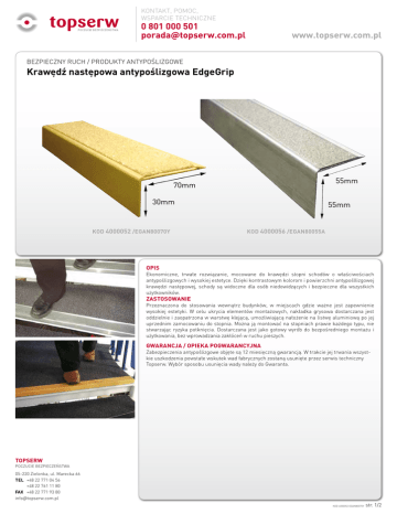 KONTAKT, POMOC, WSPARCIE TECHNICZNE 0 801 000 501 [email protected] www.topserw.com.pl BEZPIECZNY RUCH / PRODUKTY ANTYPOŚLIZGOWE Krawędź następowa antypoślizgowa EdgeGrip 55mm 70mm 30mm KOD 4000052 /EGAN80070Y 55mm KOD 4000056 /EGAN80055A OPIS Ekonomiczne, trwałe rozwiązanie, mocowane do krawędzi stopni schodów o właściwościach antypoślizgowych i wysokiej estetyce. Dzięki kontrastowym kolorom i powierzchni antypośllizgowej krawędzi następowej, schody są widoczne dla osób niedowidzących i bezpieczne dla wszystkich użytkowników. ZASTOSOWANIE Przeznaczona do stosowania wewnątrz budynków, w miejscach gdzie ważne jest zapewnienie wysokiej estetyki. W celu ukrycia elementów montażowych, nakładka grysowa dostarczana jest oddzielnie i zaopatrzona w warstwę klejącą, umożliwiającą nałożenie na listwę aluminiową po jej uprzednim zamocowaniu do stopnia. Można ją montować na stopniach prawie każdego typu, nie stwarzając ryzyka potknięcia. Dostarczana jest jako gotowy wyrób do bezpośredniego montażu i użytkowania, bez wprowadzania zakłóceń w ruchu pieszych. GWARANCJA / OPIEKA POGWARANCYJNA Zabezpieczenia antypoślizgowe objęte są 12 miesięczną gwarancją. W trakcie jej trwania wszystkie uszkodzenia powstałe wskutek wad fabrycznych zostaną usunięte przez serwis techniczny Topserw. Wybór sposobu usunięcia wady należy do Gwaranta. TOPSERW POCZUCIE BEZPIECZEŃSTWA 05-220 Zielonka, ul. Marecka 66 TEL +48 22 771 04 56 +48 22 761 11 80 FAX +48 22 771 93 80 [email protected] KOD 4000052 EGAN80070Y str. 1/2 KONTAKT, POMOC, WSPARCIE TECHNICZNE 0 801 000 501 [email protected] www.topserw.com.pl BEZPIECZNY RUCH / PRODUKTY ANTYPOŚLIZGOWE Krawędź następowa antypoślizgowa EdgeGrip DOSTĘPNE MODELE / DANE TECHNICZNE Kod produktu Numer artykułu Wymiary D*S (mm) Rodzaj Kolor 4000046 4000047 4000048 4000049 4000050 4000051 4000052 4000053 4000054 4000055 4000056 4000057 4000058 4000059 4000060 4000061 EGAN240070A 2400*70*30 wewnętrzny szary EGAN120070A 1200*70*30 wewnętrzny szary EGAN80070A 800*70*30 wewnętrzny szary EGAN60070A 600*70*30 wewnętrzny szary EGAN240070Y 2400*70*30 zewnętrzna żółty EGAN120070Y 1200*70*30 zewnętrzna żółty EGAN80070Y 800*70*30 zewnętrzna żółty EGAN60070Y 2400x55x55 zewnętrzna żółty EGAN240055A 1000*55*55 wewnętrzny szary EGAN120055A 1200*55*55 wewnętrzny szary EGAN80055A 800*55*55 wewnętrzny szary EGAN60055A 600*55*55 wewnętrzny szary EGAN240055Y 2400*55*55 zewnętrzna żółty EGAN120055Y 1200*55*55 zewnętrzna żółty EGAN80055Y 800*55*55 zewnętrzna żółty EGAN60055Y 600*55*55 zewnętrzna żółty TOPSERW POCZUCIE BEZPIECZEŃSTWA 05-220 Zielonka, ul. Marecka 66 TEL +48 22 771 04 56 +48 22 761 11 80 FAX +48 22 771 93 80 [email protected] KOD 4000052 EGAN80070Y str. 2/2