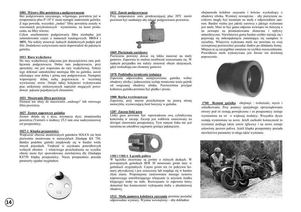 1001 Wirowy filtr powietrza z podgrzewaczem Bez podgrzewania zasysanego, wilgotnego, powietrza już w temperaturze plus 8o-10o C może nastąpić zamrożenie gaźnika. Z tego powodu, wszystkie „mokre” filtry powietrza zostały w warsztatach przyfrontowych wymienione, na koszt producenta, na filtry wirowe. Celem uruchomienia podgrzewania filtra niezbędne jest zainstalowanie części o numerach katalogowych: 1013-1 i 1031. Nie należy stosować żadnych dodatkowych podpór pod filtr. Dodatkowe usztywnienie może doprowadzić do pęknięcia gaźnika. 1013 Rura wydechowa Do rury wydechowej załączona jest dwuczęściowa rura podłączenia podgrzewacza. Dolna rura podgrzewacza, przy sprzedaży, nie jest wspawana do rury wydechowej. Należy tego dokonać samodzielnie montując filtr na gaźniku, zawor odcinający oraz dolną i górną rurę podgrzewacza. Następnie wspawujemy dolną rurkę pogrzewacza w wcześniej wywiercony otwór. Dzięki takiej kolejności wykonywania prac unikniemy niekorzystnych naprężeń mogących powodować pękanie pojedynczych elementów. 1069 Pierścienie zaciskowe Pierścienie powinny dawać się lekko nasuwać na mufy gumowe. Zapewnia to mufom możliwość rozszerzania się. W żadnym przypadku nie należy stosować obejm skręcanych, gdyż uszkadzają one elementy gumowe. obejmowała kolektor zasysania i króciec wychodzący z obudowy silnika. Wymiary zewnętrzne – aby pierścienie zaciskowe mogły być nasunięte na mufę z odpowiednim oporem. Bardzo ważna jest jakość surowca z jakiego wykonana jest mufa. Musi to być guma odporna wewnątrz na benzynę a na zewnątrz na promieniowanie słoneczne i wpływy atmosferyczne. Niewłaściwa guma bardzo szybko starzeje się i pojawiają się mikropęknięcia zmieniające się następnie w szczeliny. Właściwie wykonana mufa nie powinna na swej zewnętrznej powierzchni posiadać śladów po składaniu formy. Miejsca te są szczególnie narażone na szybkie rozszczelnienie. Prawidłowa mufa wykonywana jest formie nie dzielonej poprzecznie. 1078 Podkładka termicznie izolująca Zapewnia odpowiednie umiejscowienie gaźnika wobec obudowy silnika i jednocześnie izoluje termicznie tenże gaźnik od rozgrzanej obudowy silnika. Powierzchnia przylgni kołnierza gaźnika powinna być gładka i prosta. 1021 Mocowanie filtra powietrza Element ten służy do mocowania „mokrego” lub wirowego filtra powietrza. 1080 Rurka wyrównawcza Zapewnia, przy mocno przechylonym na prawą stronę motocyklu, wystarczającą ilość benzyny w gaźniku. 1027 Zestaw naprawczy gaźnika Zestaw składa się z dysz, trzymaczy dysz, strumiennika powietrza (Venturi) o średnicy 25,5 mm oraz nadwymiarowej osi przepustnicy. 1287 Zaczep linki gazu Linka gazu powinna być wprowadzona swą cylindryczną końcówką w zaczep. Zaczep jest wahliwie umocowany na dźwigni sterowania przepustnicą. Tym samym linka nie jest narażona na szkodliwe zaginanie grożące pęknięciem. 1027-1 Klapka przepustnicy Większość obecnie montowanych gaźników SOLEX nie była pierwotnie montowana w motocyklach Zündapp KS 750. Bardzo podobne gaźniki znajdowały się w bardzo wielu innych pojazdach. Trudność w uzyskaniu prawidłowych wolnych obrotów i właściwego przechodzenia na wysokie obroty może być spowodowane niewłaściwą dla Zündappa KS750 klapką przepustnicy. Nasza przepustnica posiada parametry zgodne oryginałem. 14 1031 Zawór podgrzewacza Przy temperaturze stale przekraczającej plus 20oC zawór powinien być zamknięty aby odciąć podgrzewanie powietrza. 1302 i 1302-1 Łącznik paliwa W łączniku stosowane są gwinty o różnych skokach. W powojennych gaźnikach BFR 30 stosowano gwint inny w gaźnikach oryginalnych. Często gwint ten (w pokrywie komory pływakowej ) jest zniszczony lub znajduje się w bardzo złym stanie. Proponujemy zastosowanie naszego zestawu naprawczego umożliwiającego wkręcenie (z użyciem środka klejącego) śruby na stałe. Rozwiązanie to zapewnia łatwy demontaż bez konieczności wykręcania śruby z aluminiowej obudowy. 1512 Mufa gumowa kolektora zasysania powinna posiadać odpowiednie wymiary. Wymiar wewnętrzny – aby dokładnie 1760 Remont gaźnika obejmuje : rozłożenie, mycie i szkiełkowanie. Przy pomocy specjalnego oprzyrządowania otwory pod oś zostają powiększone i oś przepustnicy zostaje wymieniona na oś o większej średnicy. Wszystkie dysze zostają wymienione na nowe. Jeżeli zachodzi konieczność to wymianie podlega także zawór iglicowy i na nowo zostaje ustawiony poziom paliwa. Jeżeli klapka przepustnicy posiada niewłaściwe parametry to ulega także wymianie.