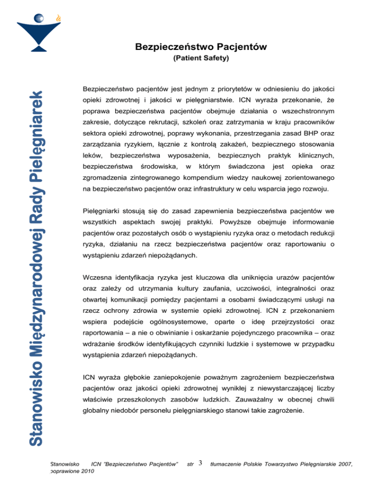Bezpieczeństwo Pacjentów Stanowisko Międzynarodowej Rady Pielęgniarek (Patient Safety) Bezpieczeństwo pacjentów jest jednym z priorytetów w odniesieniu do jakości opieki zdrowotnej i jakości w pielęgniarstwie. ICN wyraża przekonanie, że poprawa bezpieczeństwa pacjentów obejmuje działania o wszechstronnym zakresie, dotyczące rekrutacji, szkoleń oraz zatrzymania w kraju pracowników sektora opieki zdrowotnej, poprawy wykonania, przestrzegania zasad BHP oraz zarządzania ryzykiem, łącznie z kontrolą zakażeń, bezpiecznego stosowania leków, bezpieczeństwa bezpieczeństwa wyposażenia, środowiska, w bezpiecznych którym świadczona praktyk jest klinicznych, opieka oraz zgromadzenia zintegrowanego kompendium wiedzy naukowej zorientowanego na bezpieczeństwo pacjentów oraz infrastruktury w celu wsparcia jego rozwoju. Pielęgniarki stosują się do zasad zapewnienia bezpieczeństwa pacjentów we wszystkich aspektach swojej praktyki. Powyższe obejmuje informowanie pacjentów oraz pozostałych osób o wystąpieniu ryzyka oraz o metodach redukcji ryzyka, działaniu na rzecz bezpieczeństwa pacjentów oraz raportowaniu o wystąpieniu zdarzeń niepożądanych. Wczesna identyfikacja ryzyka jest kluczowa dla uniknięcia urazów pacjentów oraz zależy od utrzymania kultury zaufania, uczciwości, integralności oraz otwartej komunikacji pomiędzy pacjentami a osobami świadczącymi usługi na rzecz ochrony zdrowia w systemie opieki zdrowotnej. ICN z przekonaniem wspiera podejście ogólnosystemowe, oparte o ideę przejrzystości oraz raportowania – a nie o obwinianie i oskarżanie pojedynczego pracownika – oraz wdrażanie środków identyfikujących czynniki ludzkie i systemowe w przypadku wystąpienia zdarzeń niepożądanych. ICN wyraża głębokie zaniepokojenie poważnym zagrożeniem bezpieczeństwa pacjentów oraz jakości opieki zdrowotnej wynikłej z niewystarczającej liczby właściwie przeszkolonych zasobów ludzkich. Zauważalny w obecnej chwili globalny niedobór personelu pielęgniarskiego stanowi takie zagrożenie. Stanowisko ICN ”Bezpieczeństwo Pacjentów” poprawione 2010 str 3 tłumaczenie Polskie Towarzystwo Pielęgniarskie 2007, ICN wierzy, że pielęgniarki oraz krajowe stowarzyszenia pielęgniarek mają obowiązek: Informować pacjentów oraz ich rodziny o potencjalnym ryzyku; Bezzwłocznie raportować o zdarzeniach niepożądanych właściwym władzom; Odgrywać aktywną rolę w ocenie bezpieczeństwa oraz jakości opieki; Usprawniać komunikację z pacjentami oraz innymi pracownikami sektora ochrony zdrowia; Prowadzić lobbing na rzecz odpowiednich poziomów obsady kadrowej; Wspierać stosowanie środków poprawiających bezpieczeństwo pacjentów; Promować programy na rzecz ścisłej kontroli zakażeń; Prowadzić lobbing na rzecz standaryzacji polityk i protokołów leczenia, mających na celu minimalizację błędów; Współpracować z organami zawodowymi reprezentującymi farmaceutów, lekarzy oraz inne zawody w celu poprawy jakości opakowań oraz etykietowania leków; Współpracować z krajowymi systemami raportowania w celu rejestracji, analizy i nauki na podstawie zaistniałych zdarzeń niepożądanych; Tworzyć mechanizmy, na przykład poprzez proces akredytacyjny, aby określić cechy pracowników sektora ochrony zdrowia, których postępowanie może stanowić wyznacznik doskonałości w zapewnieniu bezpieczeństwa pacjenta. Tło: Mimo że działania opieki zdrowotnej mają przynosić korzyści społeczeństwu, istnieje ryzyko wystąpienia błędów oraz zdarzeń niepożądanych, jako rezultat złożonej kombinacji procesów, technologii oraz czynnika ludzkiego związanych z ochroną zdrowia. Zdarzenie niepożądane można zdefiniować jako szkodę lub uraz spowodowany przeważnie w trakcie leczenia choroby lub poprawy stanu zdrowia pacjenta przez pracowników sektora opieki zdrowotnej, natomiast rzadziej poprzez chorobę zasadniczą lub stan pacjenta1. Powszechnie spotykane zagrożenia dla bezpieczeństwa pacjentów obejmują błędy lekarskie, infekcje nabyte w szpitalu, narażenie na wysokie dawki promieniowania oraz stosowanie leków przeterminowanych. 1 Thomas, E.J. oraz Brennan, BMJ, Występowanie oraz rodzaje możliwych do uniknięcia zdarzeń niepożądanych u starszych pacjentów: ocena badań lekarskich na postawie populacji, 18 marca 2000 roku:9. Stanowisko ICN ”Bezpieczeństwo Pacjentów” poprawione 2010 str 4 tłumaczenie Polskie Towarzystwo Pielęgniarskie 2007, Mimo że błędy ludzkie odgrywają znaczną rolę w przypadku wystąpienia zdarzeń niepożądanych, są to nieodłączne czynniki systemowe, które adresowane właściwie, mogłyby zapobiegać występowaniu błędów. Pojawia się coraz więcej dowodów wskazujących na to, że niewłaściwe poziomy obsady kadrowej w placówkach są związane ze wzrostem występowania zdarzeń niepożądanych takich jak: zaburzenia równowagi, odleżyny, błędy lekarskie, zakażenia szpitalne oraz wskaźnikami ponownej hospitalizacji, które mogą prowadzić do dłuższych pobytów w szpitalu oraz zwiększenia wskaźnika śmiertelności szpitalnej2. Niedobór personelu oraz niska jakość działań personelu spowodowana niewystarczającym poziomem motywacji lub też niewystarczającymi umiejętnościami technicznymi stanowią również istotne czynniki determinujące bezpieczeństwo pacjentów. Niska jakość opieki zdrowotnej powoduje większość zdarzeń niepożądanych, mający znaczny wpływ finansowy na wydatki związane z ochroną zdrowia. Przyjęto w roku 2002 Powiązane Stanowiska ICN: Publikacje ICN: Ochrona Tytułu „Pielęgniarka” Bezpieczeństwo pacjentów WHPA, Arkusz informacyjny (2001) Przepisy dotyczące pielęgniarstwa Zakres praktyki pielęgniarskiej, Asystujący i pomocniczy personel pielęgniarski Międzynarodowa Rada Pielęgniarek jest federacją ponad 120 krajowych stowarzyszeń pielęgniarek reprezentujących miliony pielęgniarek na całym świe