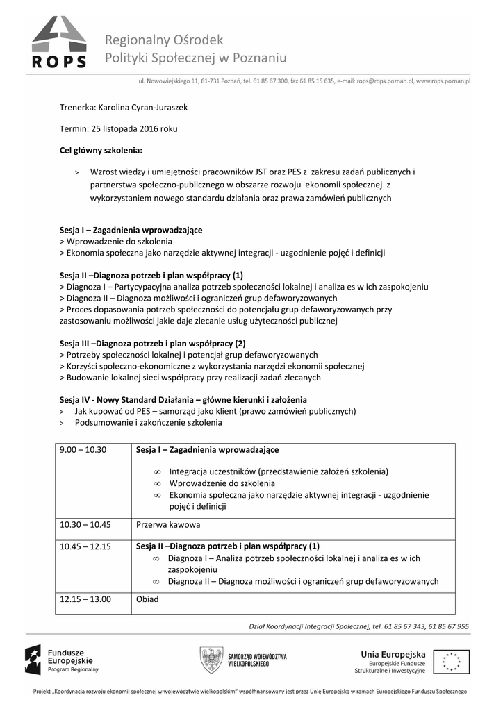 Trenerka: Karolina Cyran-Juraszek Termin: 25 listopada 2016 roku Cel główny szkolenia: > Wzrost wiedzy i umiejętności pracowników JST oraz PES z zakresu zadań publicznych i partnerstwa społeczno-publicznego w obszarze rozwoju ekonomii społecznej z wykorzystaniem nowego standardu działania oraz prawa zamówień publicznych Sesja I – Zagadnienia wprowadzające > Wprowadzenie do szkolenia > Ekonomia społeczna jako narzędzie aktywnej integracji - uzgodnienie pojęć i definicji Sesja II –Diagnoza potrzeb i plan współpracy (1) > Diagnoza I – Partycypacyjna analiza potrzeb społeczności lokalnej i analiza es w ich zaspokojeniu > Diagnoza II – Diagnoza możliwości i ograniczeń grup defaworyzowanych > Proces dopasowania potrzeb społeczności do potencjału grup defaworyzowanych przy zastosowaniu możliwości jakie daje zlecanie usług użyteczności publicznej Sesja III –Diagnoza potrzeb i plan współpracy (2) > Potrzeby społeczności lokalnej i potencjał grup defaworyzowanych > Korzyści społeczno-ekonomiczne z wykorzystania narzędzi ekonomii społecznej > Budowanie lokalnej sieci współpracy przy realizacji zadań zlecanych Sesja IV - Nowy Standard Działania – główne kierunki i założenia > Jak kupować od PES – samorząd jako klient (prawo zamówień publicznych) > Podsumowanie i zakończenie szkolenia 9.00 – 10.30 Sesja I – Zagadnienia wprowadzające • • • Integracja uczestników (przedstawienie założeń szkolenia) Wprowadzenie do szkolenia Ekonomia społeczna jako narzędzie aktywnej integracji - uzgodnienie pojęć i definicji 10.30 – 10.45 Przerwa kawowa 10.45 – 12.15 Sesja II –Diagnoza potrzeb i plan współpracy (1) • Diagnoza I – Analiza potrzeb społeczności lokalnej i analiza es w ich zaspokojeniu • Diagnoza II – Diagnoza możliwości i ograniczeń grup defaworyzowanych 12.15 – 13.00 Obiad 13.00 – 14.30 Sesja III –Diagnoza potrzeb i plan współpracy (2) • Potrzeby społeczności lokalnej i potencjał grup defaworyzowanych • Korzyści społeczno-ekonomiczne z wykorzystania narzędzi ekonomii społecznej • Budowanie lokalnej sieci współpracy przy realizacji zadań zlecanych 14.30 – 14.45 Przerwa kawowa 14.45 – 16.00 Sesja IV - Jak kupować od PES - główne kierunki i założenia • Samorząd jako klient i jakie ma możliwości prawne • Nowy Standard Działania – model współpracy • Podsumowanie i zakończenie szkolenia
