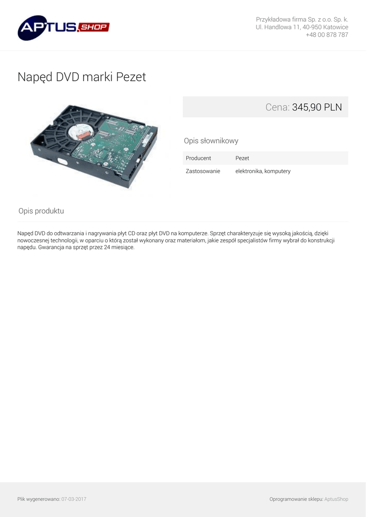 Przykładowa firma Sp. z o.o. Sp. k. Ul. Handlowa 11, 40-950 Katowice +48 00 878 787 Napęd DVD marki Pezet Cena: 345,90 PLN Opis słownikowy Producent Pezet Zastosowanie elektronika, komputery Opis produktu Napęd DVD do odtwarzania i nagrywania płyt CD oraz płyt DVD na komputerze. Sprzęt charakteryzuje się wysoką jakością, dzięki nowoczesnej technologii, w oparciu o którą został wykonany oraz materiałom, jakie zespół specjalistów firmy wybrał do konstrukcji napędu. Gwarancja na sprzęt przez 24 miesiące. Plik wygenerowano: 07-03-2017 Powered by TCPDF (www.tcpdf.org) Oprogramowanie sklepu: AptusShop