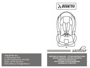 "COLETTO" S.C. ul. Warszawska 320, 42-200 Częstochowa, POLAND tel/fax +48 34 325 36 87 www.coletto.pl, [email protected] INSTRUKCJA OBSŁUGI - FITTING INSTRUCTIONS NÁVOD K POUŽITÍ - NÁVOD K POUŽITIU GEBRAUCHSANLEITUNG ИНСТРУКЦИЯ ПО ОСЛУЖИВАНИЮ HASZNÁLATI ÚTMUTATÓ 1 2 3 4 PL Drodzy Rodzice, Dziękujemy za zakup fotelika samochodowego Santino firmy COLETTO. Prosimy o upewnienie się, czy jest on dostosowany do wieku i wagi Waszego dziecka i czy jest odpowiedni do Państwa samochodu. Fotelik ten przeznaczony jest dla dzieci o wadze od 9 kg do 25 kg. Badania pokazały, że bardzo duża część fotelików była niepoprawnie zainstalowana lub niewłaściwie użytkowana. Tak więc zalecamy dokładnie przeczytanie instrukcji przed umieszczeniem dziecka w foteliku. Fotelik Coletto Santino został stworzony w oparciu o certyfikat ECE 44. Jeżeli macie Państwo pytania dotyczące użytkowania tego fotelika, prosimy o kontakt z dystrybutorem lub sprzedawcą. WAŻNE - Upewnij się, że fotelik jest odpowiedni dla Grupy I (9-18 kg) i dla Grupy II (15-25 kg); lub dla grupy wiekowej od 9 miesięcy do 4 lat. - Uważnie przeczytaj instrukcję i zawsze stosuj się do jej zaleceń. Fotelik ten zapewnia bezpieczeństwo tylko wtedy, gdy jest poprawnie zainstalowany w oparciu o niniejszą instrukcję. - Właściwa instalacja jest niezwykle ważna dla bezpieczeństwa Twojego dziecka. Pasy bezpieczeństwa w pojeździe muszą być przeciągnięte wzdłuż czerwonych prowadnic na foteliku. Nigdy nie próbuj inaczej prowadzić pasów niż zalecane. - Najbezpieczniejsze miejsce dla fotelika to tylne siedzenie samochodu i zamocowanie go wyłącznie przodem do kierunku jazdy za pomocą 3punktowych pasów bezpieczeństwa spełniających normę ECE R16 lub inny odpowiedni standard. Pamiętaj aby nigdy nie umieszczać fotelika Santino na siedzeniach wyposażonych w przednią poduszkę powietrzną, ponieważ może to spowodować ciężkie obrażenia lub śmierć. - Upewnij się, że w pojeździe nie ma ciężkich przedmiotów, przedmiotów z ostrymi krawędziami lub innych nie przymocowanych w pojeździe. - Pas nie może być w żadnym przypadku skręcony. - Fotelik musi być używany wyłącznie z założonym pokryciem materiałowym. Prosimy używać wyłącznie oryginalnego pokrycia, które podnosi bezpieczeństwo fotelika. - Fotelik musi być zawsze przypięty pasami w samochodzie. - Prosimy o zachowanie niniejszej instrukcji na przyszłość. - Zalecamy nie używać fotelika odkupionego od innych osób, jeśli nie znamy dobrze jego historii (czy np. nie brał udziału w wypadku). - Upewnij się, że pasy w foteliku są odpowiednio wyregulowane. Powinny być tak napięte, aby pomiędzy klatkę piersiową dziecka i pasy można było włożyć tylko jeden lub dwa palce. 5 6 - Nigdy nie zostawiaj dziecka w foteliku bez opieki. - Upewnij się, że dziecko nie bawi się klamrą odpinającą pasy. - Podczas długiej podróży należy zatrzymywać się na krótkie przerwy dla odpoczynku dziecka i zaczerpnięcia świeżego powietrza. - Nigdy nie dodawaj żadnych części do fotelika i zawsze postępuj z zaleceniami niniejszej instrukcji. Części fotelika: 1. Pokrycie materiałowe 2. Prowadnica pasów 3. Konstrukcja 4. Drążek mocujący z zatrzaskiem. 5. Zatrzask mocujący. 6. Miejsce na instrukcję. 7. Prowadnica pasa biodrowego. 8. Naklejki z instrukcją montażu. 9. Sprzączka. 10. Prowadnica pasów. 11. Podstawka (baza). 12. Oparcie. 13. Zagłówek. 14. Otwory na pasy. 15. Osłonki na pasy. 16. Pas ramieniowy. 17. Zatrzask mocujący pasy. 18. Pas krokowy. 19. Poduszka. 20. Centralny regulator pasów. 21. Osłonka regulatora pasów. 22. Regulator położenia. 23. Pas regulujący. Instalacja fotelika za pomocą 3-punktowych pasów bezpieczeństwa. Fotelik Santino firmy Coletto może być jedynie używany z automatycznymi 3 -punktowymi pasami bezpieczeństwa (F1). Fotelik może być zamocowany przodem do kierunku jazdy na tylnym siedzeniu w samochodzie przy użyciu znajdujących się w pojeździe pasów bezpieczeństwa. Jednakże, jeśli na niektórych siedzeniach instalacja nie przebiegnie poprawnie, sugerujemy zamocowanie na innym siedzeniu w samochodzie. 7 5 pozycji fotelika Fotelik Santino może być używany w pięciu pozycjach (F2): Pociągnij za regulator położenia znajdujący się z przodu fotelika (pod siedzeniem) i ustaw go w wybranej pozycji. Usłyszysz delikatne kliknięcie. Sposób mocowania fotelika dla grupy I (9-18kg) a) Umieść fotelik w pozycji do spania 3 lub 4 (F3). b) Wyciągnij drążek mocujący (F4). c) Pociągnij i przytrzymaj konstrukcję, a następnie przeciągnij pas pomiędzy konstrukcją i bazą, zamocuj pas i zapnij zatrzask. Upewnij się, że pas nie jest skręcony. (F5) Upewnij się, że pas ramieniowy przebiega od góry siedzenia przez zatrzask mocujący (F5-A) a pas biodrowy przez prowadnicę pasa biodrowego (F5-B), łączy się z pasem ramieniowym. Zapnij pas. d) Umieść konstrukcję z powrotem na bazie i włóż drążek do otworu i zapnij zabezpieczenie (usłyszysz kliknięcie). e) Ustaw fotelik w pozycji najbardziej komfortowej dla Twojego dziecka. Sposób mocowania fotelika dla grupy II (15-25kg) Ten sposób mocowania fotelika stosowany jest dla dzieci z grupy II (1525kg). Najpierw należy usunąć system pasów fotelika, łącznie z osłonkami na pasy, zatrzaskiem i pasem krokowym, a następnie przeciągnąć pas samochodowy (biodrowy i ramieniowy) przez prowadnice pasów (F6 A) i (F7). Umieszczanie dziecka w foteliku Santino: a) Rozluźnij i pociągnij pasy ramieniowe do siebie. Ważne: nie ciągnij za osłonki pasów (F8-F9). b) Naciśnij czerwony przycisk by otworzyć zatrzask (F10). c) Rozłóż pasy po obu stronach fotelika (F11). d) Umieść dziecko w foteliku (F13). e) Złącz zapięcia pasów i włóż je do zatrzasku. (F13) f) Upewnij się, że pasy ramieniowe przylegają do dziecka poprzez pociągnięcie za pas regulujący. (F14). UWAGA! 