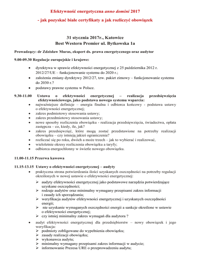 Efektywność energetyczna anno domini 2017 - jak pozyskać białe certyfikaty a jak rozliczyć obowiązek 31 stycznia 2017r., Katowice Best Western Premier ul. Bytkowska 1a Prowadzący: dr Zdzisław Muras, ekspert ds. prawa energetycznego oraz audytor 9.00-09.30 Regulacje europejskie i krajowe: 9.30-11.00 dyrektywa w sprawie efektywności energetycznej z 25 października 2012 r. 2012/27/UE – funkcjonowanie systemu do 2020 r.; założenia zmiany dyrektywy 2012/27, tzw. pakiet zimowy – funkcjonowanie systemu do 2030 r.? podstawy prawne systemu w Polsce. Ustawa o efektywności energetycznej – realizacja przedsięwzięcia efektywnościowego, jako podstawa nowego systemu wsparcia: najważniejsze definicje – energia finalna i odbiorca końcowy - podstawa ustawy o efektywności energetycznej; zakres podmiotowy stosowania ustawy; zakres przedmiotowy stosowania ustawy; nowe sposoby rozliczenia obowiązku - realizacja przedsięwzięcia, świadectwa, opłata zastępcza – co, kiedy, ile, jak? zakres przedsięwzięć, które mogą zostać przedstawione na potrzeby realizacji obowiązku – czy istnieją jakieś ograniczenia? rozliczać się po roku, dwóch a może trzech – jak to wybierać i realizować, wieloletnie okresy rozliczenia obowiązku a taryfy; odbiorca energochłonny w świetle nowego obowiązku. 11.00-11.15 Przerwa kawowa 11.15-13.15 Ustawy o efektywności energetycznej – audyty praktyczna strona potwierdzania ilości uzyskanych oszczędności na potrzeby regulacji określonych w nowej ustawie o efektywności energetycznej: audyty efektywności energetycznej jako podstawowe narzędzia potwierdzające uzyskane oszczędności; rodzaje audytów oraz minimalny wymagany przepisami zakres informacji i zasady ich sporządzania; weryfikacja audytów efektywności energetycznej i uzyskanych oszczędności energii; nie uzyskanie wymaganych oszczędności energii a sankcje określone w ustawie o efektywności energetycznej; czy istniej minimalny zakres wymagań dla audytora ? audyt efektywności energetycznej dla przedsiębiorstw – nowy obowiązek i jego weryfikacja: podmioty zobligowane do wypełnienia obowiązku; zasady realizacji obowiązku; wykonawca audytu; minimalny wymagany przepisami zakres informacji w audycie; informowanie Prezesa URE o przeprowadzeniu audytu; obowiązek, jako regulacja której umiejętna realizacja może przynieść wymierne korzyści dla przedsiębiorcy; zwolnienia z obowiązku przeprowadzenia audytu. 13.15.14.00 Lunch 14.00-15.15 Ustawy o efektywności energetycznej – białe certyfikaty nowy zakres przedsięwzięć za które można uzyskać białe certyfikaty; wyłączenia i ograniczenia w zakresie korzystania z systemu białych certyfikatów; nowe zasady uzyskania świadectw efektywności energetycznej – bark przetargu! świadectwa za przedsięwzięcia „nie dające” oszczędności energii finalnej; nowe zasady wydawania świadectw efektywności energetycznej; kontrole przeprowadzane przez organ regulacyjny; okres przejściowy – jak nie stracić posiadanych stracić świadectw i jak je uzyskać za „stare” przedsięwzięcia; okresy ważności białych certyfikatów ze „starego” i „nowego” systemu 15.15 – 15.45 Zasady rozliczenia obowiązku umorzenia białych certyfikatów za 2016, 2017 i lata następne dwa systemy – jeden podmiot rozliczany czyli „stary i nowy system efektywności energetycznej”: dwa okresy rozliczeniowe za 2016 r. – najważniejsze daty i podejmowane czynności przez przedsiębiorców; podmioty zobowiązane do umarzania białych certyfikatów; zakres przedmiotowy obowiązku; opłata zastępcza; ile trzeba będzie zapłacić jeśli nie zrealizuje się własnej oszczędności. 15.45-16.00 Poziom i podstawy wymierzania kar pieniężnych jak długo można rozliczać „stary system” – podmioty korzystające z systemu wsparcia oraz podmioty zobowiązane, rozliczenie za brak realizacji obowiązku realizacji przedsięwzięcia lub umorzenia białych certyfikatów – podmioty zobowiązane; zasady wymiaru kar pieniężnych przez prezesa URE. * DYSKUSJA PRZEWIDYWANA PRZY KAŻDYM BLOKU TEMATYCZNYM Dr Zdzisław Muras – dr nauk prawnych, radca prawny, wieloletni pracownik URE. Autor i współautor kilkudziesięciu publikacji naukowych, w tym dziewiętnastu książek i opracowań zwartych, licznych glos do orzeczeń Sądu Najwyższego i artykułów z zakresu postępowania karnego, prawa wykroczeń, administracyjnego, gospodarczego oraz prawa energetycznego (związanych z energetyką odnawialną, efektywnością energetyczną, kogeneracją, koncesjonowaniem, czy rynkiem paliw ciekłych). Jest redaktorem i współautorem m.in. komentarza do Prawa energetycznego (2016 r.) oraz autorem podręczników Podstawy prawa (2015) i Encyklopedyczny zarys prawa. Prawo dla ekonomistów (2005). Drugi wykładowca - audyty