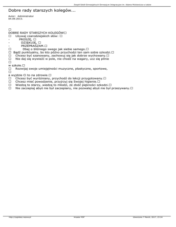 Zespół Szkół Gimnazjalnych Gimnazjum Integracyjne im. Adama Mickiewicza w Łobzie Dobre rady starszych kolegów... Autor: Administrator 04.09.2013. DOBRE RADY STARSZYCH KOLEGÓW · Używaj czarodziejskich słów: PROSZĘ, DZIĘKUJĘ, PRZEPRASZAM. · Dbaj o bliźniego swego jak siebie samego. · Bądź punktualny, bo kto późno przychodzi ten sam sobie szkodzi. · Chcesz być szanowany, zachowuj się jak dobrze wychowany. · Nie daj się wywieźć w pole, nie chodź na wagary, ucz się pilnie w szkole. · Rozwijaj swoje umiejętności muzyczne, plastyczne, sportowe, a wyjdzie Ci to na zdrowie. · Chcesz być wyróżniany, przychodź do lekcji przygotowany. · Chcesz mieć powodzenie, przyjrzyj się Swojej higienie. · Wiedzą to starzy, wiedzą to młodzi, że złość piękności szkodzi. · Nie zaczepiaj abyś nie był zaczepiany, nie pozwalaj abyś nie był przezywany. http://zsglobez.nazwa.pl Kreator PDF Utworzono 7 March, 2017, 15:24