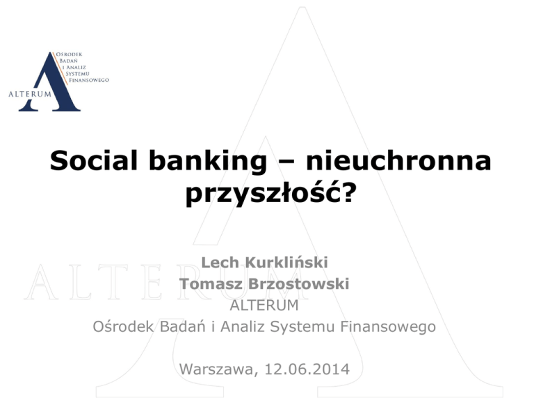 Social banking – nieuchronna przyszłość? Lech Kurkliński Tomasz Brzostowski ALTERUM Ośrodek Badań i Analiz Systemu Finansowego Warszawa, 12.06.2014 Pytania • Czy social banking to tylko ciekawostka, czy już poważne wyzwanie? • Jak ważny jest social banking dla polskich banków dziś? • Jak ocenić można social banking w Polsce i na świecie? • Co powinniśmy robić? 2 Polski sektor bankowy vs świat w mediach społecznościowych PRZYKŁADY Z FACEBOOKA Polska Liczba użytkowników Zmiana 6M ER Udział Baśki z Banku BGŻ 189 000 -1% 8% 1,56% Bank Zachodni WBK 162 000 +18% 9% 1,33% mBank Polska 149 000 +40% 14% 1,22% Świat Liczba użytkowników Zmiana 6M ER Udział ICICI Bank 2 967 000 +15% 14% 3,03% Gtbank 1 936 000 +30% 5% 16,14% Bank of America 1 772 000 +24% 13% 0,98% Źródło: Facebook statistics for Poland, India, Nigeria, United States, www.allin1social.com, 31.05.2014 3 Social banking – koncepcja Już teraz możesz: - Otworzyć konto - Dokonać płatności - Sprawdzić stan rachunku W przyszłości: Nowy paradygmat relacji doprowadzi do wykreowania nowych produktów i usług. Źródło: www.gtbank.com 4 Przykłady angażowania społeczności Akcje charytatywne i konkursy Źródło: www.bankofamerica.com Bank of America Źródło: www. asb.co.nz Auckland Savings Bank 5 Przykłady społecznościowych aplikacji Línea Abierta CaixaBank „Otwarta linia”: - Płatności - Stan rachunków - Personalizacja karty - Wpłaty (mikro) na cele charytatywne - Prezentacja danych w postaci użytecznego dashboardu Źródło: http://www.blog.lacaixa.es/2010/05/la-caixa-ya-esta-en-el-ipad.html Social Banking Gtbank: - Płatności - Stan rachunków - Możliwość otwarcia konta - Możliwość „doładowania” telefonu 6 Źródło: www.gtbank.com Kryzys w social media czyli czego banki boją się najbardziej „Niewinna” opłata za kartę doprowadziła do utraty… 650 tys. klientów! Źródło: http://www.winningprogressive.org/damn-it-feels-good-to-be-a-banksta 7 Jakie tematy poruszane były przez Pana/Panią w postach/tweetach na temat danego banku? 30% 35% 8 Źródło: A. Wójcik, badanie SGH, 2014 N = 407 Główne wyzwania 1. Kultura organizacyjna Dostęp, współpraca, transparentność 2. Struktura organizacyjna Zagwarantowanie przywództwa Zapewnienie stałej edukacji Stworzenie procesów i procedur 3. Dane z social media Social CRM Crowdsourcing 9 Źródło: http://www.banking-gateway.com/projects/future-banking-lithium-technologies-social-media-mobile/ Oczekiwania wobec social media (PR-owcy) - 2012 10 Źródło: Instytut Monitorowania Mediów Banki najbliższe klientowi – 2013 11 Źródło: Badanie Expander, Indicator, DGP Social banking Potencjał: • budowania • niszczenia 12
