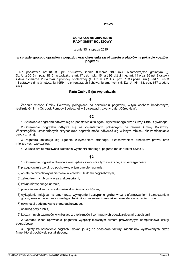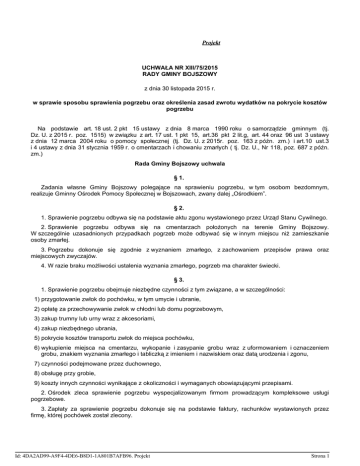 Projekt UCHWAŁA NR XIII/75/2015 RADY GMINY BOJSZOWY z dnia 30 listopada 2015 r. w sprawie sposobu sprawienia pogrzebu oraz określenia zasad zwrotu wydatków na pokrycie kosztów pogrzebu Na podstawie art. 18 ust. 2 pkt 15 ustawy z dnia 8 marca 1990 roku o samorządzie gminnym (tj. Dz. U. z 2015 r. poz. 1515) w związku z art. 17 ust. 1 pkt 15, art.36 pkt 2 lit.g, art. 44 oraz 96 ust 3 ustawy z dnia 12 marca 2004 roku o pomocy społecznej (tj. Dz. U. z 2015r. poz. 163 z późn. zm.) i art.10 ust.3 i 4 ustawy z dnia 31 stycznia 1959 r. o cmentarzach i chowaniu zmarłych ( tj. Dz. U., Nr 118, poz. 687 z późn. zm.) Rada Gminy Bojszowy uchwala § 1. Zadania własne Gminy Bojszowy polegające na sprawieniu pogrzebu, w tym osobom bezdomnym, realizuje Gminny Ośrodek Pomocy Społecznej w Bojszowach, zwany dalej „Ośrodkiem”. § 2. 1. Sprawienie pogrzebu odbywa się na podstawie aktu zgonu wystawionego przez Urząd Stanu Cywilnego. 2. Sprawienie pogrzebu odbywa się na cmentarzach położonych na terenie Gminy Bojszowy. W szczególnie uzasadnionych przypadkach pogrzeb może odbywać się w innym miejscu niż zamieszkanie osoby zmarłej. 3. Pogrzebu dokonuje się zgodnie z wyznaniem zmarłego, z zachowaniem przepisów prawa oraz miejscowych zwyczajów. 4. W razie braku możliwości ustalenia wyznania zmarłego, pogrzeb ma charakter świecki. § 3. 1. Sprawienie pogrzebu obejmuje niezbędne czynności z tym związane, a w szczególności: 1) przygotowanie zwłok do pochówku, w tym umycie i ubranie, 2) opłatę za przechowywanie zwłok w chłodni lub domu pogrzebowym, 3) zakup trumny lub urny wraz z akcesoriami, 4) zakup niezbędnego ubrania, 5) pokrycie kosztów transportu zwłok do miejsca pochówku, 6) wykupienie miejsca na cmentarzu, wykopanie i zasypanie grobu wraz z uformowaniem i oznaczeniem grobu, znakiem wyznania zmarłego i tabliczką z imieniem i nazwiskiem oraz datą urodzenia i zgonu, 7) czynności podejmowane przez duchownego, 8) obsługę przy grobie, 9) koszty innych czynności wynikające z okoliczności i wymaganych obowiązującymi przepisami. 2. Ośrodek zleca sprawienie pogrzebu wyspecjalizowanym firmom prowadzącym kompleksowe usługi pogrzebowe. 3. Zapłaty za sprawienie pogrzebu dokonuje się na podstawie faktury, rachunków wystawionych przez firmę, której pochówek został zlecony. Id: 4DA2AD99-A9F4-4DE6-B8D1-1A801B7AFB96. Projekt Strona 1 4. Koszt sprawienia pogrzebu przez Ośrodek nie może przekroczyć wysokości zasiłku pogrzebowego określonego w ustawie z dnia 17 grudnia 1998 roku o emeryturach i rentach z Funduszu Ubezpieczeń Społecznych. 5. Wydatki związane z organizacją pogrzebu pokrywa się z budżetu gminy. § 4. 1. Ustala się następujące zasady zwrotu wydatków poniesionych na sprawienie pogrzebu: 1) jeżeli po zmarłym przysługuje zasiłek pogrzebowy z ubezpieczenia społecznego, wydatki w całości pokrywa się z tego zasiłku, 2) jeżeli zmarły pozostawił majątek, a nie przysługuje po nim zasiłek pogrzebowy, wydatki pokrywa się w całości lub w części z masy spadkowej, zgodnie z przepisami prawa spadkowego, 3) jeżeli zmarły był osobą bezdomną, nie przysługiwał po nim zasiłek pogrzebowy z tytułu ubezpieczenia społecznego i nie pozostawił po sobie majątku, koszty pogrzebu finansowane są w całości ze środków gminnych. 2. W szczególnie uzasadnionych przypadkach można odstąpić od żądania zwrotu w całości lub w części wydatków na pokrycie kosztów pogrzebu przez spadkobierców, zwłaszcza gdy: 1) dochód osoby zobowiązanej lub dochód na osobę w rodzinie osoby zobowiązanej nie przekracza kryterium dochodowego określonego w art. 8 ust.1 ustawy o pomocy społecznej, 2) żądanie zwrotu w całości lub w części wydatków na sprawienie pogrzebu stanowiłoby dla osoby zobowiązanej lub rodziny nadmierne obciążenie. 3. Sytuację materialną spadkobierców ustala się na podstawie dokumentów właściwych do ustalenia kryterium dochodowego oraz wywiadu środowiskowego, przeprowadzonego przez pracownika socjalnego. § 5. Wykonanie uchwały powierza się Wójtowi Gminy Bojszowy. § 6. Uchwała wchodzi w życie z dniem podjęcia. Przewodniczący Rady Marek Kumor Id: 4DA2AD99-A9F4-4DE6-B8D1-1A801B7AFB96. Projekt Strona 2