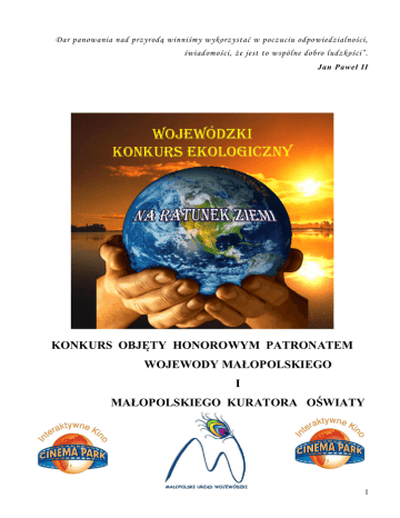 Dar panowania nad przyrodą winniśmy wykorzystać w poczuciu odpowiedzialności, świadomości, że jest to wspólne dobro ludzkości”. Jan Paweł II KONKURS OBJĘTY HONOROWYM PATRONATEM WOJEWODY MAŁOPOLSKIEGO I MAŁOPOLSKIEGO KURATORA OŚWIATY 1 ZASADY I PRZEBIEG WOJEWÓDZKIEGO KONKURSU EKOLOGICZNEGO 2014r Temat konkursu: EKOLOGIA i RYBY CELE: Propagowanie wiedzy przyrodniczej. Rozwijanie uzdolnień i zainteresowań przyrodniczych uczniów. Wyłanianie talentów oraz rozbudzanie ciekawości poznawczej i twórczego działania uczniów. Uwrażliwianie na piękno otaczającego świata. Dostrzeganie realnego zagrożenia życia na Ziemi. Zrozumienie konieczności ochrony środowiska. UCZESTNICY: Uczniowie Przedszkoli i Szkół Podstawowych Uczniowie Gimnazjum Fundacje Osób Niepełnosprawnych, Ośrodki Wsparcia Dziennego i Świetlice Środowiskowe FORMY KONKURSU: turniej wiedzy konkurs plastyczny konkurs literacki konkurs fotograficzny ORGANIZATORZY: Publiczna Szkoła Podstawowa w Trąbkach Gimnazjum w Niegowici KOORDYNATORZY: Dyrektor Szkoły Podstawowej w Trąbkach – mgr Grażyna Pogorzelczyk - Kluska Dyrektor Gimnazjum w Niegowici – mgr inż. Leszek Rajtarski PARTNERZY: Kuratorium Oświaty w Krakowie Wojewoda Małopolski Starostwo Powiatowe w Wieliczce Urząd Gminy w Gdowie Urząd Gminy w Biskupicach Stowarzyszenie na Rzecz EKO-Rozwoju Wsi Trąbki Cinema Park w Krakowie Park Wodny Kraków Kopalnia Soli w Bochni Bank Spółdzielczy w Wieliczce Urzędy Gmin: Kłaj, Niepołomice 2 Harmonogram konkursu Termin do 21.02.2014r. 28.02.2014 r. Zadanie Zgłoszenie udziału w turnieju wiedzy wypełnić kartę zgłoszeniową (zał. nr 1) i wysłać pocztą na adres: Publiczna Szkoła Podstawowa Trąbki 312 32-020 Wieliczka Gimnazjum w Niegowici Niegowić 62 32 – 420 Gdów lub na adres e-mail: [email protected] [email protected] Termin oddawania prac: plastycznych, literackich i fotograficznych. Miejsce: Szkoła Podstawowa w Trąbkach Trąbki 312 32-020 Wieliczka Gimnazjum w Niegowici Niegowić 62 32 – 420 Gdów 11.03.2014 r. Ocena i wybór najlepszych prac plastycznych, literackich i fotograficznych przez komisję powołaną przez organizatorów. W tym dniu zapraszamy chętnych uczestników konkursu wraz z opiekunami do udziału w głosowaniu na specjalną Nagrodę Publiczności Miejsce: Urząd Gminy Biskupice – Tomaszkowice 455 14.03.2014 r. (piątek) godz. 10.00 Turniej wiedzy Przedszkola i Szkoły Podstawowe - Szkoła Podstawowa w Trąbkach Gimnazja – Gimnazjum w Niegowici rejestracja uczestników 9.00 – 9.45 26.03.2014 r. GALA KONKURSU wręczenie nagród i dyplomów wystawa nagrodzonych prac specjalny pokaz w kinie Cinema Park Miejsce: Edukacyjne kino CINEMA PARK BONARKA Informacje o konkursie można uzyskać pod nr telefonu: Szkoła Podstawowa w Trąbkach tel. 12 250 50 55 lub Dominika Nowak tel. 692 201 391 Gimnazjum w Niegowici tel. 12 251 95 15 lub Janina Świeży tel. 501 355 804 3 KONKURS PLASTYCZNY KATEGORIA prace płaskie format: A2 (420mm x 594mm) technika: dowolna prace przestrzenne format: max.(60cm x 60cm x 60cm) technika: dowolna GRUPA WIEKOWA Przedszkola i SP – kl. 0 – I SP – kl. II – III SP – kl. IV – VI Gimnazjum – kl. I – III Przedszkola i SP – kl. 0 – I SP – kl. II – III SP – kl. IV – VI Gimnazjum – kl. I – III Fundacje Osób Niepełnosprawnych Ośrodki Wsparcia Dziennego Świetlice Środowiskowe KONKURS LITERACKI KATEGORIA praca literacka format: max. 1 strona A4 GRUPA WIEKOWA Przedszkola i SP – kl. 0 – III SP – kl. IV – VI Gimnazjum – kl. I – III KONKURS FOTOGRAFICZNY KATEGORIA tylko jedno zdjęcie format: A4 GRUPA WIEKOWA Przedszkola i SP – kl. 0 – VI Gimnazjum – kl. I – III Każda szkoła może przesłać jedną pracę z każdej grupy wiekowej z wymienionych wyżej kategorii. Autorem jednej pracy konkursowej może być tylko jeden uczeń. Wszystkie prace konkursowe: plastyczne, literackie i fotograficzne muszą być opisane na odwrocie zgodnie z podanym wzorem metryczki: Kategoria: ………………………………………..………..……………… Imię i nazwisko:…………………….…………………………………….. Klasa: ………………………………………………………………….….. Szkoła: ………………………..……………………………………………. Opiekun: …………………………………………………………………… Telefon: ……………………………………………………………………. Prace niezgodne z regulaminem zostaną odrzucone. Prace po zakończeniu konkursu można odebrać u organizatorów do 15.04.2014 r. ZAPRASZAMY DO UDZIAŁU, NA FINALISTÓW CZEKAJĄ ATRAKCYJNE NAGRODY ! 4 TURNIEJ WIEDZY – PRZEDSZKOLE I SZKOŁA PODSTAWOWA Każdą Szkołę Podstawową może reprezentować tylko jeden uczeń kategorii. PRZEDSZKOLA i KLASY I - III KLASY IV - VI Uczniowie klas 0 – I wezmą udział w turnieju wiedzy - w formie ustnej oraz testu wyboru – obrazki. Natomiast uczniów klas II-III będzie obowiązywał pisemny test wyboru. Każdą Szkołę Podstawową może reprezentować tylko jeden uczeń. Turniej przeprowadzony jest w formie testu (zadania zamknięte i otwarte). Czas rozwiązania 45 minut. Czas rozwiązania: 45 minut. OGÓLNE ZAGADNIENIA Ekologia: pojęcia ekologiczne: recykling, ekologia, zanieczyszczenie, środowisko; współczesne zagrożenia dla świata przyrody; ochrona przyrody wpływ człowieka na zanieczyszczenie wody Świat zwierząt: ryby morskie i słodkowodne: cechy charakterystyczne przystosowanie ryb do życia w wodzie budowa zewnętrzna ryby nazwy zawodów związanych ze światem zwierząt i ich hodowlą. Literatura: 1. Realizowany program nauczania edukacji w Przedszkolu i Szkole Podstawowej zgodny z podstawą programową. 2. „Ryby polskich stawów, rzek i jezior” Fisher Władysław, wyd. Lettra – Graphic (klasy 0 – I) 3. „Szkolna Encyklopedia Przyrody”, rozdz.5