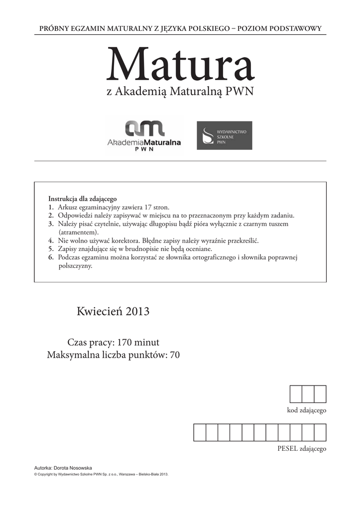 PRÓBNY EGZAMIN MATURALNY Z JĘZYKA POLSKIEGO – POZIOM PODSTAWOWY Matura z Akademią Maturalną PWN Instrukcja dla zdającego 1. Arkusz egzaminacyjny zawiera 17 stron. 2. Odpowiedzi należy zapisywać w miejscu na to przeznaczonym przy każdym zadaniu. 3. Należy pisać czytelnie, używając długopisu bądź pióra wyłącznie z czarnym tuszem (atramentem). 4. Nie wolno używać korektora. Błędne zapisy należy wyraźnie przekreślić. 5. Zapisy znajdujące się w brudnopisie nie będą oceniane. 6. Podczas egzaminu można korzystać ze słownika ortograficznego i słownika poprawnej polszczyzny. Kwiecień 2013 Czas pracy: 170 minut Maksymalna liczba punktów: 70 kod zdającego pesel zdającego Autorka: Dorota Nosowska © Copyright by Wydawnictwo Szkolne PWN Sp. z o.o., Warszawa – Bielsko-Biała 2013. Próbny egzamin maturalny z języka polskiego – poziom podstawowy Część I – Rozumienie czytanego tekstu (0–20) Przeczytaj uważnie tekst, a następnie wykonaj zadania. Odpowiadaj tylko na podstawie tekstu i tylko własnymi słowami – chyba że w zadaniu polecono inaczej. Udzielaj tylu odpowiedzi, o ile jesteś proszony. OBRACHUNKI FREDROWSKIE 1. […]o Fredrze wiemy bardzo mało; a złożyły się na to różne przyczyny. Zawsze był raczej zamknięty w sobie, zanim nawet ku starości stał się zdecydowanym odludkiem i mizantropem. Nie miał mamy, jak słowacki; nie miał muz-kochanek ani tuzina przyjaciół, jak Krasiński; przez co pozbawieni jesteśmy owych listów, które bywają dziennikiem życia poety. W egzystencji jego jest tylko jedna kobieta, ta, która została jego żoną; a listy, jakie wymienili, zniszczyli za obopólną zgodą, aby się nie dostały w świętokradzkie ręce. Dumny karmazyn, który nigdy nie zgodził się być literatem, i po śmierci zachował dystans do krytyczno-literackiego plebsu. 2. A przy tym, zważmy ten paradoks. Im dłużej artysta żyje, tym mniej się o nim wie. Pisane ślady pierwszych okresów jego życia niszczeją, rozpraszają się; towarzysze jego młodości i lat męskich wykruszają się, zstępują przed nim do grobu, nie dając świadectwa swoim wspomnieniom o wielkim człowieku, bo – o żyjących się nie mówi. Fakt życia pisarza nakłada niewinnym nawet niedyskrecjom pieczęć milczenia. A kiedy umiera, już nie ma kto o nim mówić, chyba o takim, jakim był na schyłku. To jest też jeden z powodów, dla którego Fredro został „starym Fredrą”. […] 3. I oto, tuż obok, niepokoi nas nowy pytajnik. Można mówić o tej sprawie, skoro mówią o niej wszyscy pisząc o Fredrze, i skoro on sam zwierzył się nam pośrednio ze swoich uczuć, dając bohaterkom sześciu z rzędu komedii imię Zofiji. Można mówić wreszcie dlatego, że Fredro-pisarz zyskuje na tej niedyskrecji: słabsze nawet jego utwory, jak Przyjaciele, nabierają wyrazu, kiedy wiemy, ile własnych bólów, nadziei, niepewności, ile rozterek własnego serca włożył w ich sceny miłosne. Mówię tutaj – jak każdy zgaduje – o uczuciach jego do młodziutkiej w chwili poznania Zofii skarbkowej, która, po jedenastu latach wytrwałej i podzielanej miłości, miała zostać ukochaną żoną poety. (Hrabia skarbek był jednym z najbogatszych magnatów Galicji; Zofia, wydana piętnastoletnim dzieckiem za tego znacznie starszego od niej człowieka, po kilku latach nieszczęśliwego pożycia wróciła do rodziców). Te jedenastoletnie konkury były dramatem i goryczą życia Fredry; cierpi, szaleje, myśli o samobójstwie; na długie okresy milknie, zagrzebuje się na wsi. 4. Cała ta sprawa, to jest bardzo ciekawy dokument obyczajowy. Jedenaście lat trwa beznadziejna miłość dwojga młodych, wolnych ostatecznie, i pod względem materialnym co najmniej dobrze uposażonych ludzi, którzy nie mogą się połączyć! I przeszkodą nie były tu względy moralne ani religijne, bo te w ówczesnym wielkim świecie Galicji nie były zbyt silne (charakterystyczne jest, że o „rozwodzie kościelnym” mówi się tu zupełnie potocznie, jak o czymś zależnym wyłącznie od decyzji i od hojności rodziny); ale jakiś przemożny konwenans, jakieś familijne kombinacje czy spekulacje. „Miłość do skarbkowej stanęła na martwym punkcie. Wobec stanowczego oporu starszych, niepodobna było nawet marzyć o wszczęciu kroków rozwodowych, choć do takiego rozwiązania skłaniał się ten, kto miał najwięcej do powiedzenia w tej sprawie – hrabia skarbek”. (Kucharski, Życiorys literacki Fredry). 5. Wyznaję, że to, co biograf Fredry przyjmuje jako rzecz naturalną, mnie wydaje się mniej naturalne. Jeżeli sobie uprzytomnimy, że nasz ex-kapitan miał w owej chwili (1824) lat trzydzieści jeden, a młoda „separatka” lat dwadzieścia kilka, nie bardzo widzimy, co tu mieli starsi do gadania? Ta uległość – i to już po pięcioletniej męce i próbie – wydaje się co najmniej dziwna. I Fredro, z woli ojca, jedzie, jak sam opowiada, do Florencji, aby, za pośrednictwem braterstwa, starać się o nieznajomą księżniczkę rosyjską… Dawniej młodzież „w boju dziarska – prym dawała starszym w radzie” – powiada Fredro (zdaje się bez ironii) ustami Cześnika w Zemście. I oto mało brakowało, aby, z rady starszych, w boju dziarski kapitan (czy nawet major) Oleś Fredro ożenił się z niekochaną Rosjanką, tracąc na zawsze i unieszczęśliwiając tę, która miała mu być przez pół wieku najlepszą towarzyszką życia. Nie osłabiło to w niczym jego czci i miłości do ojca, ani też wiary w ojcowski rozum… W końcu stałość zakochanej pary przemogła, starsi „dali na rozwód”, tak jak się daje na zapowiedzi, i rzecz zakończyła się po bożemu. 2 © Copyright by Wydawnictwo Szkolne PWN Sp. z o.o., Warszawa – Bielsko-Biała 2013. Próbny egzamin maturalny z języka polskiego – poziom podstawowy 6. Ta zadziwiająca uległość Fredry wobec imperatywów konwenansu, wobec tej błazeńskiej parodii patriarchalizmu,