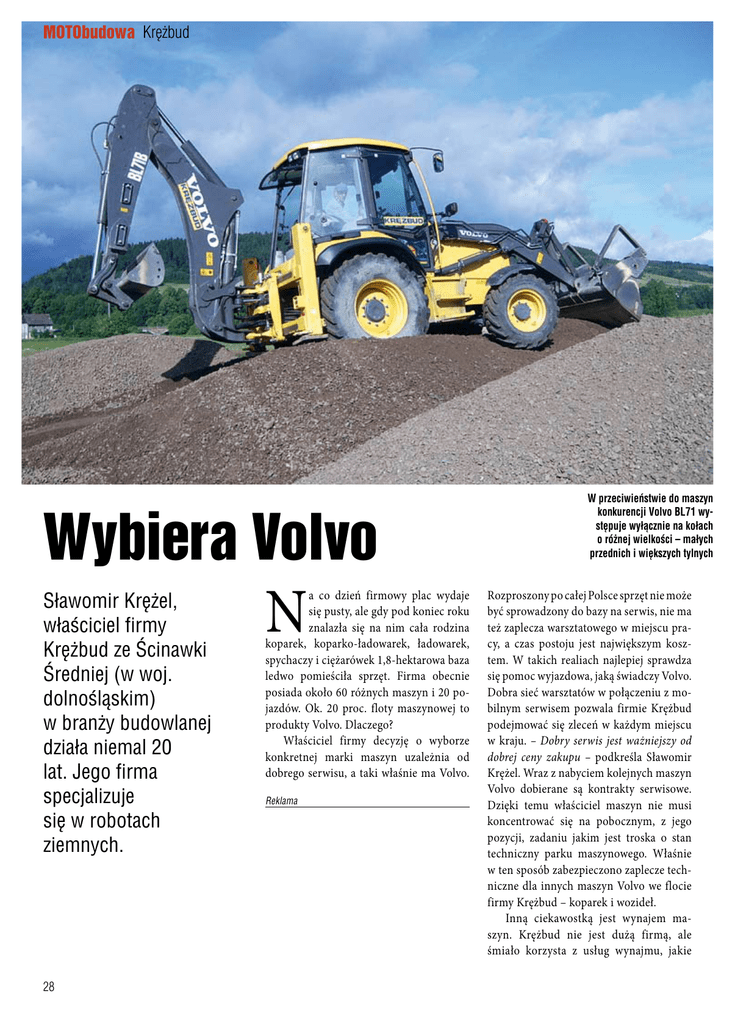 MOTObudowa Krężbud Wybiera Volvo Sławomir Krężel, właściciel firmy Krężbud ze Ścinawki Średniej (w woj. dolnośląskim) w branży budowlanej działa niemal 20 lat. Jego firma specjalizuje się w robotach ziemnych. 28 N a co dzień firmowy plac wydaje się pusty, ale gdy pod koniec roku znalazła się na nim cała rodzina koparek, koparko-ładowarek, ładowarek, spychaczy i ciężarówek 1,8-hektarowa baza ledwo pomieściła sprzęt. Firma obecnie posiada około 60 różnych maszyn i 20 pojazdów. Ok. 20 proc. floty maszynowej to produkty Volvo. Dlaczego? Właściciel firmy decyzję o wyborze konkretnej marki maszyn uzależnia od dobrego serwisu, a taki właśnie ma Volvo. Reklama W przeciwieństwie do maszyn konkurencji Volvo BL71 występuje wyłącznie na kołach o różnej wielkości – małych przednich i większych tylnych Rozproszony po całej Polsce sprzęt nie może być sprowadzony do bazy na serwis, nie ma też zaplecza warsztatowego w miejscu pracy, a czas postoju jest największym kosztem. W takich realiach najlepiej sprawdza się pomoc wyjazdowa, jaką świadczy Volvo. Dobra sieć warsztatów w połączeniu z mobilnym serwisem pozwala firmie Krężbud podejmować się zleceń w każdym miejscu w kraju. – Dobry serwis jest ważniejszy od dobrej ceny zakupu – podkreśla Sławomir Krężel. Wraz z nabyciem kolejnych maszyn Volvo dobierane są kontrakty serwisowe. Dzięki temu właściciel maszyn nie musi koncentrować się na pobocznym, z jego pozycji, zadaniu jakim jest troska o stan techniczny parku maszynowego. Właśnie w ten sposób zabezpieczono zaplecze techniczne dla innych maszyn Volvo we flocie firmy Krężbud – koparek i wozideł. Inną ciekawostką jest wynajem maszyn. Krężbud nie jest dużą firmą, ale śmiało korzysta z usług wynajmu, jakie oferuje Volvo. Wśród powodów takiej formy użytkowania maszyn Sławomir Krężel wymienia łatwość podejmowania zleceń półrocznych, dla których nie opłaca się zakupywać maszyn. Jeżeli potrzebnej maszyny nie ma na stanie firmy, a czas kontraktu oscyluje w okolicach 6 miesięcy wynajem jest najrozsądniejszym rozwiązaniem. Innym powodem wypożyczania maszyn Volvo są przejrzyste procedury, jakie zapewnia szwedzki koncern. W przypadkach większych kontraktów lub trwających dłużej, zdaniem pana Sławomira, opłaca się bardziej skorzystać z leasingu z kontraktem serwisowym. Firma Krężbud unika maszyn używanych. Nabywając nową maszynę, chociaż drożej niż używaną, zakupuje się gwarancję i pewność, że nawet gdy zawiedzie użytkownik nie pozostanie na lodzie. Sławomir Krężel jest też posiadaczem 15-tysięcznej koparko-ładowarki, jaka powstała we wrocławskich zakładach Volvo. Decydując się na kolejną koparko-ładowarkę właściciel z góry określił, że musi to być Volvo. Z maszyny jest bowiem bardzo zadowolony on sam oraz operator, który docenia ergonomię pracy. – Pierwszą koparko-ładowarkę Volvo BL71 moja firma zakupiła w 2006 roku. Przez 5 lat maszyna przepracowała ponad 5000 godzin, bez żadnej awarii, doskonale sprawdziła się przy wykopach, przeładunkach, korytowaniu rowów melioracyjnych i pracach pomocniczych. Niskie zużycie paliwa, świetna obsługa serwisowa i ogólne zadowolenie z maszyny sprawiły, że zdecydowaliśmy się na zakup kolejnej koparko-ładowarki Volvo. Na pewno dodatkowym atutem przy naszym wyborze zarówno pierwszej, jak i drugiej maszyny był fakt, że maszyny te produkowane są we Wrocławiu – mówi Sławomir Krężel. Zdaniem właściciela konstrukcja koparko-ładowarki Volvo jest bardzo przemyślana. W przeciwieństwie do maszyn konkurencji Volvo BL71 występuje wyłącznie na kołach o różnej wielkości – małych przednich i większych tylnych. Ale rozmiar przednich kół jest większy niż małych kół rywali Volvo, a zarazem mniejszy niż kół o równej wielkości stosowanych przez inne firmy. Ten kompromis okazuje się zaletą, gdyż pomimo prostszej konstrukcji maszyna jest bardziej mobilna. Poza Volvo właściciel eksploatuje ma- Sławomir Krężel jest też posiadaczem 15-tysięcznej koparko-ładowarki, jaka powstała we wrocławskich zakładach Volvo szyny innych marek. Są to najczęściej produkty niewystępujące w ofercie szwedzkiej firmy np. spycharki gąsienicowe. Ale gdyby pojawiły się w ofercie Volvo z pewnością pojawią się wówczas w firmie Krężbud. Najbliższe plany firmy to modernizacja floty wywrotek samochodowych – pewnie Volvo FMX. Grzegorz Teperek 29
