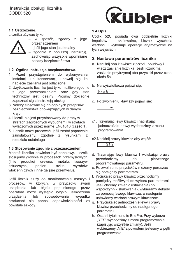 Instrukcja obsługi licznika CODIX 52C 1.1 Ostrzeżenie. Licznika używać tylko: – w sposób, zgodny z jego przeznaczeniem – jeśli jego stan jest idealny – zgodnie z poniższą instrukcją, zachowując wszystkie wpomniane zasady bezpieczeństwa ! 1.2 Ogólna instrukcja bezpieczeństwa. 1. Przed przystąpieniem do wykonywania instalacji lub konserwacji, upewnij się że napięcie zasilania jest odłączone. 2. Użytkowanie licznika jest tylko możliwe zgodnie z jego przeznaczeniem oraz gdy stan techniczny jest idealny. Prosimy dokładnie zapoznać się z instrukcją obsługi. 3. Należy stosować się do ogólnych przepisów bezpieczeństwa obowiązujących w danym kraju. 4. Licznik nie jest przystosowany do pracy w strefach zagrożonych wybuchem i w strefach wyłączonych przez normę EN61010 (część 1). 5. Licznik może pracować, jeśli został poprawnie zainstalowany, zgodnie z rysunkami z rozdziału ostatniego 1.3 Stosowanie zgodnie z przeznaczeniem. Montaż licznika powinien być panelowy. Licznik stosujemy głównie w procesach przemysłowych (linie produkcji drewna, metalu, tworzyw sztucznych, papieru, szkła, wyrobów włókienniczych i inne gałęzie przemysłu). Jeśli licznik służy do monitorowania maszyn i procesów, w których, w przypadku awarii urządzenia lub błędu popełnionego przez operatora może wystąpić ryzyko uszkodzenia urządzenia lub spowodowania wypadku producent nie ponosi odpowiedzialności za powstałe szkody. 1.4 Opis Codix 52C posiada dwa oddzielnie liczniki impulsów – skalowalne, Licznik wyświetla wartości i wykonuje operacje arytmetyczne na tych wejściach. 2. Nastawa parametrów licznika a. Naciśnij oba klawisze z przodu obudowy i włącz zasilanie licznika. Jeśli licznik ma zasilanie przytrzymaj oba przyciski przez czas około 5s. b. Na wyświetlaczu pojawi się: c. Po zwolnieniu klawiszy pojawi się: c1. Trzymając lewy klawisz i naciskając jednocześnie prawy wychodzimy z menu programowania. c2.Naciśnij prawy klawisz aby wejść: . d. Trzymając lewy klawisz I wciskając prawy przechodzimy do pierwszego programowalnego parametru. e. Po zwolnieniu przycisków możemy poruszać się pomiędzy parametrami. f. Wciskając prawy klawisz przechodzimy pomiędzy możliwymi do wyboru parametrami. Jeśli chcemy zmienić ustawienia (np. współczynnik skalowania), wybieramy dekady za pomocą lewego klawisza, a następnie ustawiamy wartość prawym klawiszem. g. Przyciskając jednocześnie lewy i prawy klawisz przechodzimy do następnego parametru. h. Ostatni tytuł menu to EndPro. Przy wyborze „YES” wychodzimy z menu programowania (zapisując wszystkie zmiany). Jeśli wybierzemy „NIE” z powrotem jesteśmy w pętli programowania. 1 1. Parametry licznika • 6-cyfrowy licznik z kasowaniem • Wyświetlacz LED, wysokość cyfry 8mm • Zakres wyświetlania 0 ... 999 999 • Przejście przez zero dozwolone • Programowanie za pomocą 2 przycisków • During programming, the display guides the user with text prompts 4. Cykl programowania Programowane parametry urządzenia zostały opisane poniżej, w kolejności, w jakiej mogą być ustawiane. Urządzenie jest w pełni zaprogramowane po jednym pełnym cyklu. Pierwsze podane wartości są ustawieniami fabrycznymi urządzenia. 4.1 Polaryzacja wejścia 2. Wejścia npn: przełączanie przy 0 V INP A Wejście zliczania A pnp: przełączanie przy +UB INP B Wejście zliczania B 4.2 Załączenie filra 30 Hz f (INP A) RESET Filtr zapewnia tłumienie wejścia Wejście kasowania. Równolegle działające z czerwonym przyciskiem kasowania. Nastawia wartość licznika na zero. Może być ustawiane Filtr wyłączony (fmax) indywidualnie dla wejścia A I B. Wartości A i B mogą być kasowane tylko jeśli są wyświetlane. W Filtr 30 Hz włączony tym celu musi być ustawiony tryb kasowania. 4.3 Współczynnik mnożenia (totalizer A) 3. Wybór wartości wyświetlanych Po naciśnięciu prawego przycisku możemy wybrać poniższe wartości: Wartość A Wartość B Różnica A-B Suma A+B Iloraz A/B Procent (A-B)/A Naciśnięcie klawisza wyświetla odpowiedną funkcję do ok. 1s. Naciśnięcie klawisza po raz drugi w tym czasie przełącza licznik do następnej funkcji, licznik pokazuje potwierdzenie nowej funkcji do 1s. Po tym czasie licznik wyświetla wartość nowej wybranej funkcji. 2 Może być ustawiony od 00.0001 do 99.9999. Punkt dziesiętny jest ustawiony na 4 miejsca. „0“ nie jest akceptowane! 4.4 Współczynnik dzielenia (totalizer A) Może być ustawiony od 00.0001 do 99.9999. Punkt dziesiętny jest ustawiony na 4 miejsca. „0“ nie jest akceptowane! 4.5 Punkt dziesiętny (totalizer A) Punkt dziesiętny określa sposób wyświetlania wartości. Nie wpływa na sposób liczenia. 0 brak przecinka 0.0 jedna liczba po przecinku 0.00 dwie liczby po przecinku 0.000 trzy liczby po przecinku 4.6 Tryb RESET (totalizer A) 5.0 Tryb RESET (totalizer B) kasowanie ręczne za pomocą czerwonego przycisku na obudowie i jednocześnie kasowanie za pomocą wejścia RESET Kasowanie ręczne za pomocą czerwonego przycisku na obudowie I jednocześnie kasowanie za pomocą wejścia RESET kasowanie nieaktywne (blokada przycisku i wejścia RESET) kasowanie nieaktywne (blokada przycisku I wejścia RESET) aktywny tylko RESET elektryczny (wejście RESET) aktywny tylko RESET elektryczny (wejście RESET) aktywny tylko RESET ręczny (przycisk RESET) aktywny tylko RESET ręczny (przycisk RESET) 4.7 Współczynnik mnożenia (totalizer B) 5.1 Koniec programowania Może być ustawiony od 00.0001 do 99.9999. Punkt dziesiętny ustawiony jest na 4 miejsca. „0“ nie jest akceptowane! Cykl programowania zostanie powtórzony. Istnieje możliwość podglądu parametrów i ewentualnie ich poprawy. 4.8 Współczynnik dzielenia (totalizer B) Może być ustawiony od 00.0001 do 99.9999. Punkt dziesiętny ustawiony jest na 4 miejsca. „0“ nie jest akceptowane! Wyjście z menu programowania przy jednoczesnym zapisaniu wszystkic