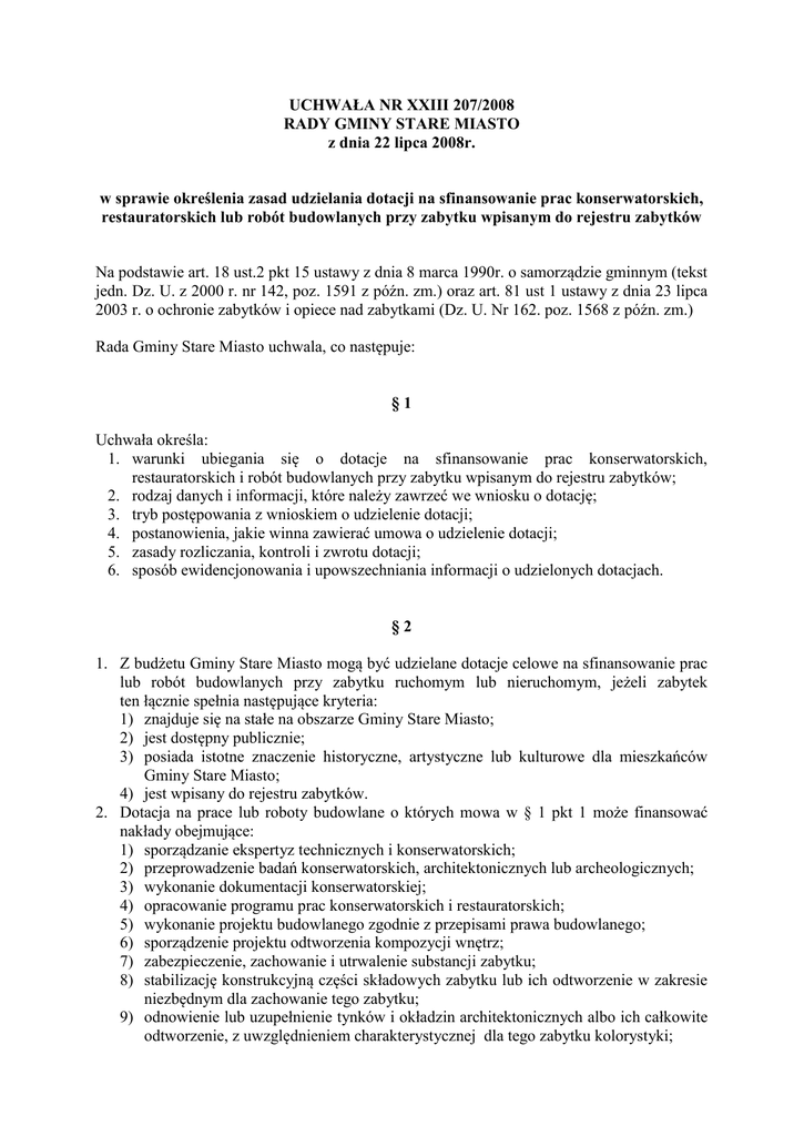 UCHWAŁA NR XXIII 207/2008 RADY GMINY STARE MIASTO z dnia 22 lipca 2008r. w sprawie określenia zasad udzielania dotacji na sfinansowanie prac konserwatorskich, restauratorskich lub robót budowlanych przy zabytku wpisanym do rejestru zabytków Na podstawie art. 18 ust.2 pkt 15 ustawy z dnia 8 marca 1990r. o samorządzie gminnym (tekst jedn. Dz. U. z 2000 r. nr 142, poz. 1591 z późn. zm.) oraz art. 81 ust 1 ustawy z dnia 23 lipca 2003 r. o ochronie zabytków i opiece nad zabytkami (Dz. U. Nr 162. poz. 1568 z późn. zm.) Rada Gminy Stare Miasto uchwala, co następuje: §1 Uchwała określa: 1. warunki ubiegania się o dotacje na sfinansowanie prac konserwatorskich, restauratorskich i robót budowlanych przy zabytku wpisanym do rejestru zabytków; 2. rodzaj danych i informacji, które należy zawrzeć we wniosku o dotację; 3. tryb postępowania z wnioskiem o udzielenie dotacji; 4. postanowienia, jakie winna zawierać umowa o udzielenie dotacji; 5. zasady rozliczania, kontroli i zwrotu dotacji; 6. sposób ewidencjonowania i upowszechniania informacji o udzielonych dotacjach. §2 1. Z budżetu Gminy Stare Miasto mogą być udzielane dotacje celowe na sfinansowanie prac lub robót budowlanych przy zabytku ruchomym lub nieruchomym, jeżeli zabytek ten łącznie spełnia następujące kryteria: 1) znajduje się na stałe na obszarze Gminy Stare Miasto; 2) jest dostępny publicznie; 3) posiada istotne znaczenie historyczne, artystyczne lub kulturowe dla mieszkańców Gminy Stare Miasto; 4) jest wpisany do rejestru zabytków. 2. Dotacja na prace lub roboty budowlane o których mowa w § 1 pkt 1 może finansować nakłady obejmujące: 1) sporządzanie ekspertyz technicznych i konserwatorskich; 2) przeprowadzenie badań konserwatorskich, architektonicznych lub archeologicznych; 3) wykonanie dokumentacji konserwatorskiej; 4) opracowanie programu prac konserwatorskich i restauratorskich; 5) wykonanie projektu budowlanego zgodnie z przepisami prawa budowlanego; 6) sporządzenie projektu odtworzenia kompozycji wnętrz; 7) zabezpieczenie, zachowanie i utrwalenie substancji zabytku; 8) stabilizację konstrukcyjną części składowych zabytku lub ich odtworzenie w zakresie niezbędnym dla zachowanie tego zabytku; 9) odnowienie lub uzupełnienie tynków i okładzin architektonicznych albo ich całkowite odtworzenie, z uwzględnieniem charakterystycznej dla tego zabytku kolorystyki; 10) odtworzenie zniszczonej przynależności zabytku, jeżeli odtworzenie to nie przekracza 50% oryginalnej substancji tej przynależności; 11) odnowienie lub całkowite odtworzenie okien, w tym ościeżnic i okiennic, zewnętrznych odrzwi i drzwi, więźby dachowej, pokrycia dachowego, rynien i rur spustowych; 12) modernizację instalacji elektrycznej w zabytkach drewnianych lub w zabytkach, które posiadają oryginalne, wykonane z drewna części składowe i przynależności; 13) wykonanie izolacji przeciwwilgociowej; 14) uzupełnianie narysów ziemnych dzieł architektury obronnej oraz zabytków archeologicznych nieruchomych o własnych formach krajobrazowych; 15) działania zmierzające do wyeksponowania istniejących, oryginalnych elementów zabytkowego układu parku lub ogrodu; 16) zakup materiałów konserwatorskich i budowlanych, niezbędnych do wykonania prac i robót budowlanych przy zabytku wpisanym do rejestru, o których mowa w pkt 7-15; 17) zakup i montaż instalacji przeciwwłamaniowej oraz przeciwpożarowej i odgromowej. §3 1. O dotację może się ubiegać każdy podmiot będący właścicielem lub posiadaczem zabytku, a także podmiot, który do tego zabytku posiada tytuł prawny wynikający z użytkowania wieczystego, ograniczonego prawa rzeczowego, trwałego zarządu albo stosunku zobowiązaniowego z uwzględnieniem zapisu § 2 ust. 1. 2. Dotacja może być udzielana na sfinansowanie prac lub robót budowlanych przy zabytku, które wnioskodawca zamierza wykonać w roku złożenia wniosku o udzielenie dotacji. §4 Dotacja może być udzielona do 100% wartości nakładów koniecznych na wykonanie prac konserwatorskich, restauratorskich lub robót budowlanych przy zabytku wpisanym do rejestru zabytków. §5 1. We wniosku o przyznanie dotacji należy wskazać: 1) imię, nazwisko, miejsce zamieszkania wnioskodawcy lub nazwę, adres i siedzibę wnioskodawcy będącego jednostka organizacyjną; 2) dane obiektu uwidocznione w rejestrze zabytków; 3) fotograficzną dokumentacje zabytku; 4) dokument potwierdzający tytuł prawny wnioskodawcy do władania zabytkiem; 5) decyzje właściwego organu ochrony zbytków zezwalającą na przeprowadzenie prac lub robót budowlanych przy zabytku oraz projekt i pozwolenie na budowę, gdy wniosek dotyczy prac lub robót budowlanych przy zabytku nieruchomym lub program prac, gdy wniosek dotyczy przy zabytku ruchomym; 6) wnioskowaną kwotę dotacji i proponowany termin jej przekazania; 7) zakres prac lub robót budowlanych, które mają być objęte dotacją; 8) termin zakończenia prac objętych wnioskiem; 9) harmonogram i kosztorys przewidywanych prac lub robót budowlanych ze wskazaniem źródeł ich finansowania; 10) informację o środkach publicznych przyznanych z innych źródeł na te same prace lub roboty budowlane przy zabytku oraz informację o wystąpieniu o takie środki złożonym do innych podmiotów; 11) wykaz prac lub robót budowlanych wykonanych przy danym zabytku w okresie 3 lat poprzedzających dzień złożenia wniosku z podaniem łącznej wysokości nakładów, w tym wysokości źródeł dofinansowania otrzymanego ze środków publicznych; 12) określenie organu, u którego ubiega się o dotacje. 2. W przypadku gdy wnioskodawca jest przedsiębiorcą, do wniosku o udzielenie dotacji winien dołączyć informację o pomocy publicznej otrzymanej przed dniem złożenia wniosku – sporządzoną w zakresie i według zasad określonych w przepisach prawa regulujących udzielanie pomocy publicznej dla przedsiębiorców. 3. Wzór wniosku stanowi załącznik do n