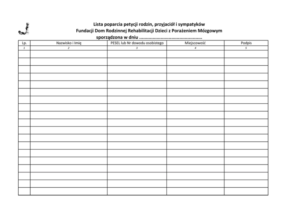 Lista poparcia petycji rodzin, przyjaciół i sympatyków Fundacji Dom Rodzinnej Rehabilitacji Dzieci z Porażeniem Mózgowym sporządzona w dniu ............................................... Lp. Nazwisko i Imię PESEL lub Nr dowodu osobistego Miejscowość Podpis 1 2 3 4 5