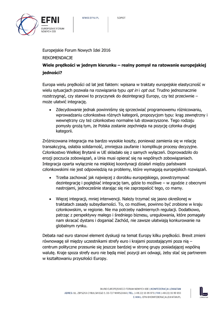 Europejskie Forum Nowych Idei 2016 REKOMENDACJE Wiele prędkości w jednym kierunku – realny pomysł na ratowanie europejskiej jedności? Europa wielu prędkości od lat jest faktem: wpisana w traktaty europejskie elastyczność w wielu sytuacjach pozwala na rozwiązania typu opt in i opt out. Trudno jednoznacznie rozstrzygnąć, czy stanowi to przyczynek do dezintegracji Europy, czy też przeciwnie – może ułatwić integrację. Zdecydowanie jednak powinniśmy się sprzeciwiać programowemu różnicowaniu, wprowadzaniu członkostwa różnych kategorii, propozycjom typu: krąg zewnętrzny i wewnętrzny czy też członkostwo normalne lub stowarzyszone. Tego rodzaju pomysły grożą tym, że Polska zostanie zepchnięta na pozycję członka drugiej kategorii. Zróżnicowana integracja ma bardzo wysokie koszty, ponieważ zamienia się w relację transakcyjną, osłabia solidarność, zmniejsza zaufanie i komplikuje procesy decyzyjne. Członkostwo Wielkiej Brytanii w UE składało się z samych wyłączeń. Doprowadziło do erozji poczucia zobowiązań, a Unia musi opierać się na wspólnych zobowiązaniach. Integracja oparta wyłącznie na miękkiej koordynacji działań między państwami członkowskimi nie jest odpowiedzią na problemy, które wymagają europejskich rozwiązań. Trzeba zachować jak najwięcej z dorobku europejskiego, powstrzymywać dezintegrację i pogłębiać integrację tam, gdzie to możliwe – w zgodzie z obecnymi nastrojami, jednocześnie starając się nie zaprzepaścić tego, co mamy. Więcej integracji, mniej interwencji. Należy trzymać się jasno określonej w traktatach zasady subsydiarności. To, co możliwe, powinno być zrobione w kraju członkowskim, w regionie. Nie ma potrzeby nadmiernych regulacji. Dodatkowo, patrząc z perspektywy małego i średniego biznesu, uregulowania, które pomagały nam skracać dystans i doganiać Zachód, nie zawsze ułatwiają konkurowanie na globalnym rynku. Debata nad euro stanowi element dyskusji na temat Europy kilku prędkości. Brexit zmieni równowagę sił między uczestnikami strefy euro i krajami pozostającymi poza nią – centrum polityczne przesunie się jeszcze bardziej w stronę grupy posiadającej wspólną walutę. Kraje spoza strefy euro nie będą mieć pozycji ani odwagi, żeby stać się partnerem w kształtowaniu przyszłości Europy. Przyjęcie wspólnej waluty będzie przesądzało o możliwości działania polskich firm na unijnych rynkach w kolejnych latach. Dlatego też powinniśmy podejmować dyskusję na temat uczestnictwa w strefie euro. Państwa członkowskie oddaliły się od siebie. W mniejszym stopniu zajmują się realizacją wspólnych projektów, a w większym – zarządzaniem kryzysem. Szukają rozwiązań w podgrupach, okopują się na swych stanowiskach, mają przeciwstawne pomysły na to, co należy zrobić. Powinniśmy skoncentrować się na tym, co nas łączy, i przyspieszyć te projekty, które stawiają czoła współczesnym zagrożeniom wspólnym dla nas wszystkich (np. terroryzmowi), a których realizacja da obywatelom większe poczucie bezpieczeństwa. Współzależność, globalizacja i europeizacja przyniosły fantastyczny postęp, ale również wiele nowych problemów, wobec których nie mamy narzędzi. Trzeba zająć się wypracowaniem nowych narzędzi, przystąpić do tworzenia Europy zdolnej do odpowiedzi na nowe pytania. Należy też znaleźć formułę na wciągnięcie do tego procesu społeczeństwa obywatelskiego. Europa powinna zrobić większy użytek z doświadczenia wolności rozumianej jako przejęcie kontroli nad własnym losem. Dziś wolność niejednokrotnie kojarzy się źle: z nieograniczonymi swobodami obyczajowymi i zachłannością wielkich korporacji. Powinniśmy spróbować przywrócić wolności dobre imię i – aby rozpędzić Europę na nowo – zdefiniować ją jako projekt wolności.